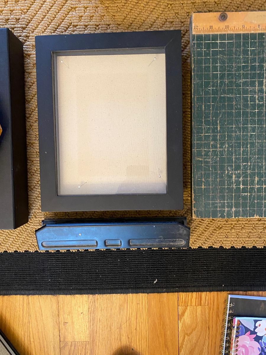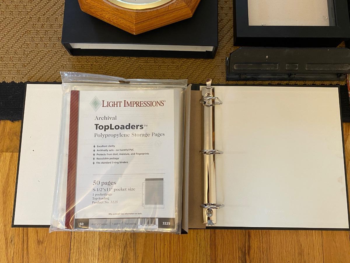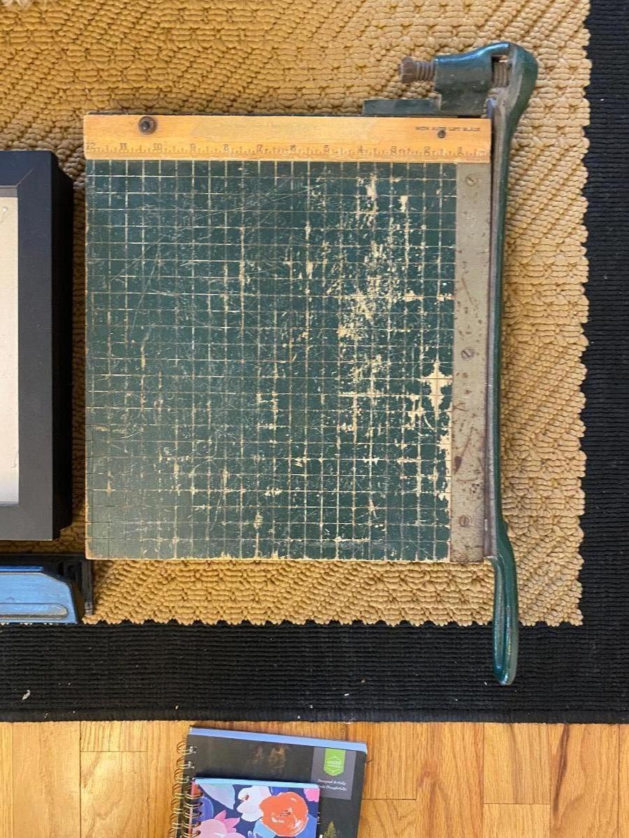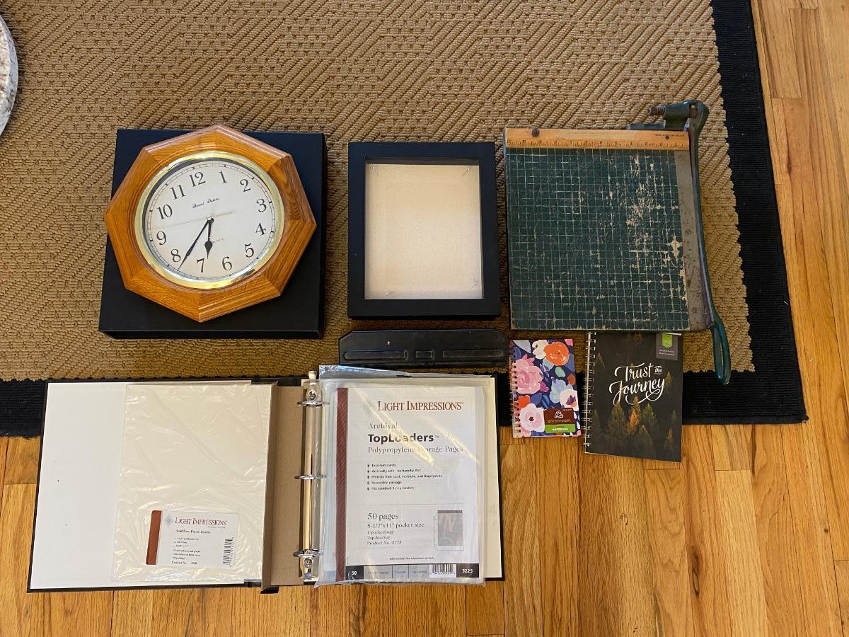 HEAVY PAPER CUTTER, 3-HOLE PUNCH, NOTEBOOKS, WALL CLOCK, SHADOW BOX AND MORE