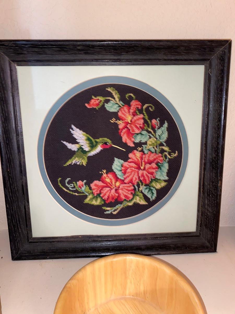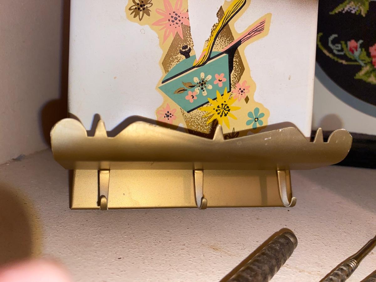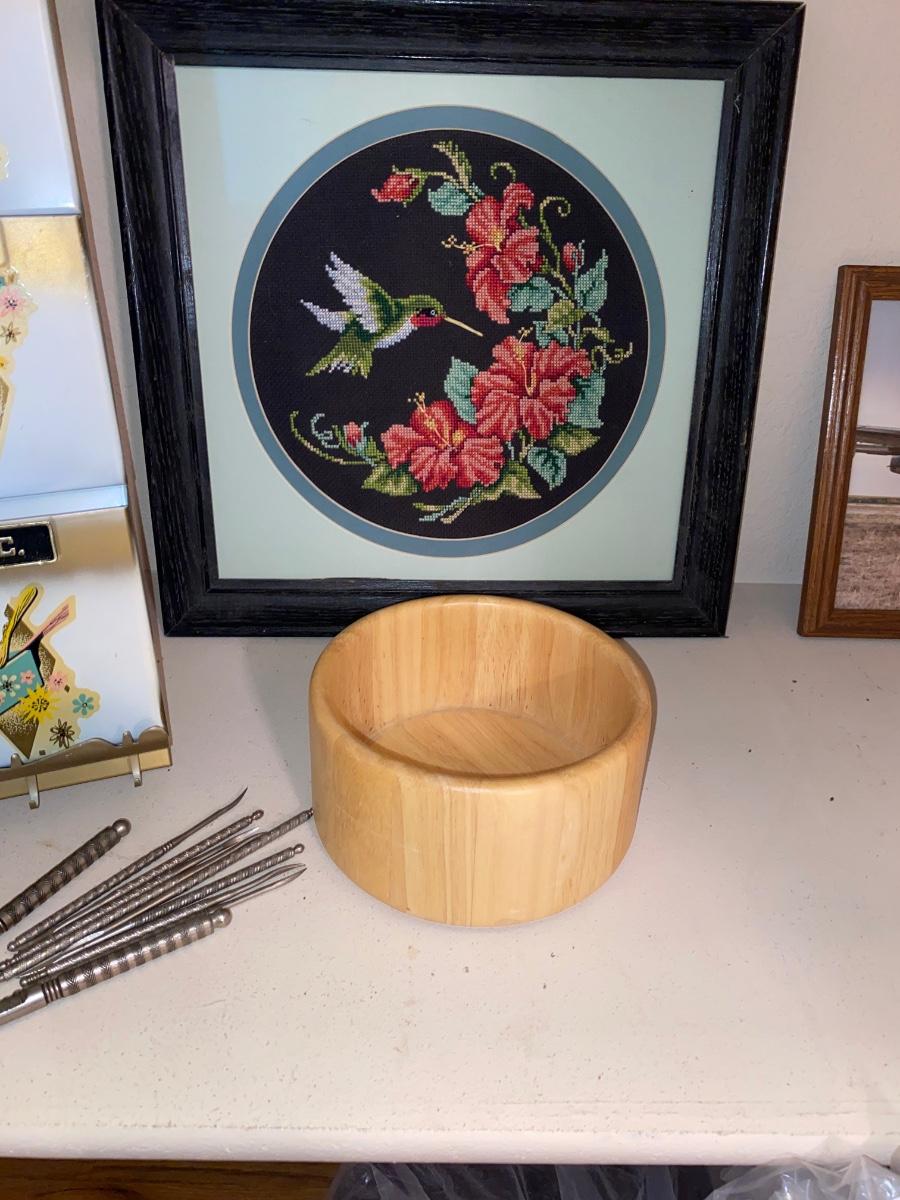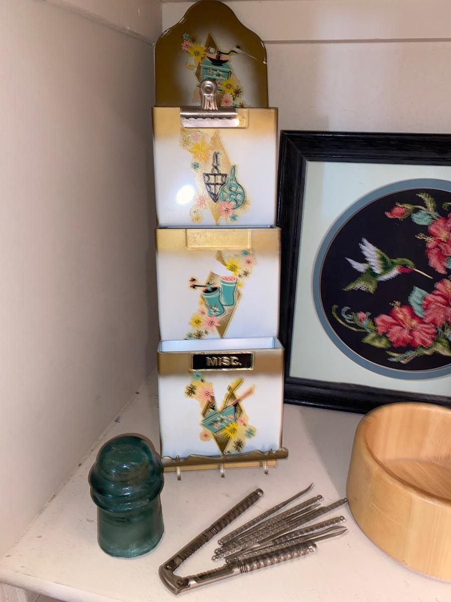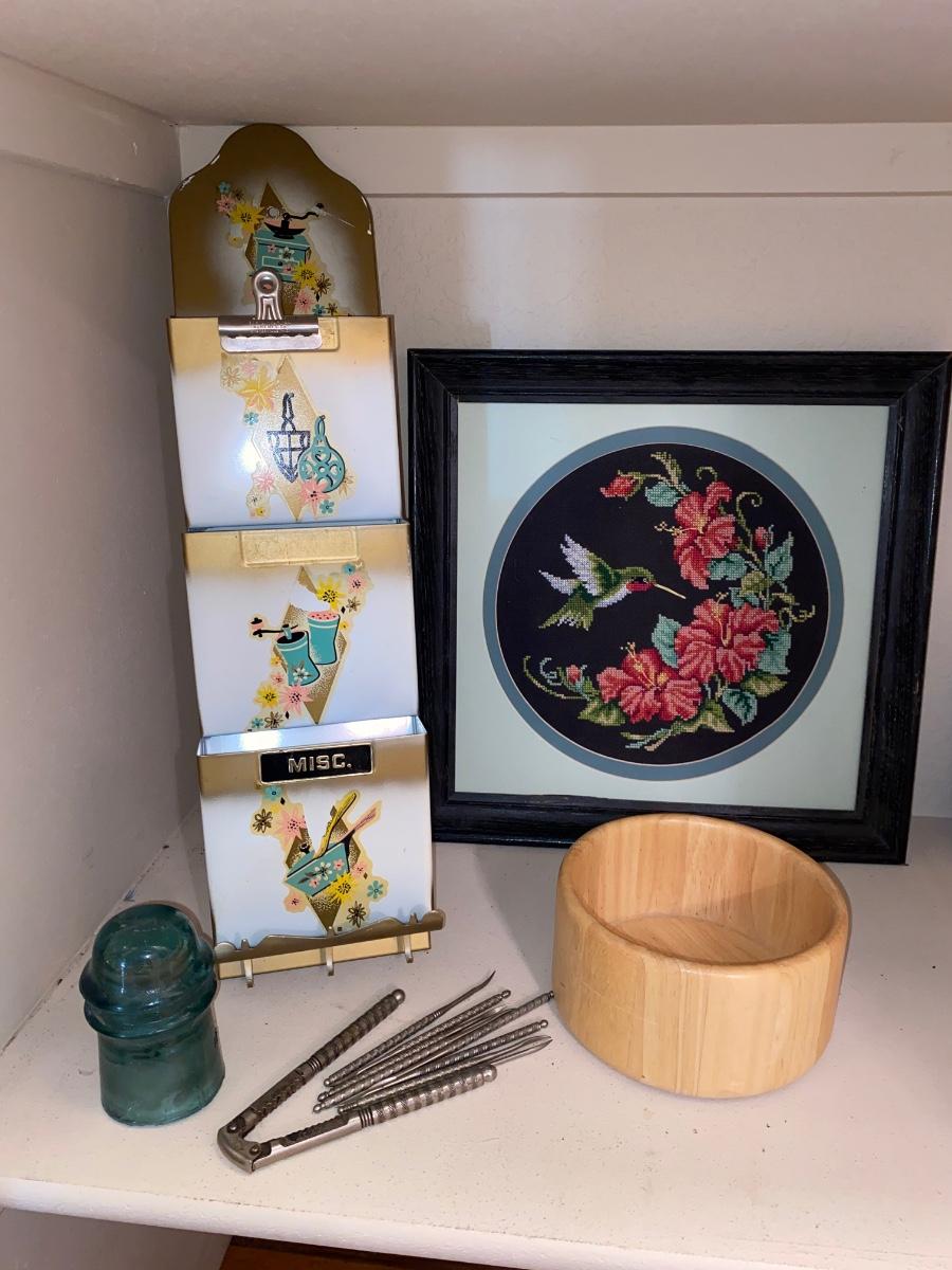 NIFTY OLD TIN WALL ORGANIZER, WOODEN BOWL, NUT TOOLS, INSULATOR, AND NEEDLEPOINT PICTURE,
