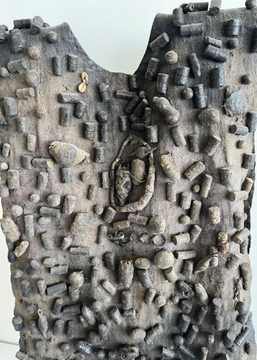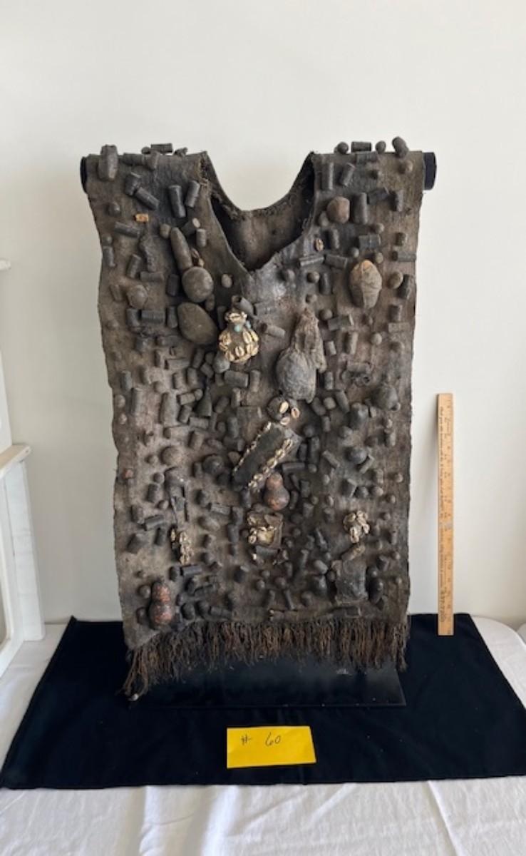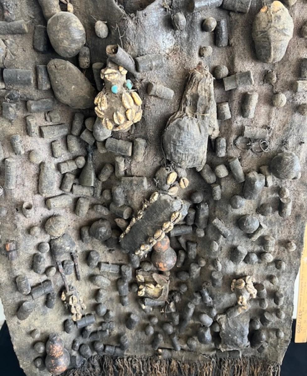 Nigerian Yoruba culture tunic, 20th century, woven raffia with fetishes. 18 x 34