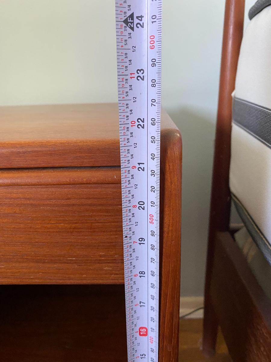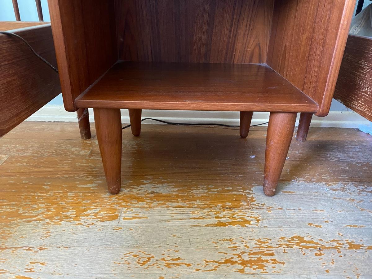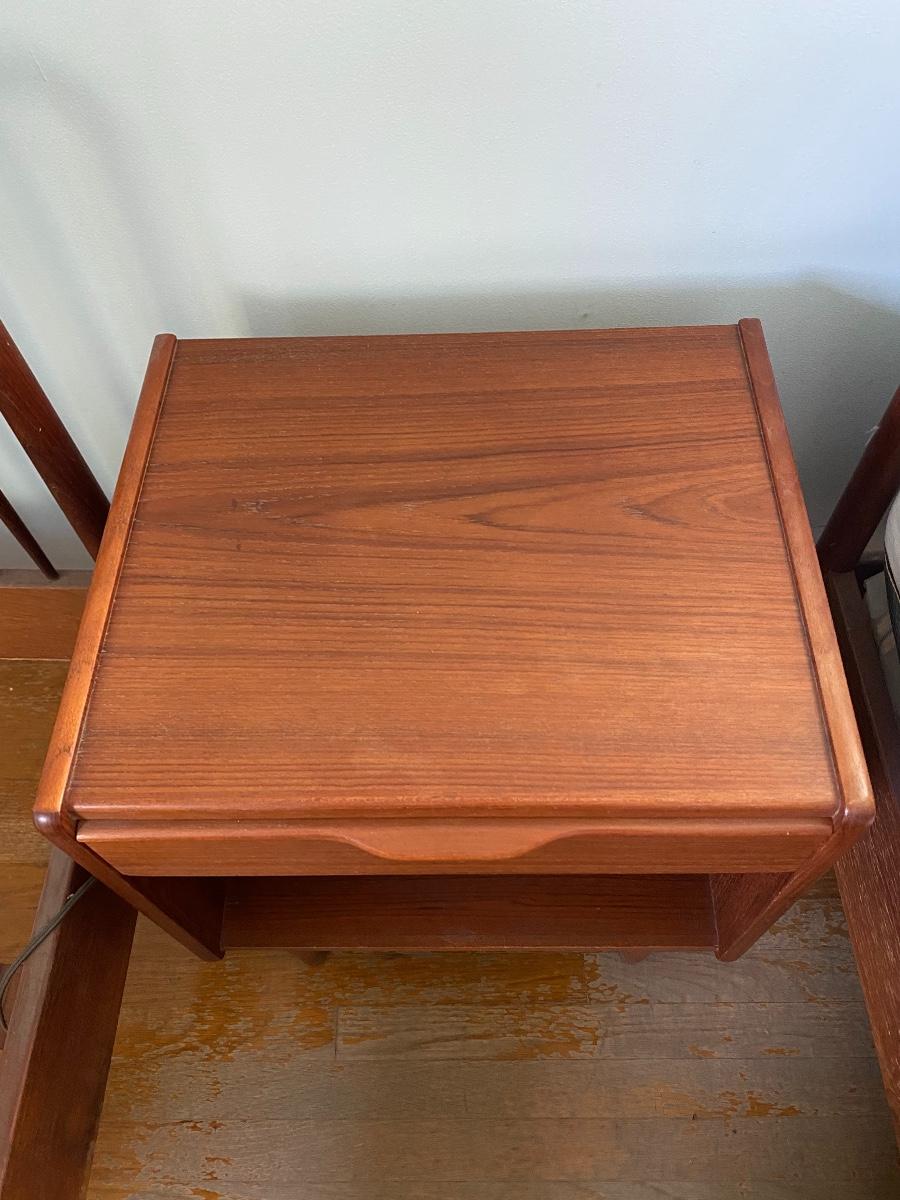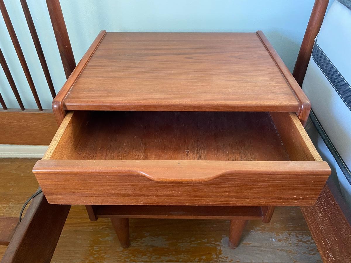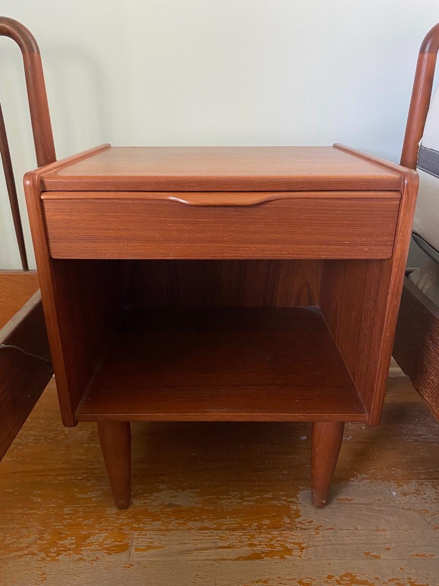 Mid century modern night stand side table. Has single drawer in the front. In good vintage condition, minimal signs of age or wear. Measures about 15"x18" and 22" tall. No maker name found.