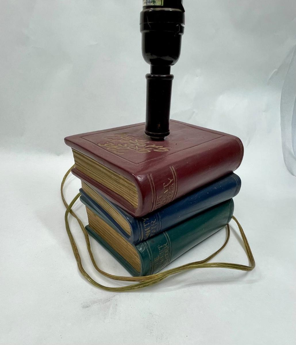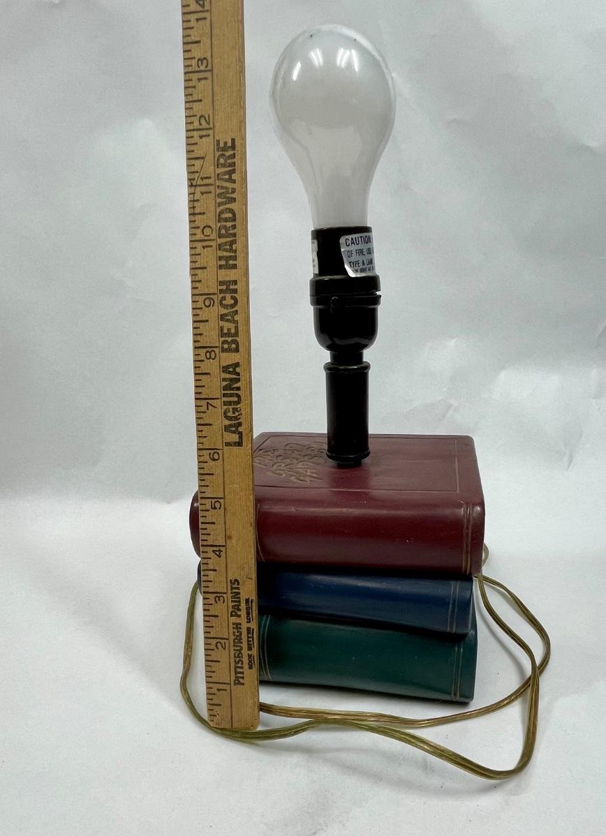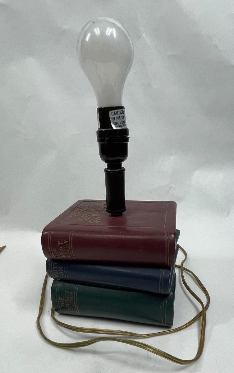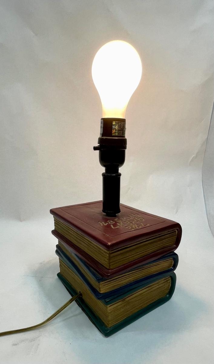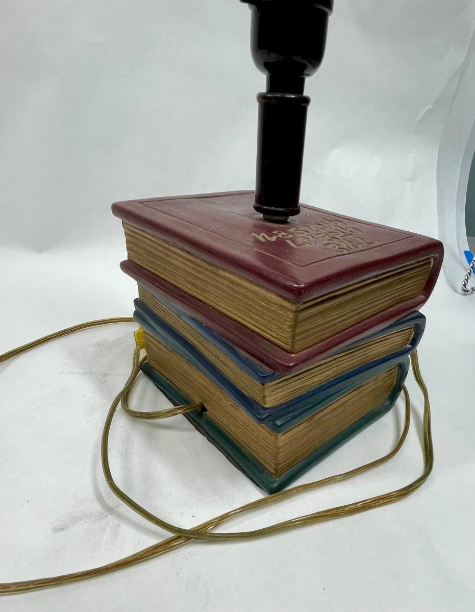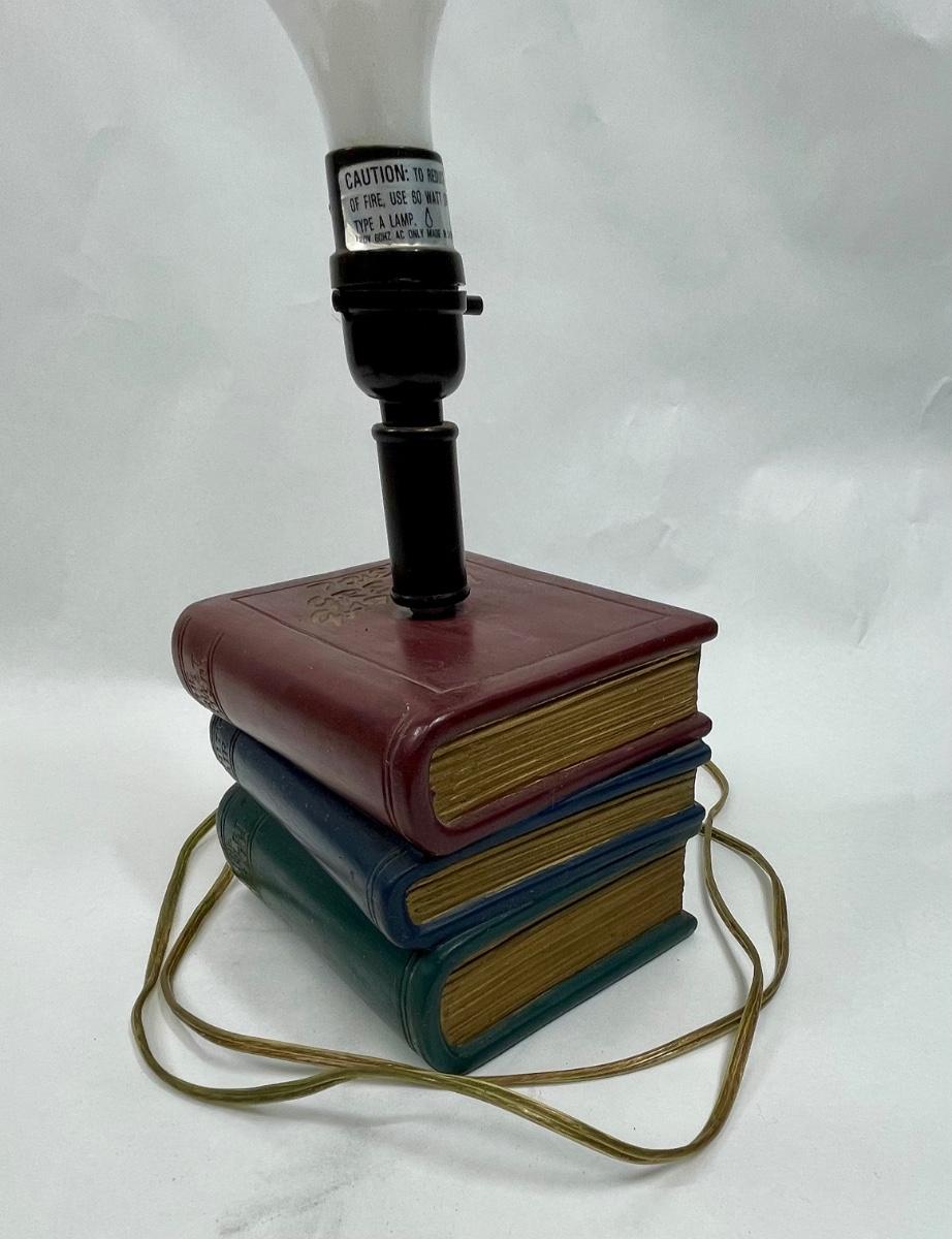 Whimsical lamp, base is a stack of books. Does not include a lampshade. Tested, works as expected.