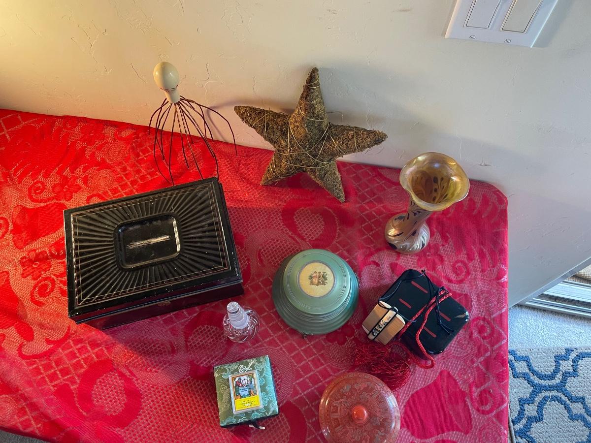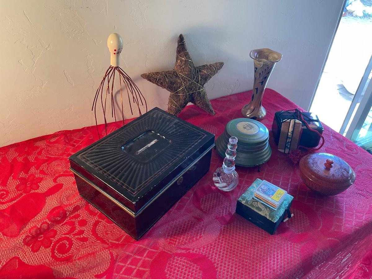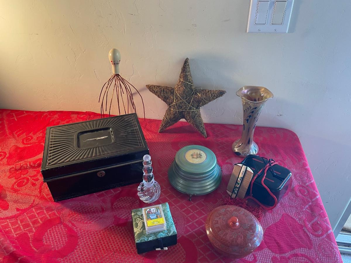 An assortment of accessories you might find on your grandmothers nightstand including a vintage music box in working condition, a tin box, a head scratcher, a glass hand blown vase, an asian comb, an asian bowl with lid and more. All in good condition