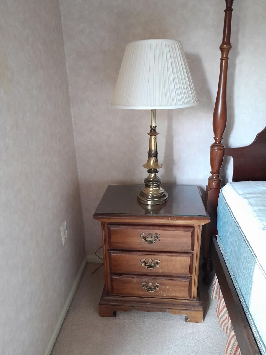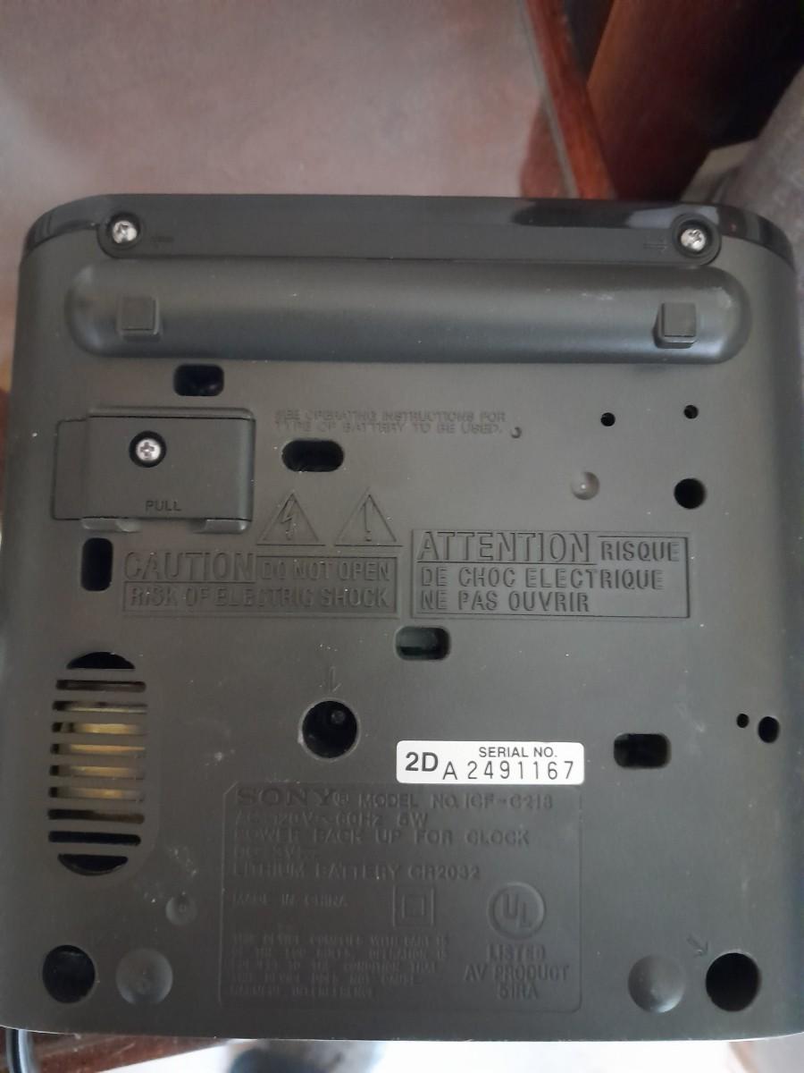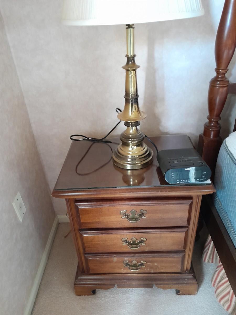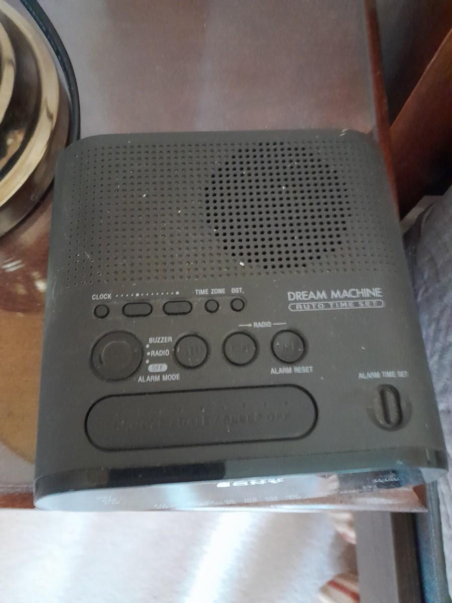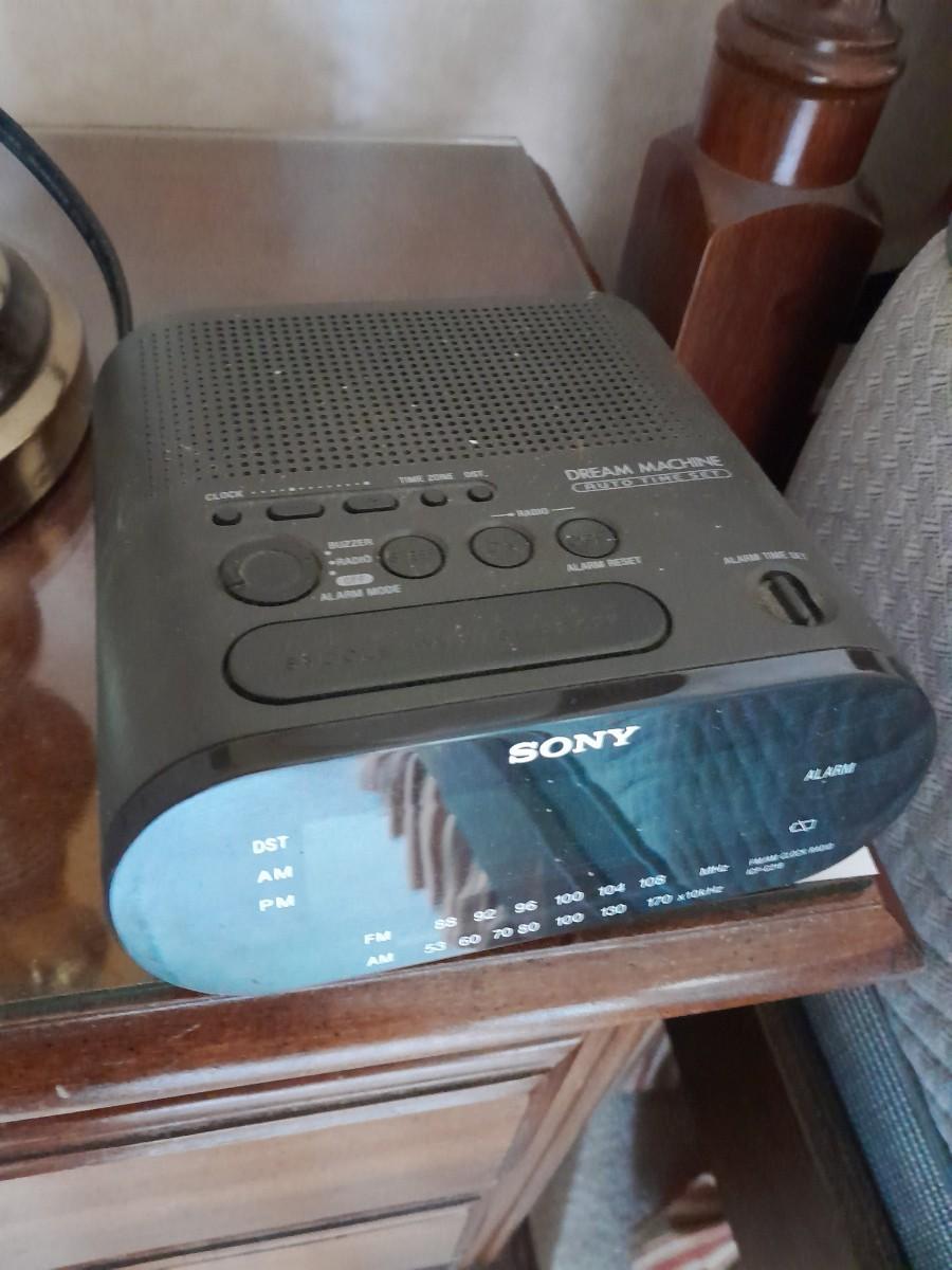 NIGHTSTAND 25" X 22" X 15" WITH A 30" TALL LAMP AND A SONY DREAM MACHINE ALARM CLOCK