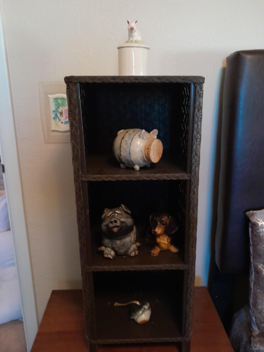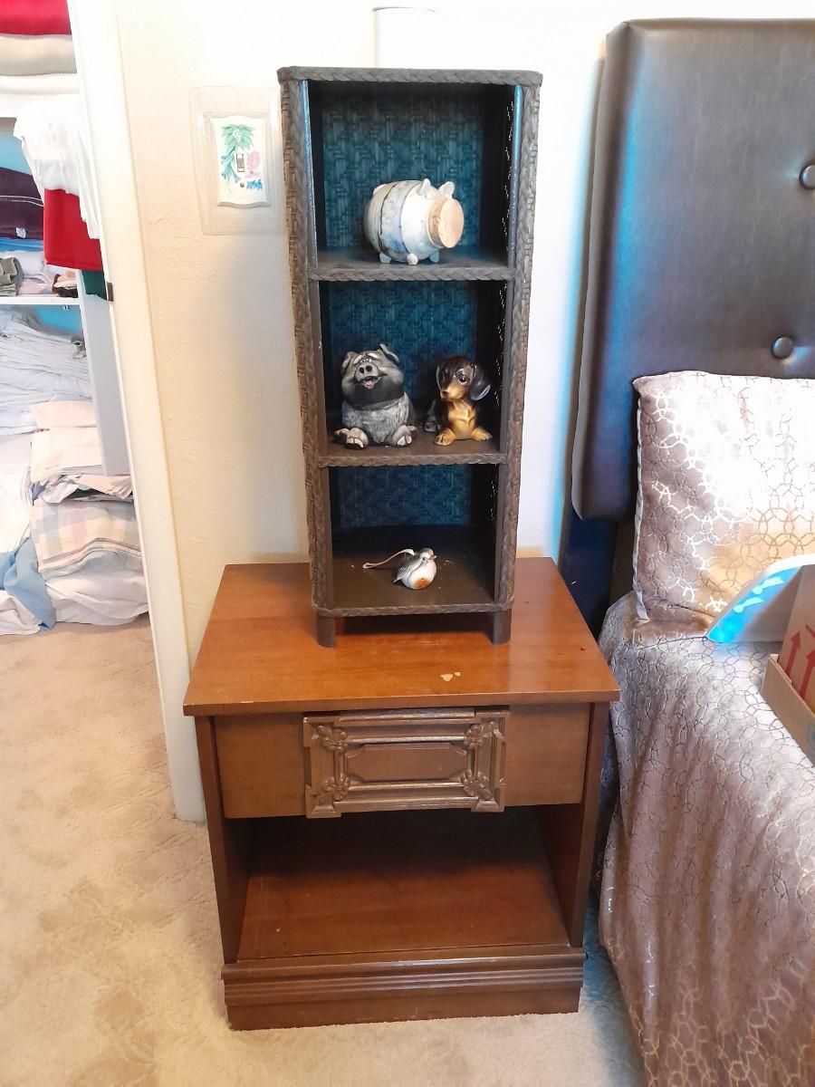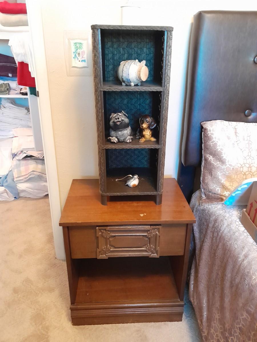 NIGHTSTAND 23.5" X 22" X 16" WITH SMALL SHELF 28" X 10" X 11" WITH DECORATIVE ANIMAL FIGURES