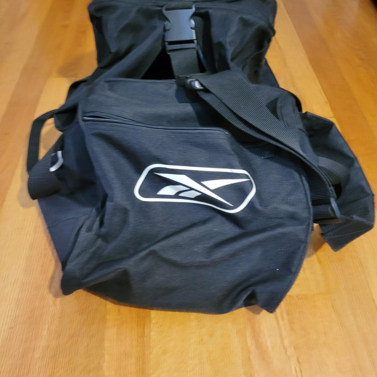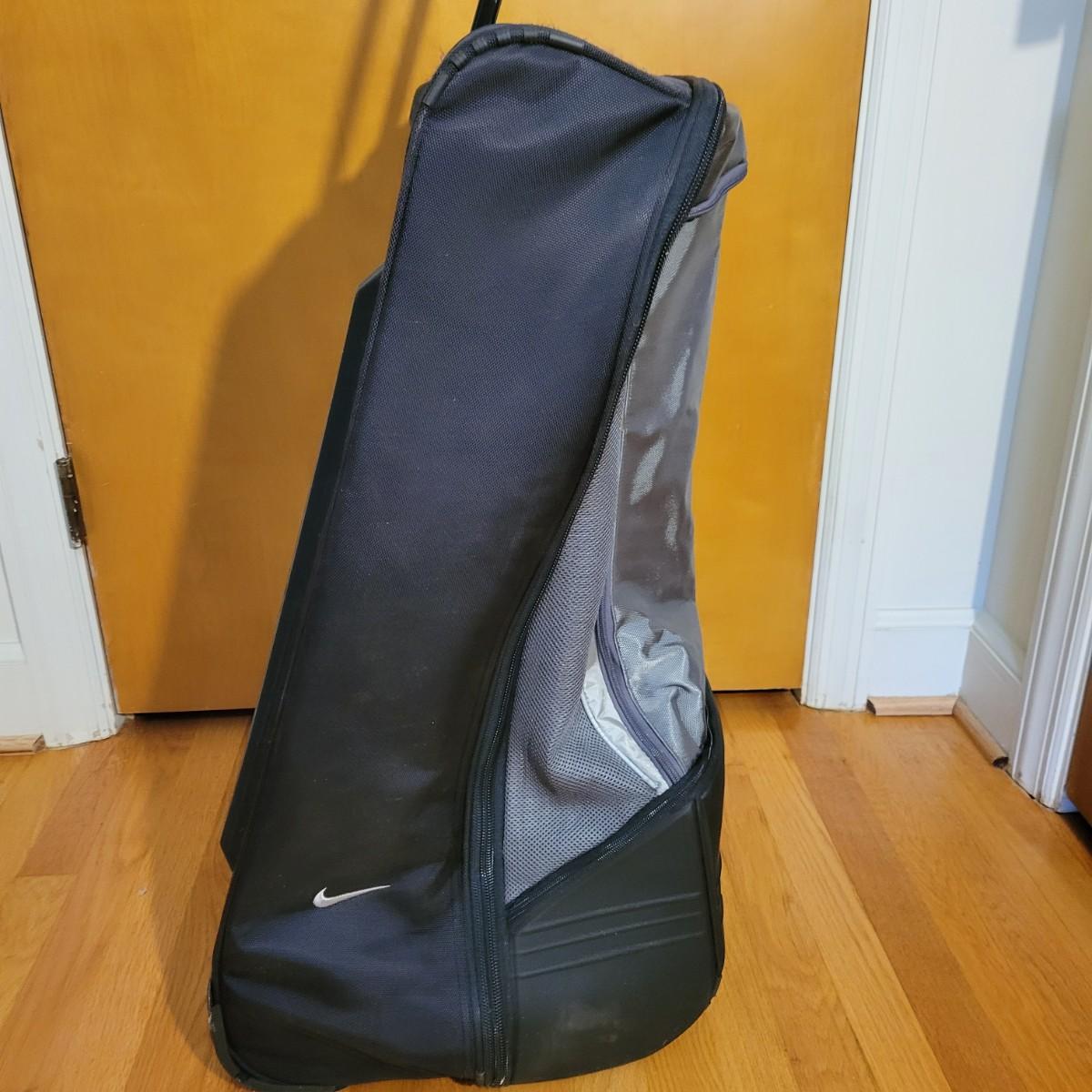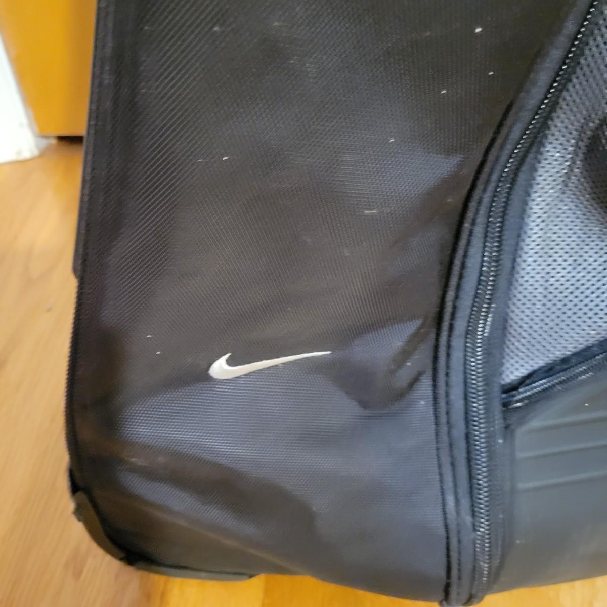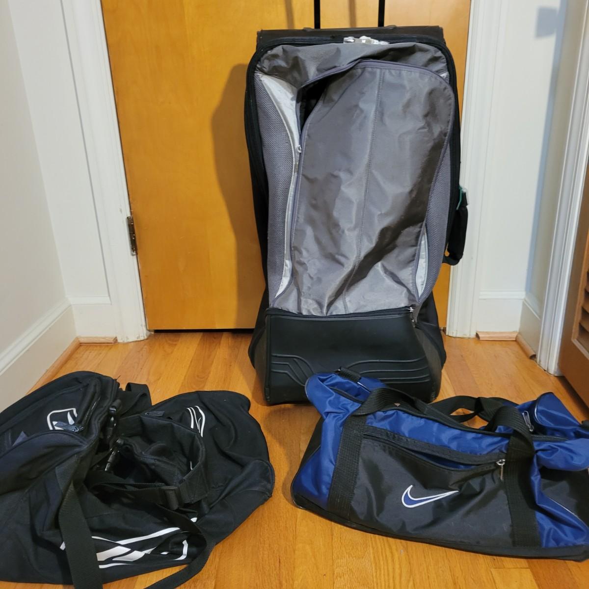 A Nike Rolling travel case and gym bags in good condition. Nike travel case does have some scratches from use. Features wheels, a rubber base and extendable handle. Measures approximately 17" x 16" x 30" Lot also includes two gym bags. One is a Nike brand bag and the other is Reebok. Local pickup only