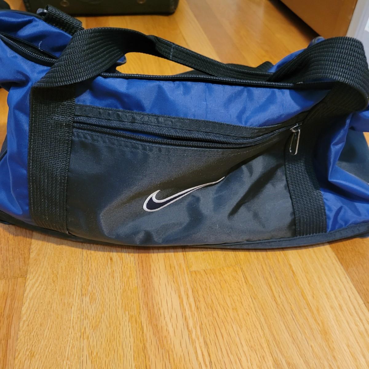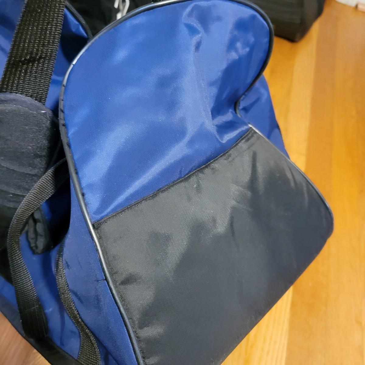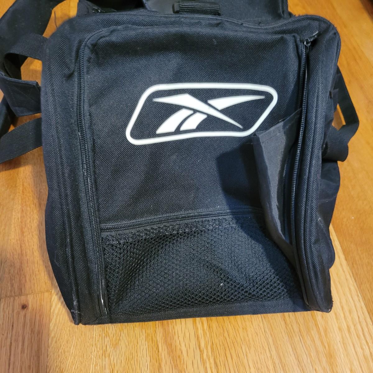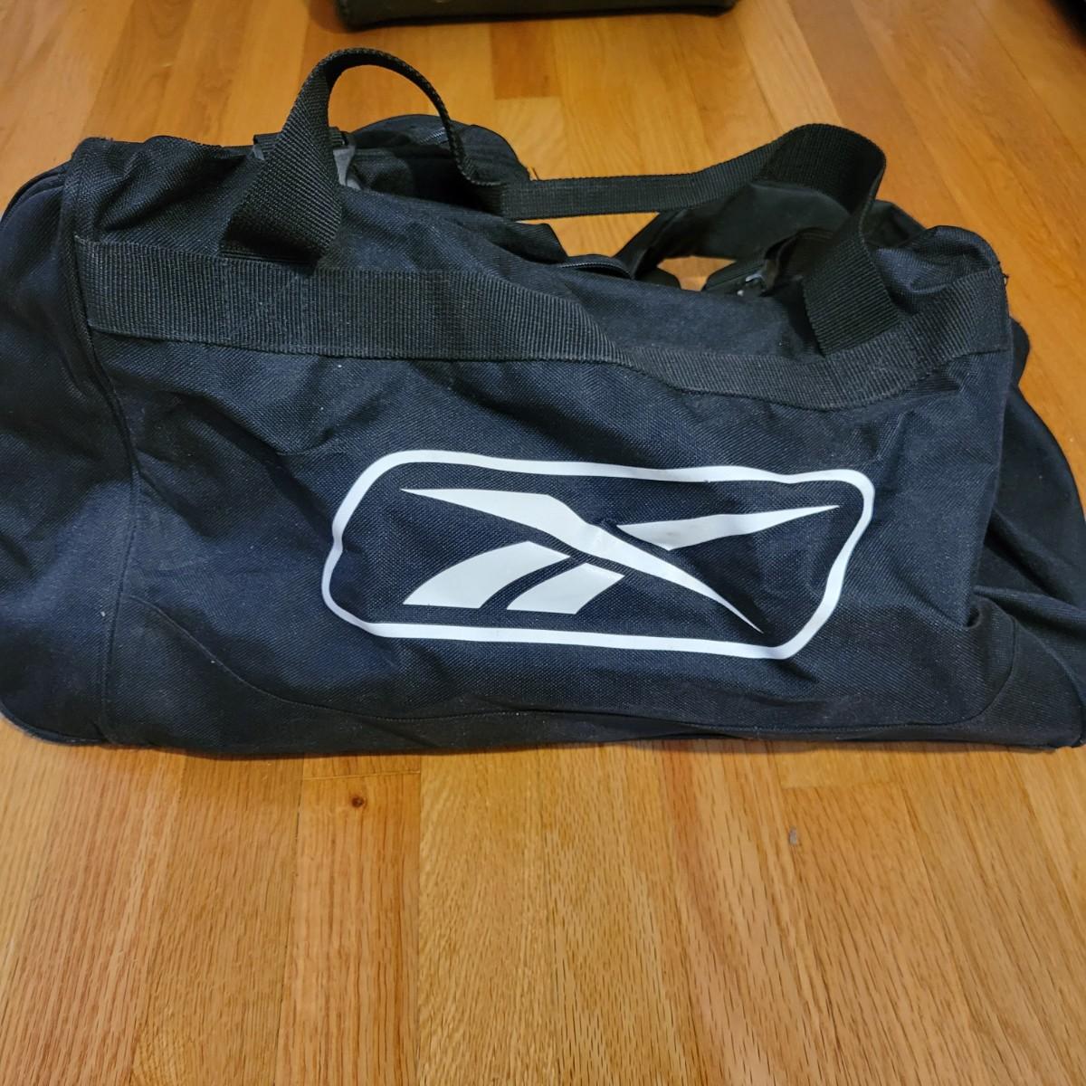 A Nike Rolling travel case and gym bags in good condition. Nike travel case does have some scratches from use. Features wheels, a rubber base and extendable handle. Measures approximately 17" x 16" x 30" Lot also includes two gym bags. One is a Nike brand bag and the other is Reebok. Local pickup only