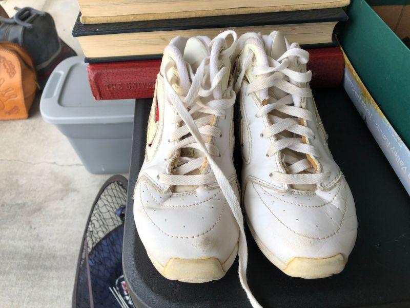 White with red shoes, small tear on back of left upper back as shown in pic. Good condition.