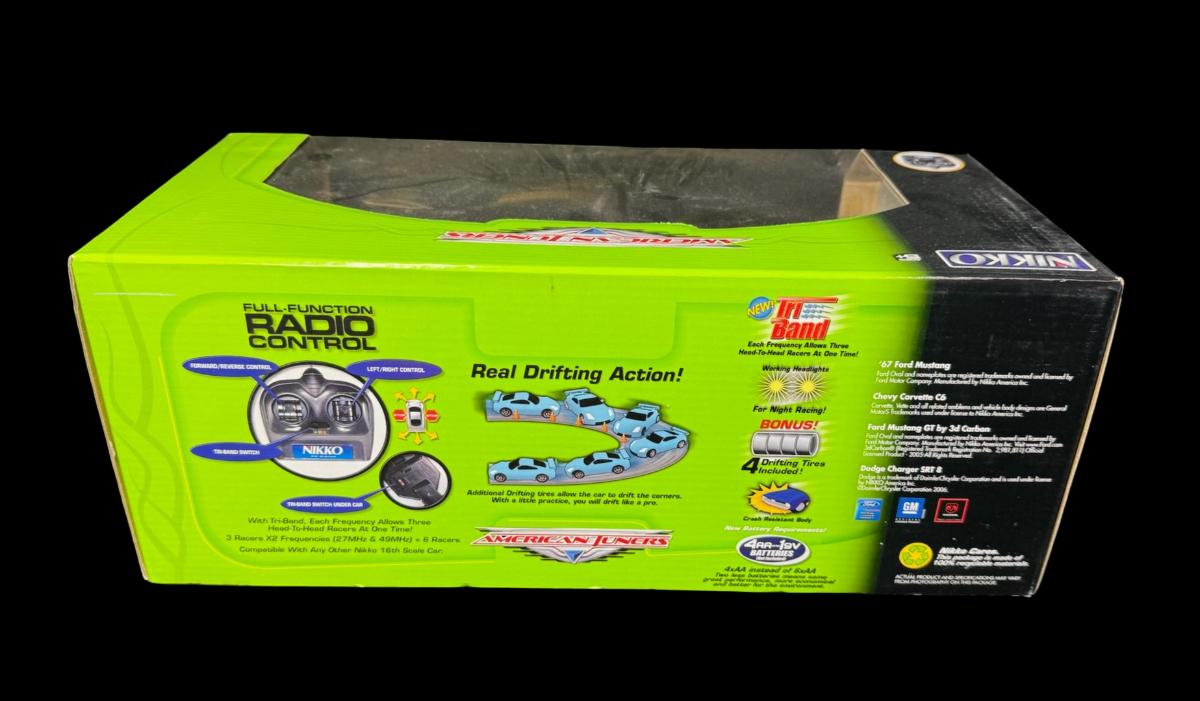 Part of the “American Tuners” series. This is a full function RC vehicle in 1:16 scale. It has working headlights for night racing. Bonus drifting tires are included. Requires AA batteries. Includes original box. Pre-auction estimate: $50-$100.