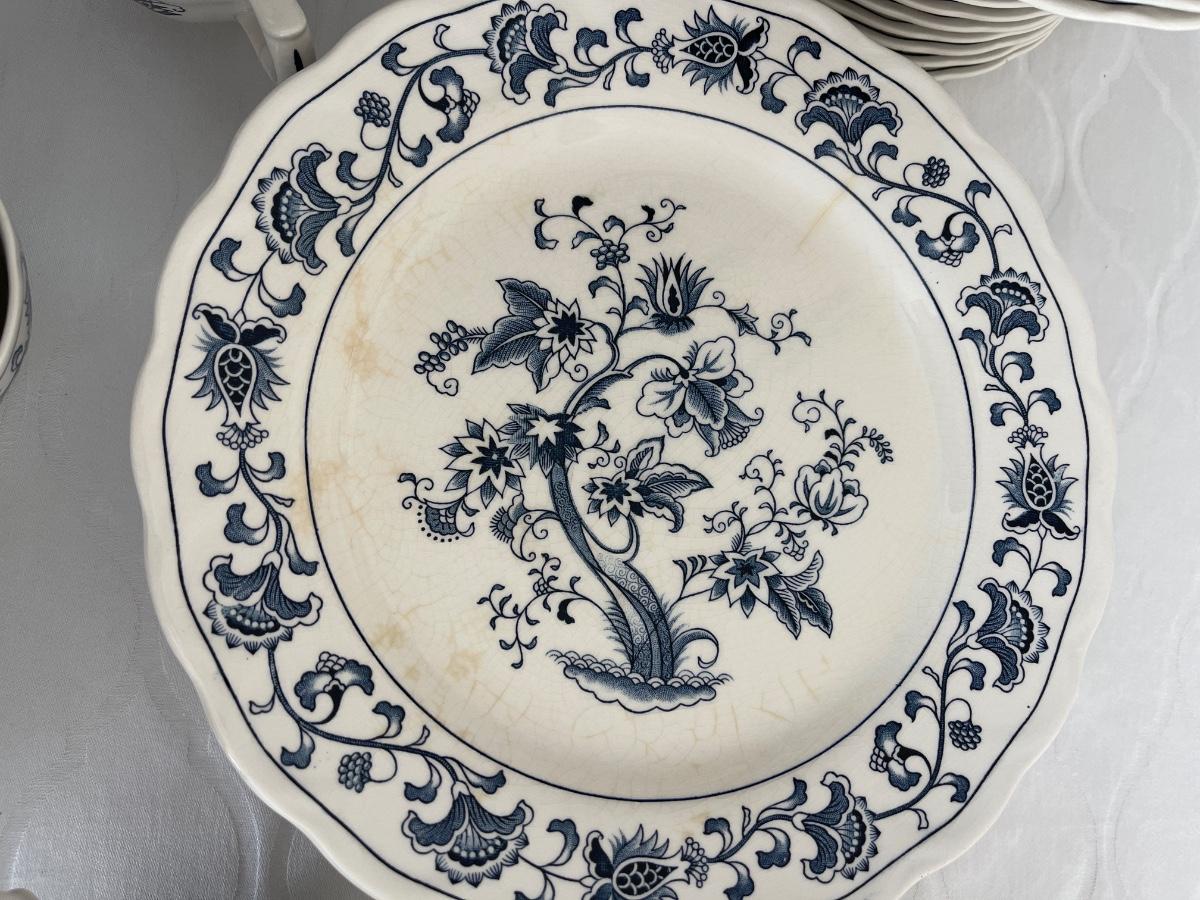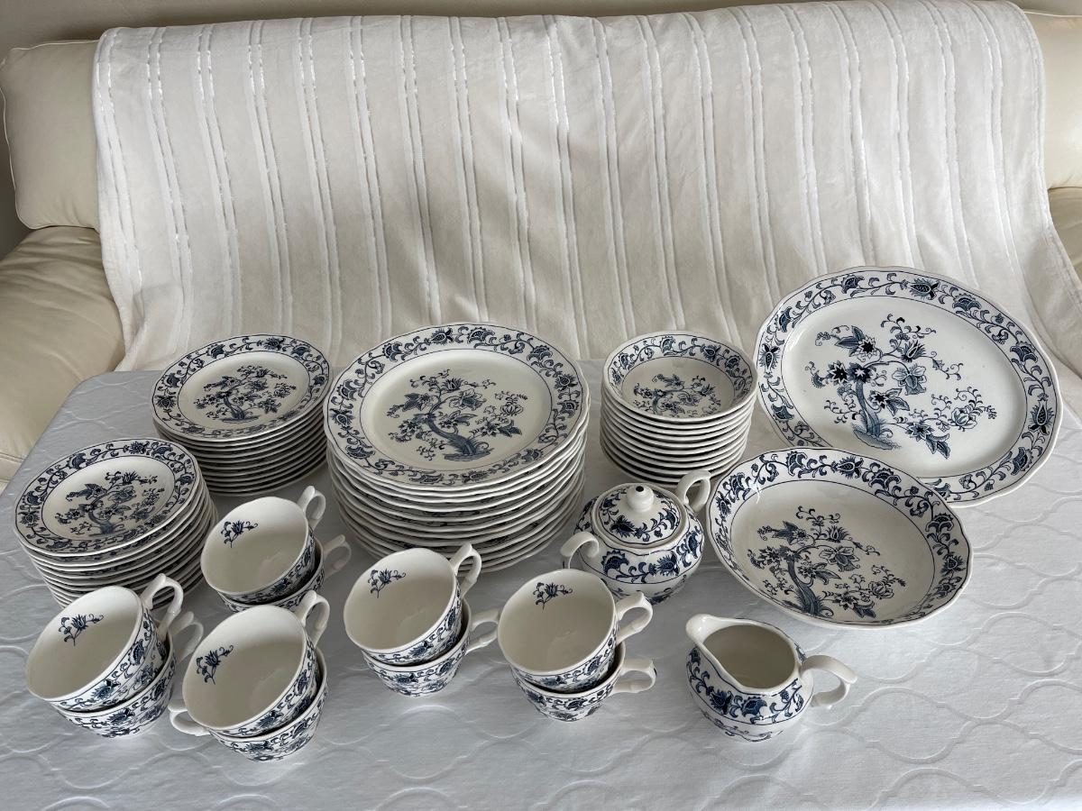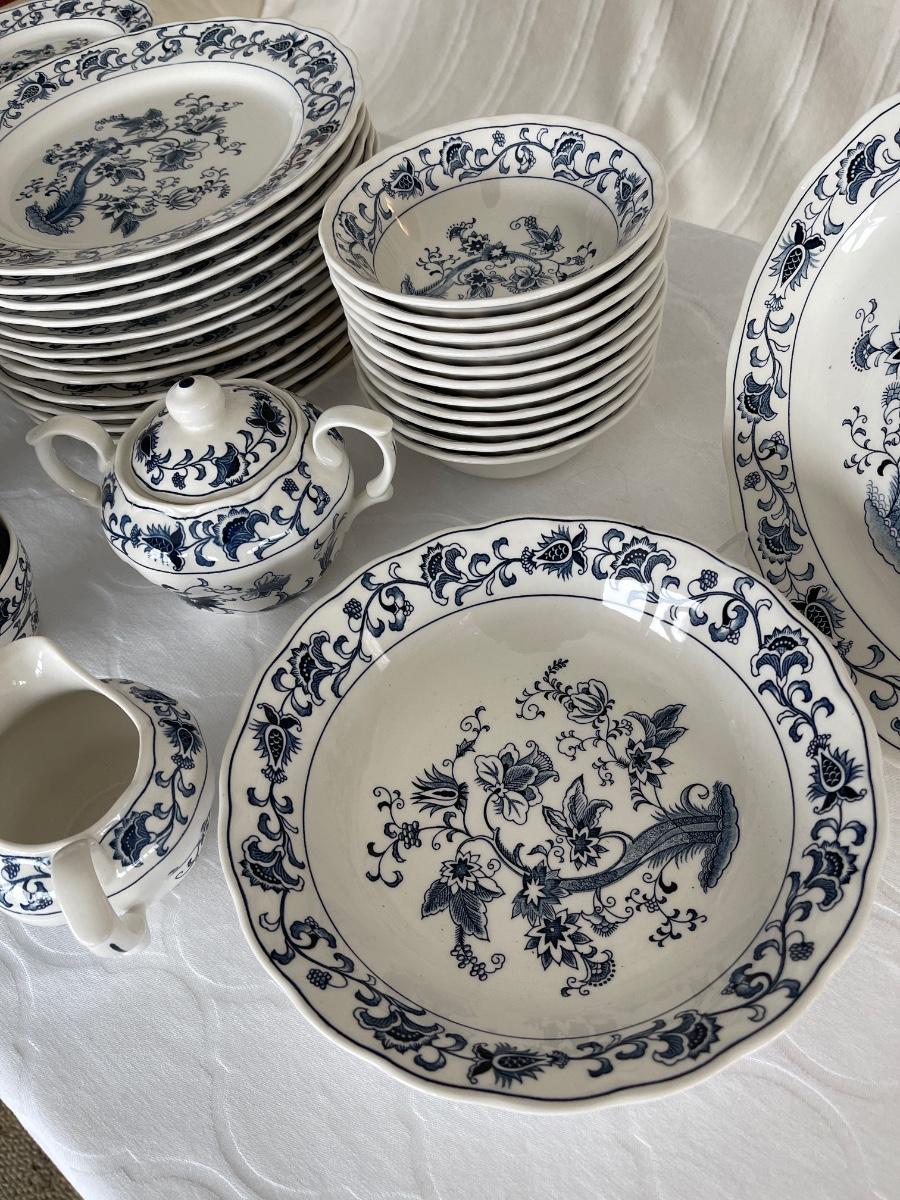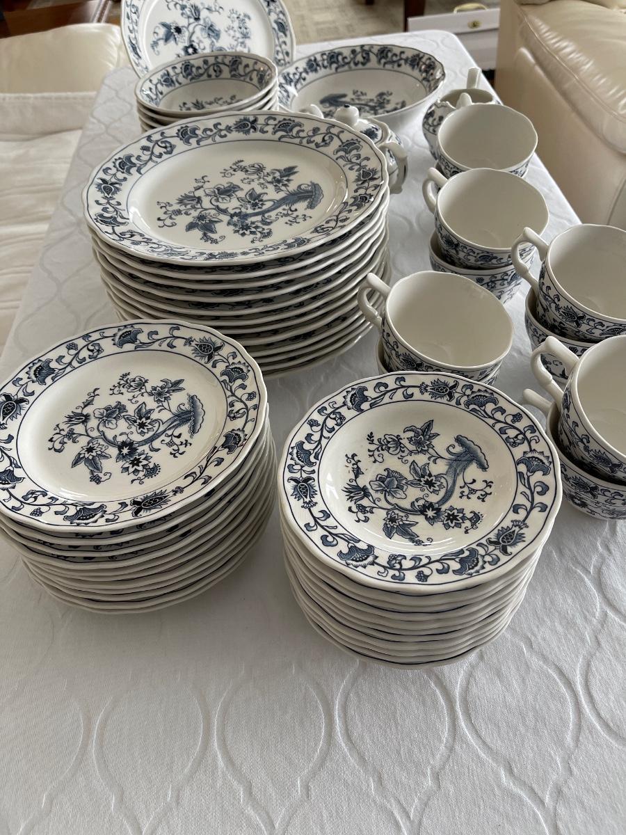 12 plates, 11 salad plates, 11 coffee plate,12 cups, 11 cereal bowls, 1 platter, 1 serving bowl, 1 sugar and 1 creamer some. Stained and some chipped but majority of set in great condition.