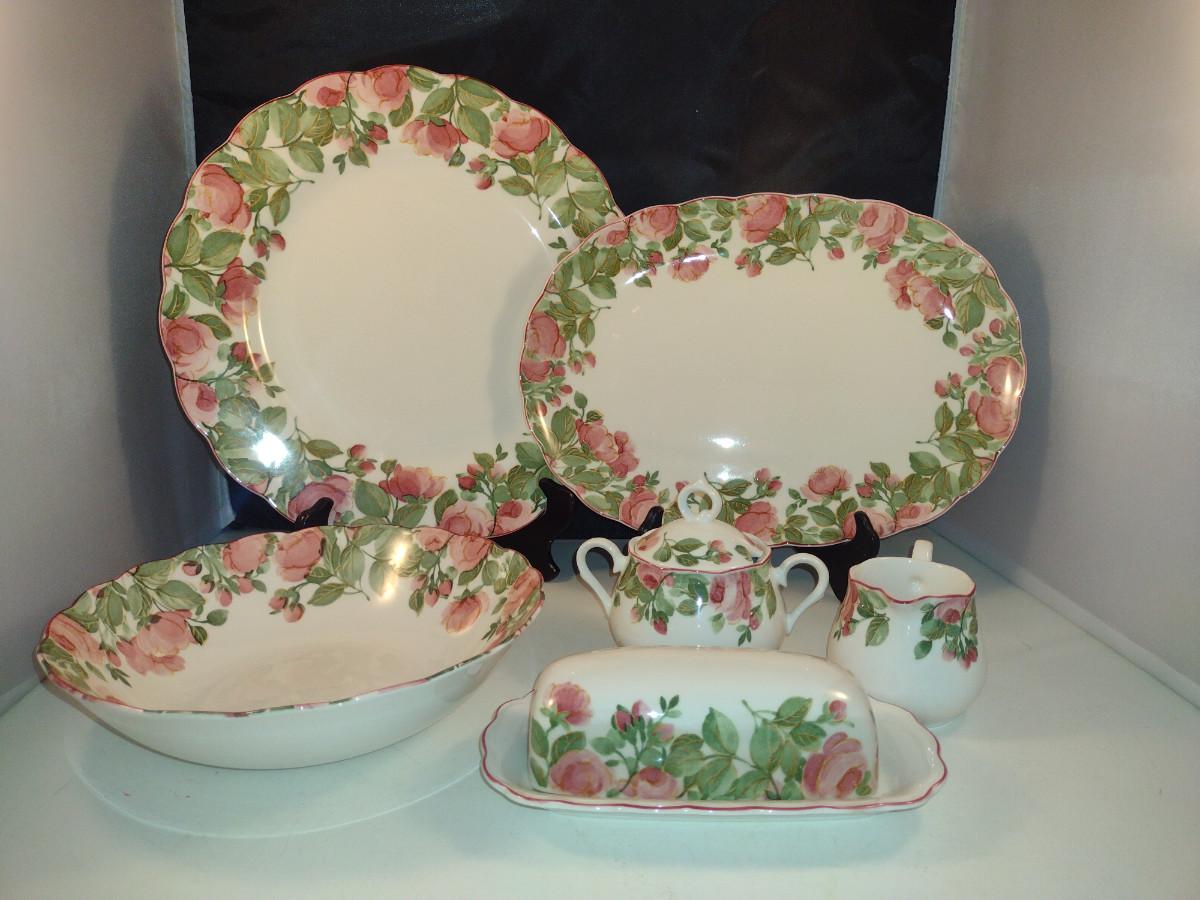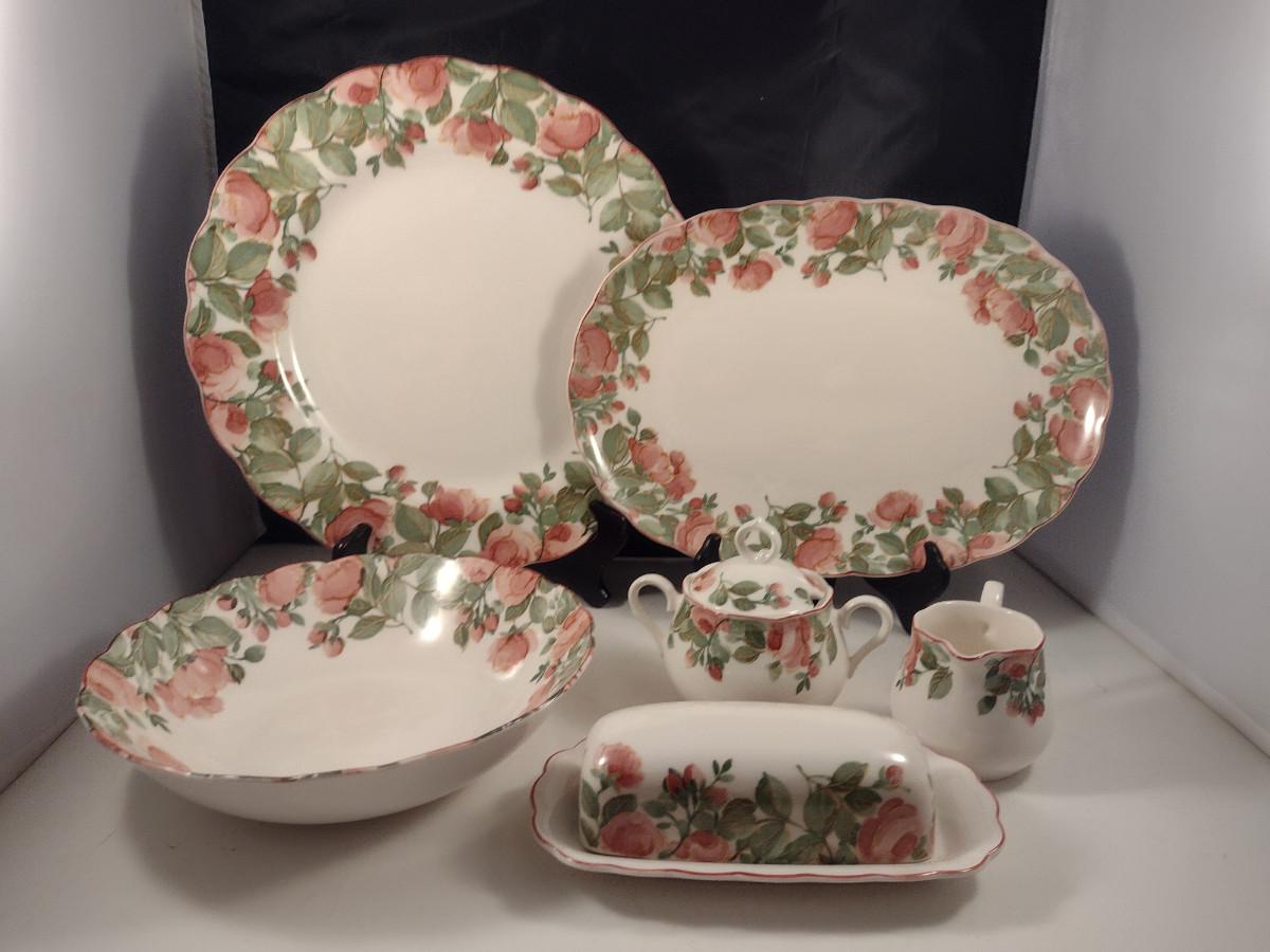 Nikko Tableware Pink Floral Dinnerware- Approx 55 Pieces. All in used condition- expect occasional chip, crack, or discoloration. Dinner plate (10 3/4")- 14, salad bowl (6 5/8")- 7, soup bowl (9 1/4")- 4, luncheon plate (8")- 6, cup- 10, saucer- 8, creamer, sugar, covered butter dish, oval platter (13")- 1, round platter (12 1/4")- 1, vegetable bowl (9 1/4")- 1.