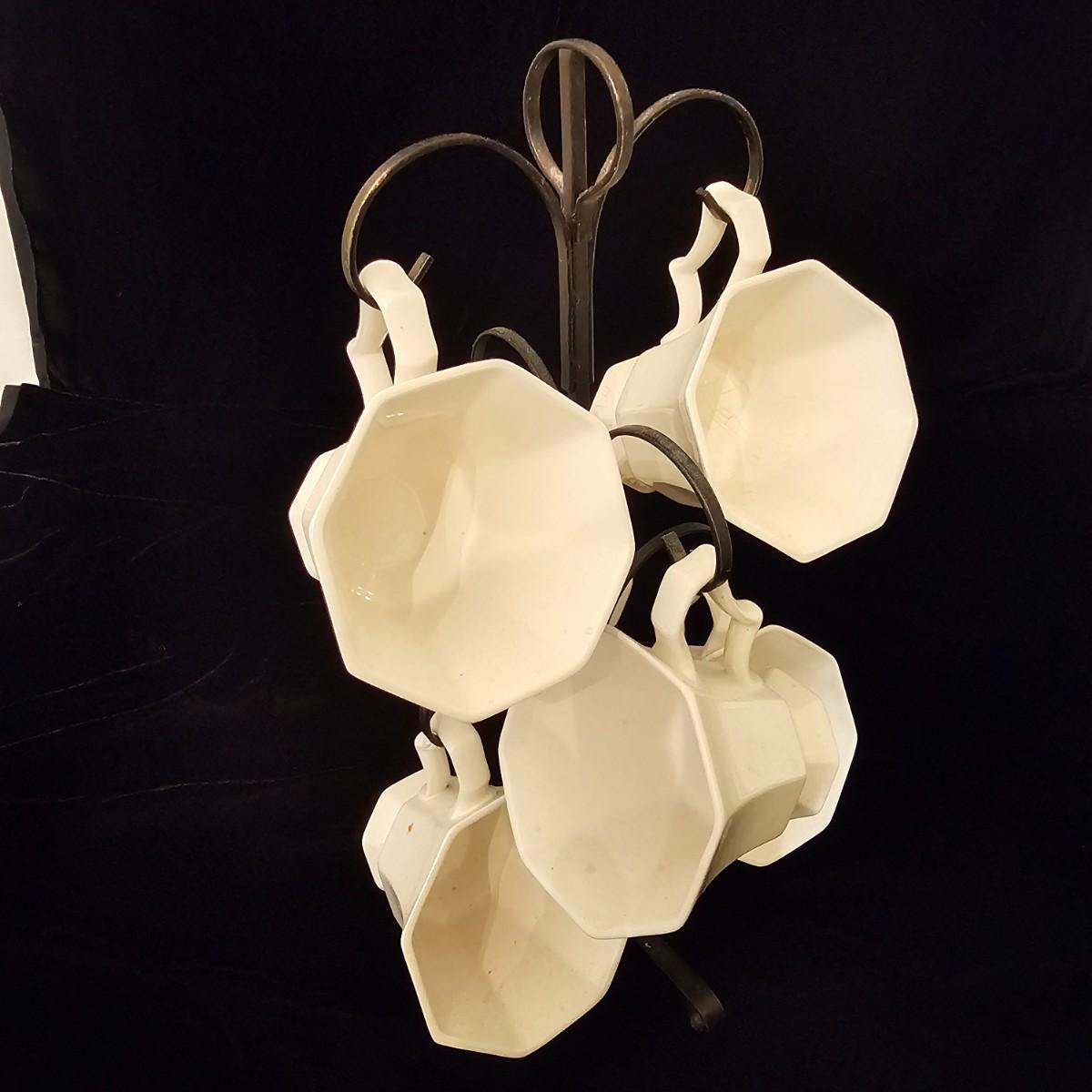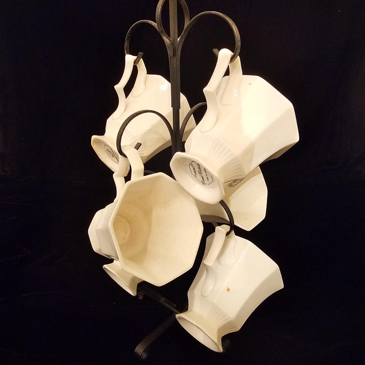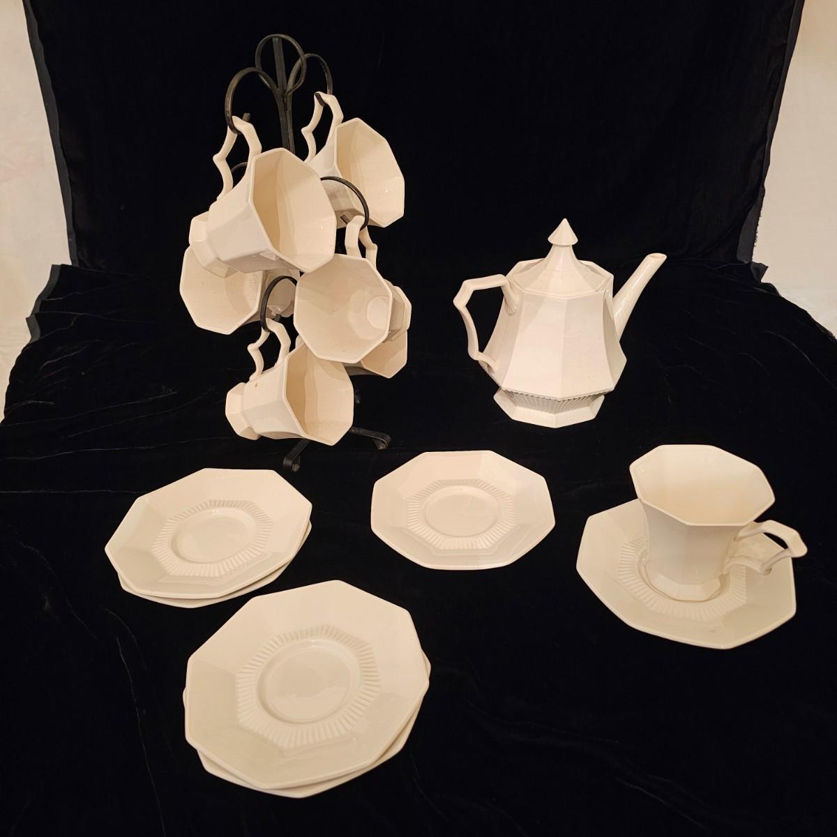 Six cups and six saucers, a teapot and a metal stand. China is by Nikko from Japan. Hexagon shaped design on all pieces. Saucers are 6"D, teapot is 5.5" x 9" x 7"H. Metal stand is 14" H. See photos for details. Shipping available.