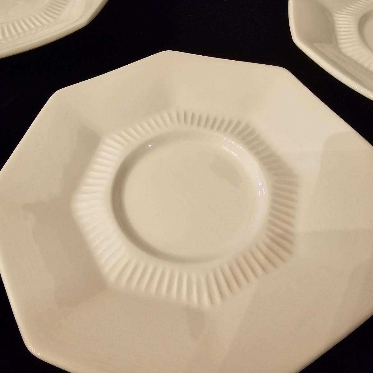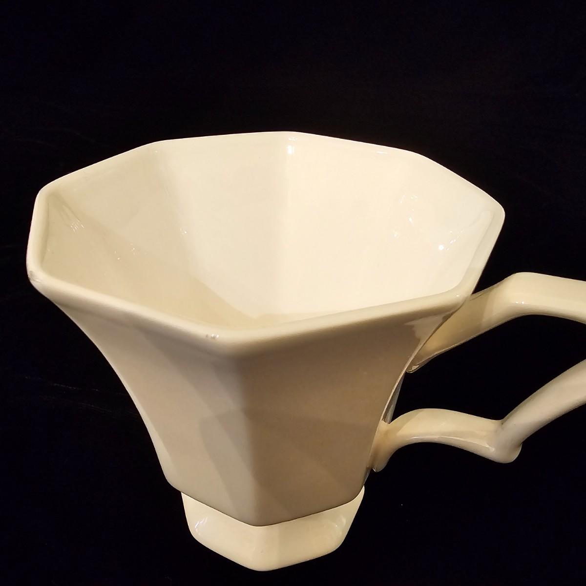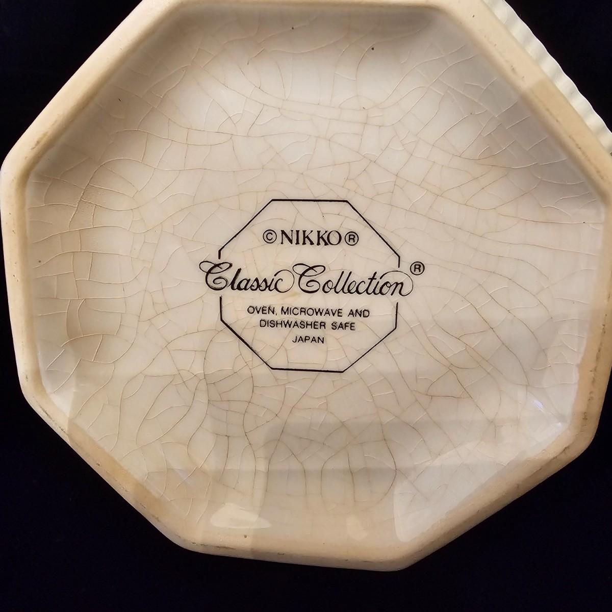 Six cups and six saucers, a teapot and a metal stand. China is by Nikko from Japan. Hexagon shaped design on all pieces. Saucers are 6"D, teapot is 5.5" x 9" x 7"H. Metal stand is 14" H. See photos for details. Shipping available.