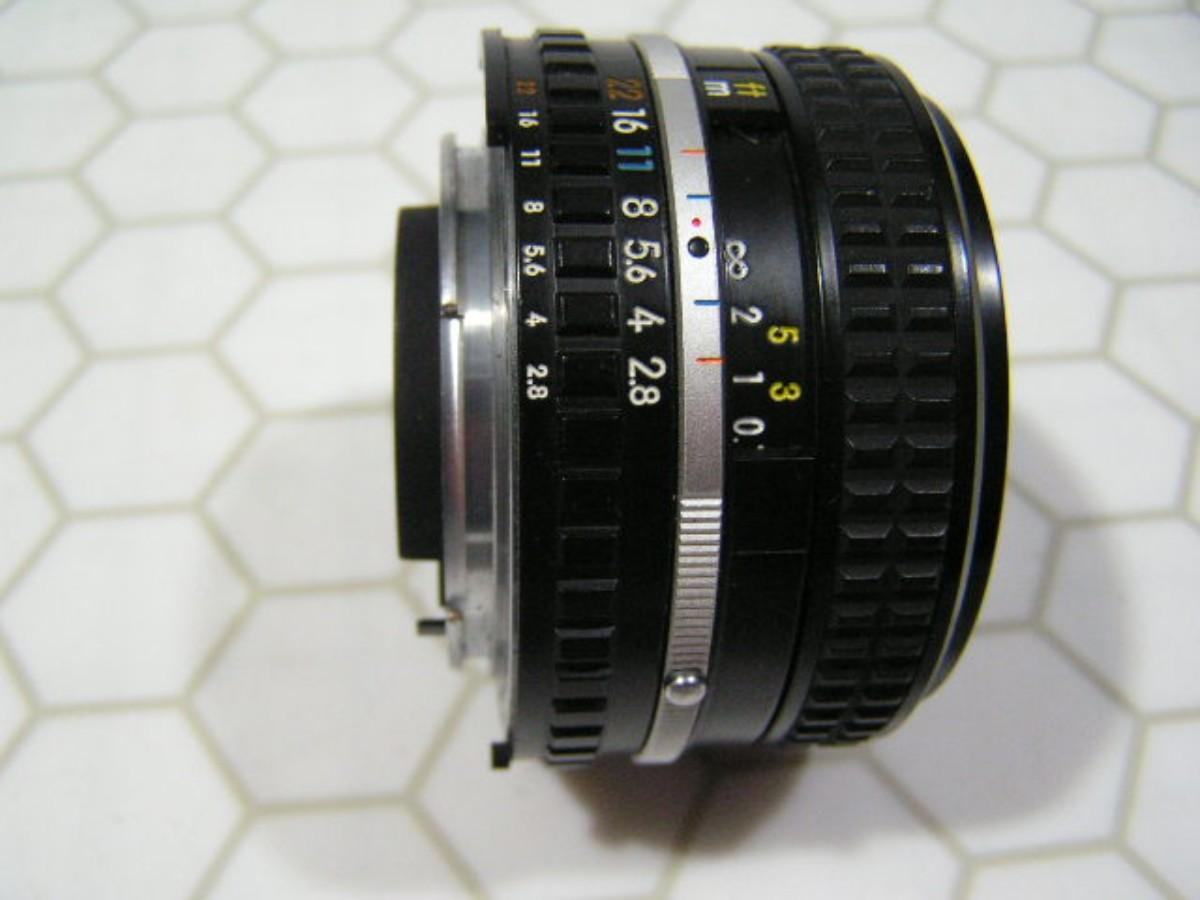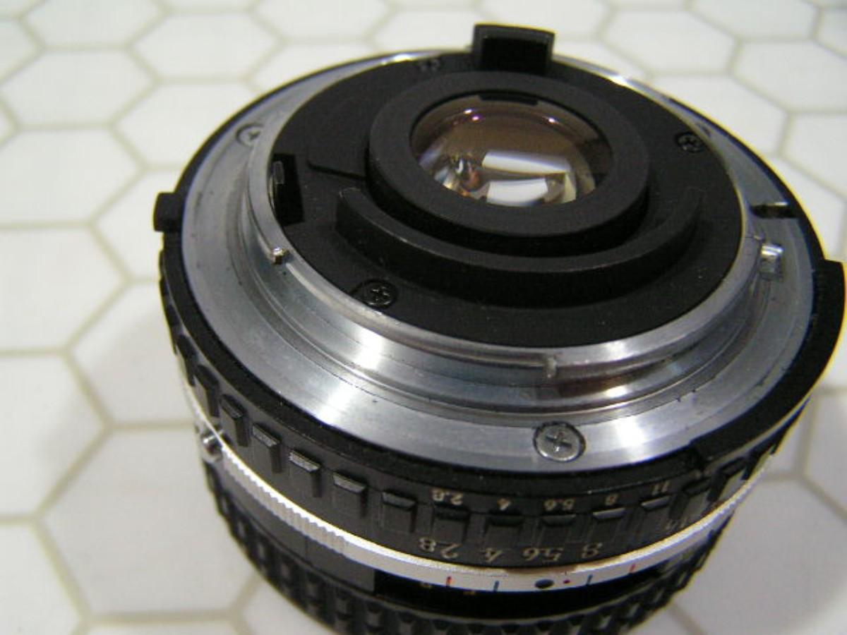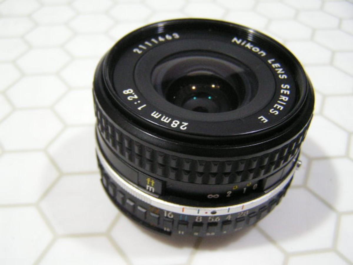 Nikon 28mm f:2.8(22) (35mm) Series 'E' AI-S (later iteration) compact wide angel lens for landscapes, interior architecture and close in photography. It will work with Nikon's better digital cameras in manual and aperture priority AE modes if you don't mind manual focusing. It is a very handy and compact lens at only 1.6” long and 5.3 ozs. This later and more desirable variant was an upgrade from the original model with it's metal 'F' lens mount, matte chrome metal barrel, focus ring w/rubber grip surface & windowed DoF markings. This is still a very popular field lens today due to it's super sharp high quality multi-coated Nikon optics, inherent corner to corner sharpness, low distortion and reasonably fast speed. Glass is clean and clear, NO scratches, NO fog, NO fungus. Includes both lens caps & a cap keeper. Japan. SN:2111463 Super clean/near mint condition.