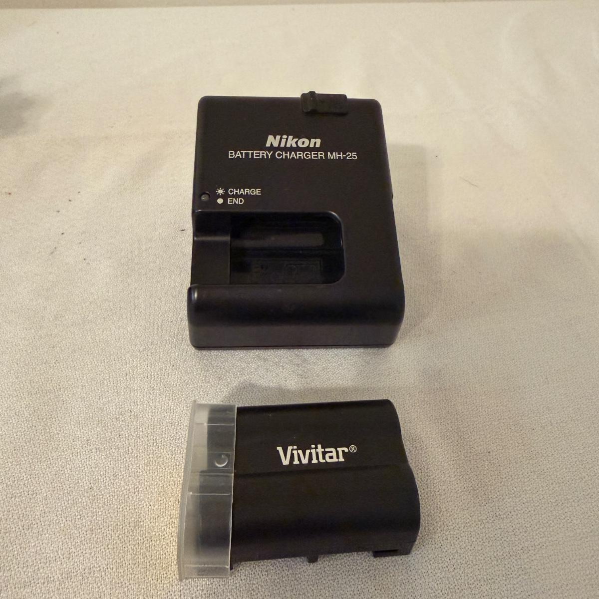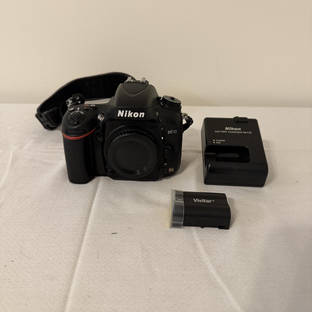 Lot includes a Nikon D610 camera with charger and two batteries.