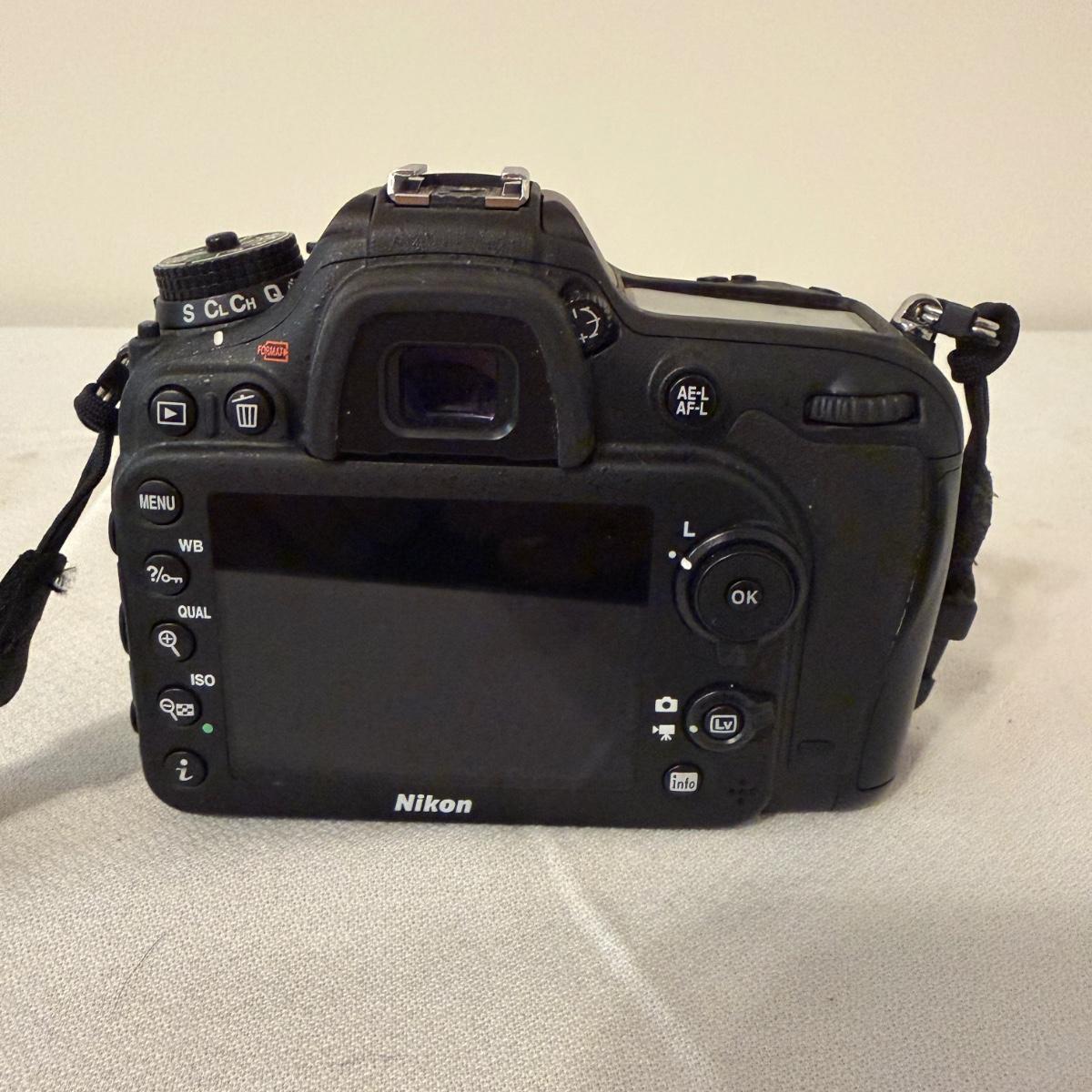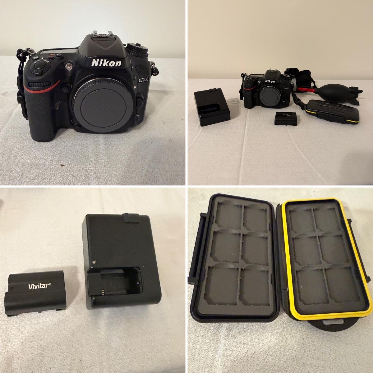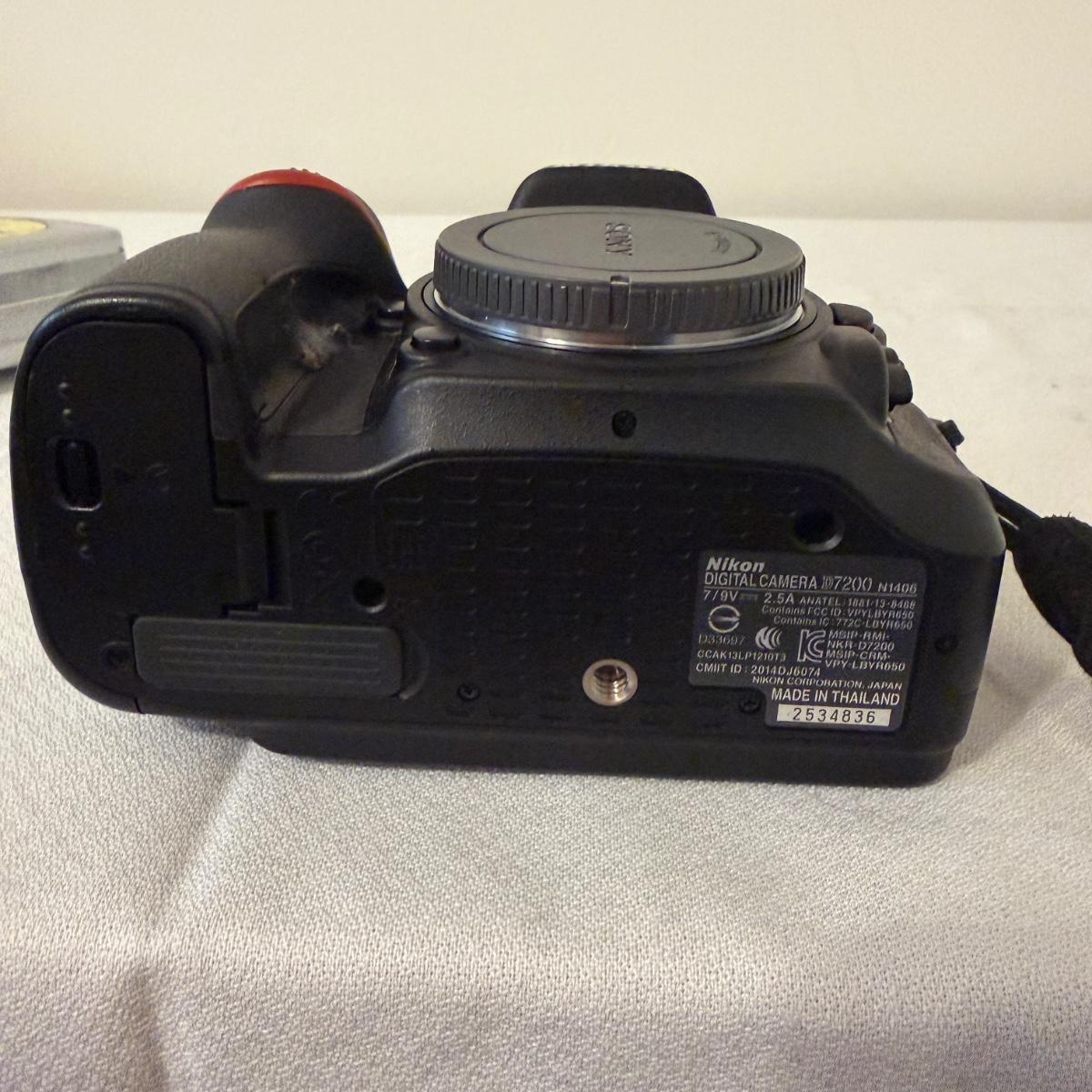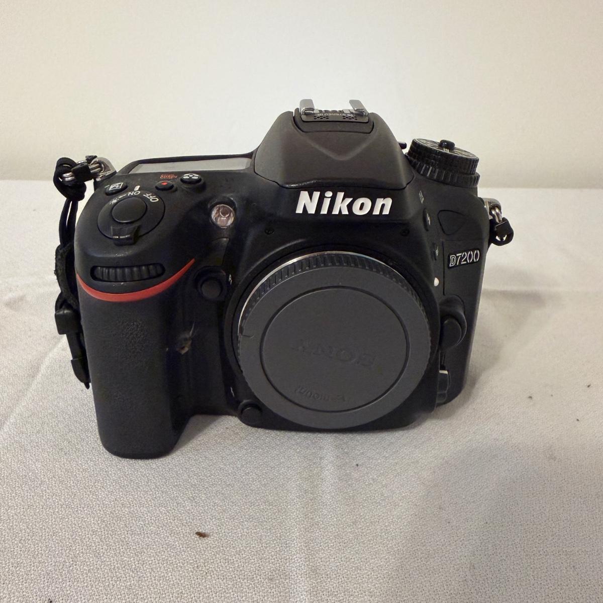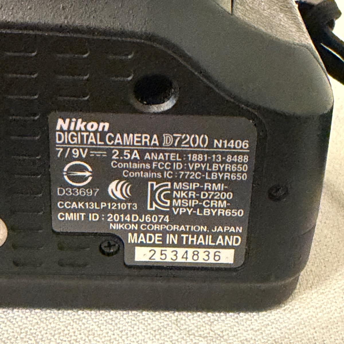 Lot includes a Nikon D7200 body, charger, two batteries, air blower, card holder and neck strap. Camera powered on when turned on.