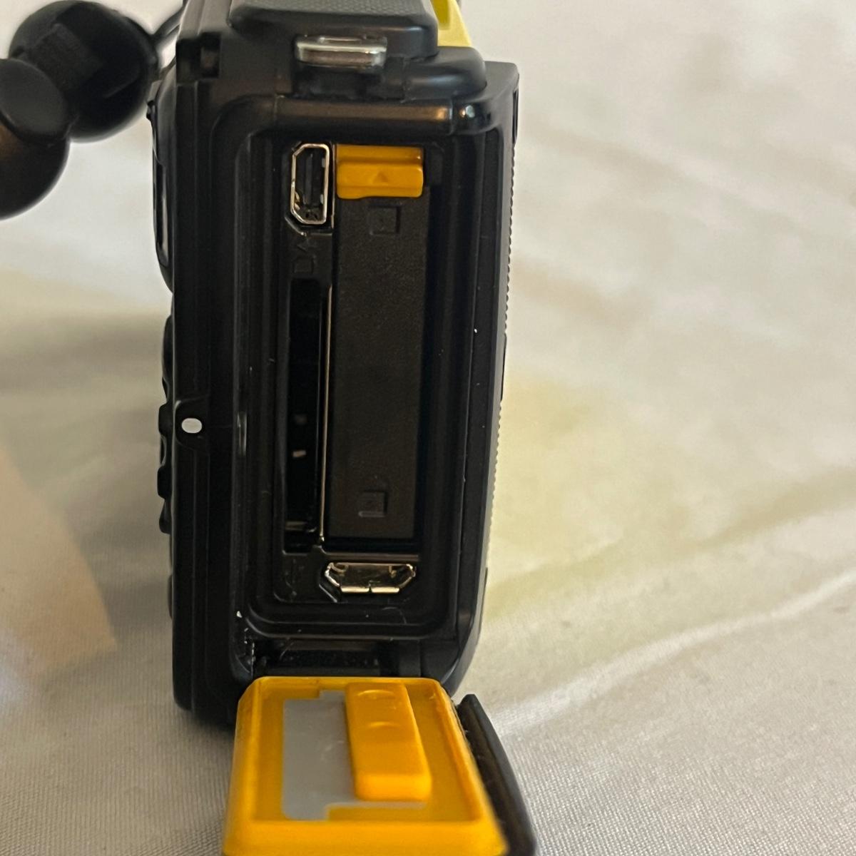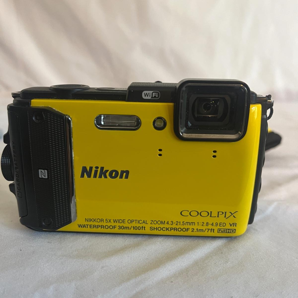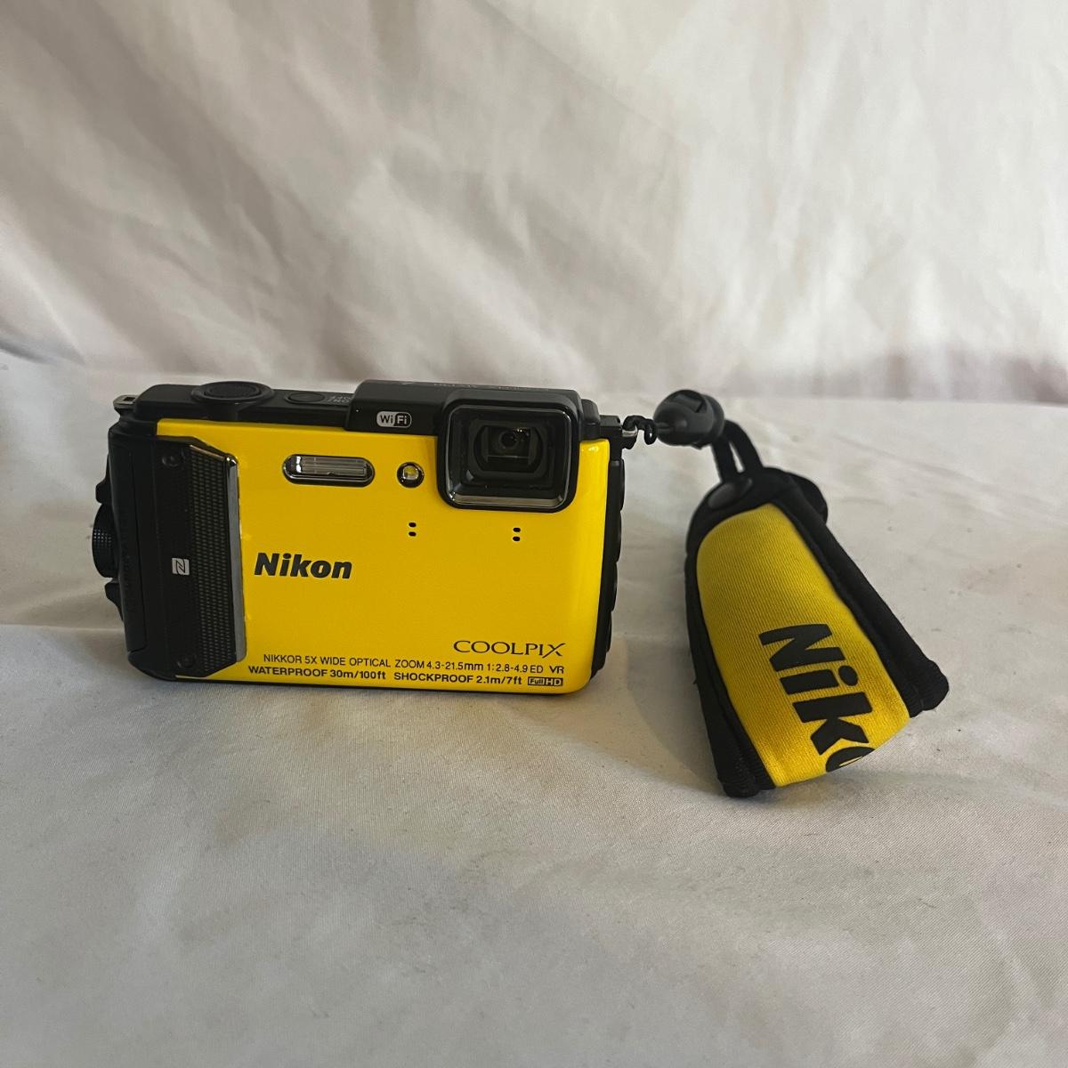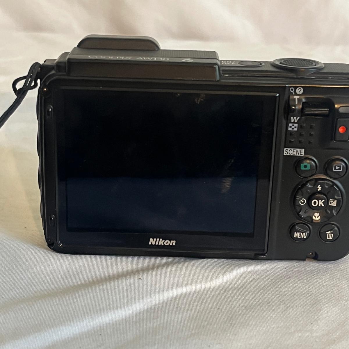 Lot includes a Nikon digital Coolpix waterproof camera with strap. Camera powered on when turned on. No charging cable is included. Camera measures 4.5" x 1" x 2.5"H.