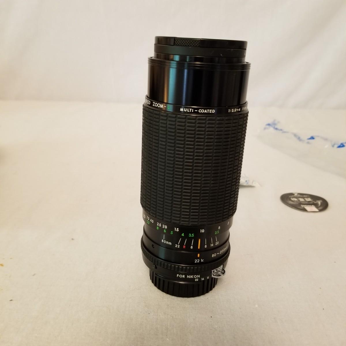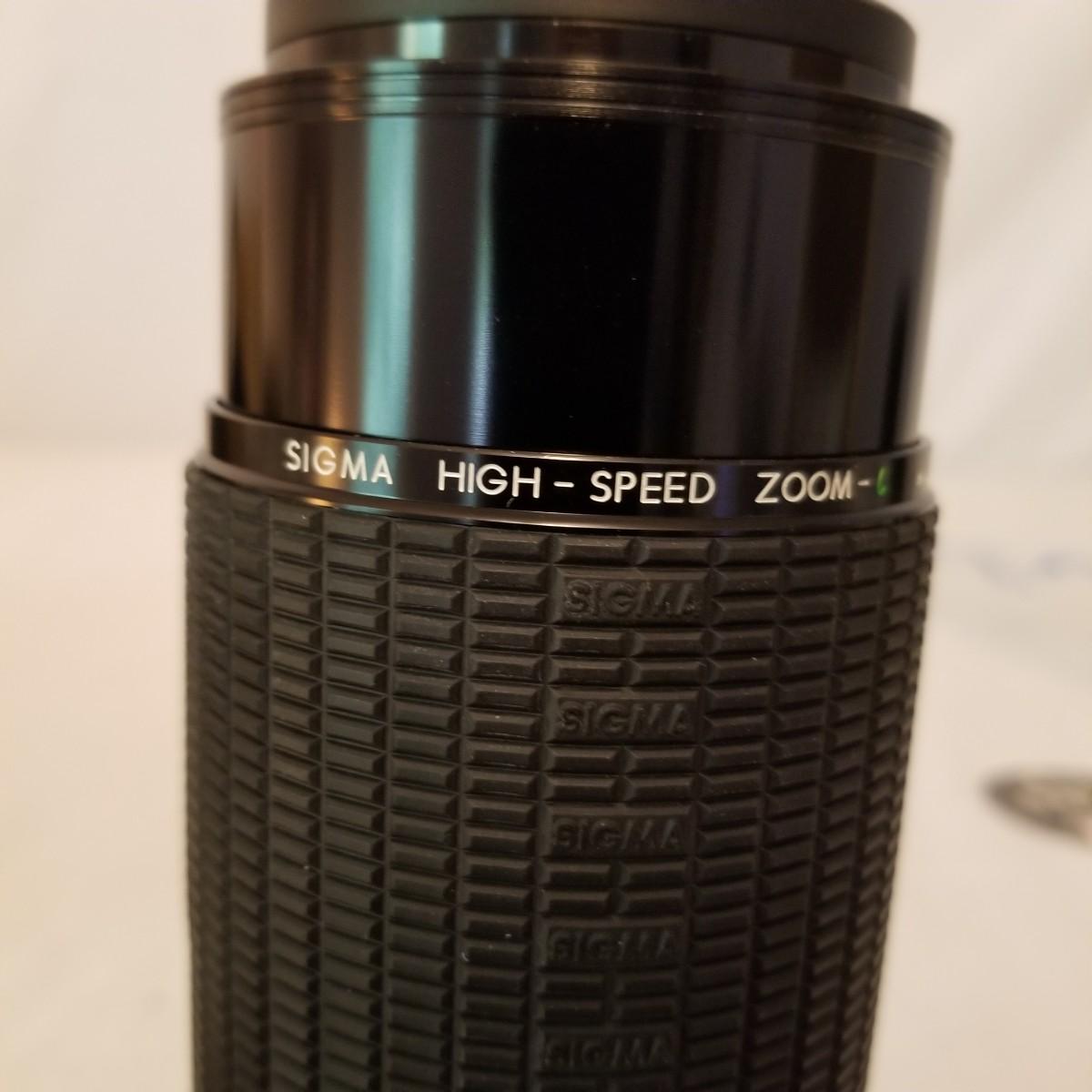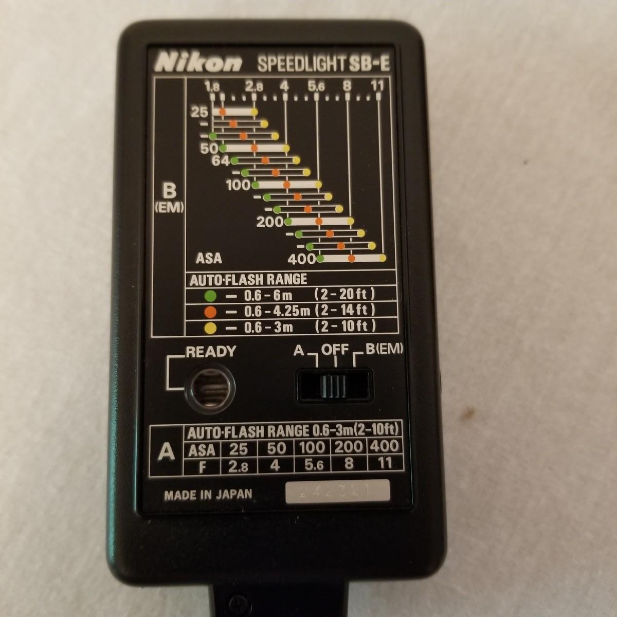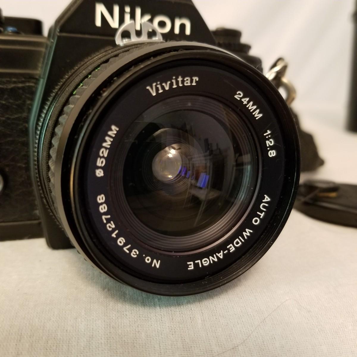 Nikon EM 35mm film camera outfit with three extra lenses and other accessories. Camera comes with hardshell Nikon fitted case, straps, filters, a Speedlight SB-E flash with case. Lenses include; 50mm f 1:1.8 Nikon Series E, one Vivitar 24mm f 1 - 2.8 wide angle, one Sigma 30-80mm f 3.5 short telephoto, and one Sigma 80-200mm f 3.5-4 long telephoto. Sigma lenses have own cases. All equipment in good condition. See photos for details. Shipping available.
