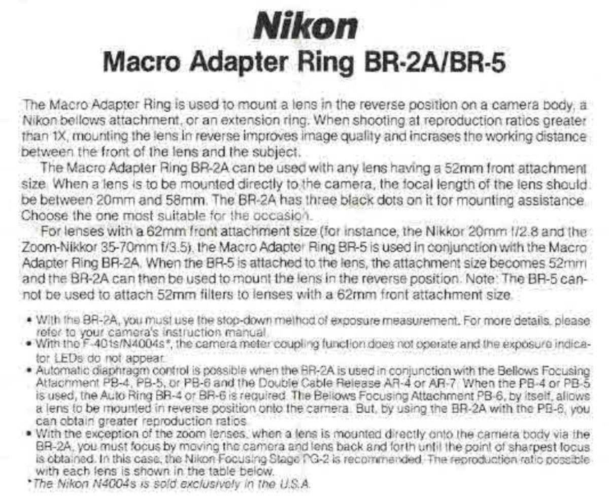Nikon macro adapter ring set (aka: lens reversing ring set). PNs: BR-2A & BR-5, selling as a set (kit) of two pieces. Works with virtually ALL Nikon “F” bayonet mount cameras. These two rings are used to do macro photography by reverse mounting (using backwards) lenses. This is an easy and inexpensive way to do super-macro photography without investing in a super expensive dedicated macro lens. The BR-2A screws onto the front of any lens with a 52mm filter thread and then attaches to the camera's “F” bayonet mount thereby installing the lens backwards. The BR-5 is used to adapt lenses with a 62mm thread to the the BR-2As 52mm thread, further expanding the lenses available to you for macro photography. Like NIB with instructions. Japan
