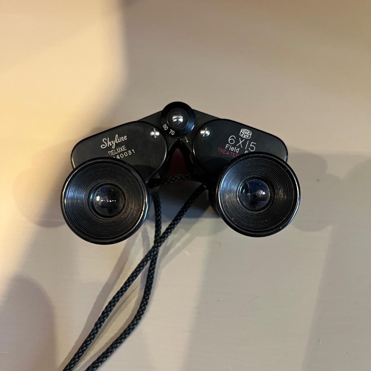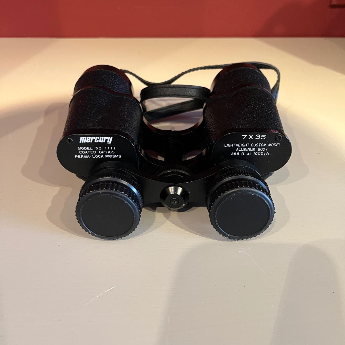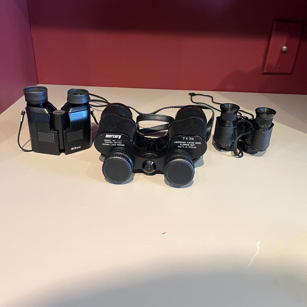 Lot contains a pair of Nikon binoculars 7 x 20, a pair of Skyline Deluxe binoculars 6 x 15 and a pair of Mercury binoculars 7 x 35 with leather case. Mercury binoculars measure 6.5” x 2” x 6”H.