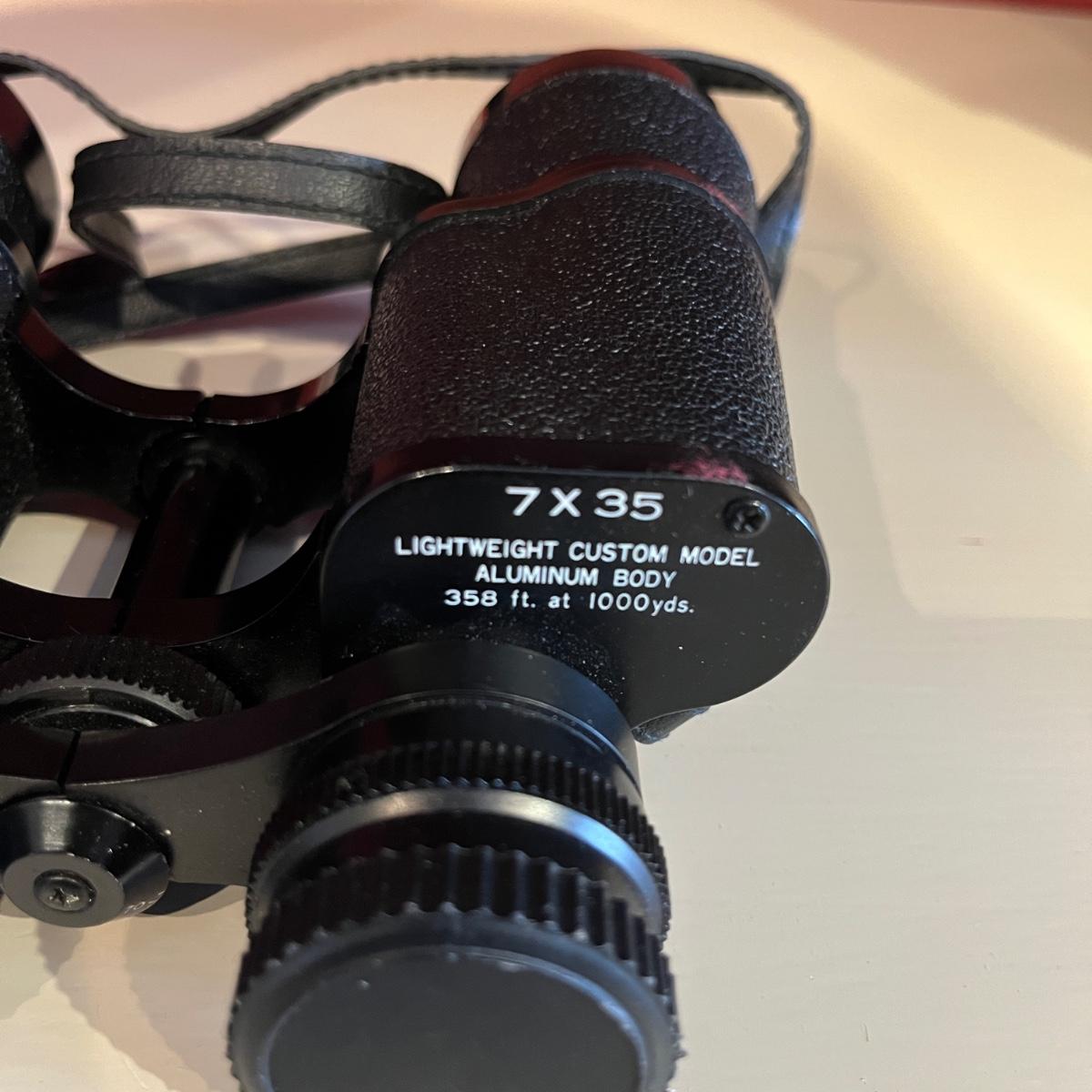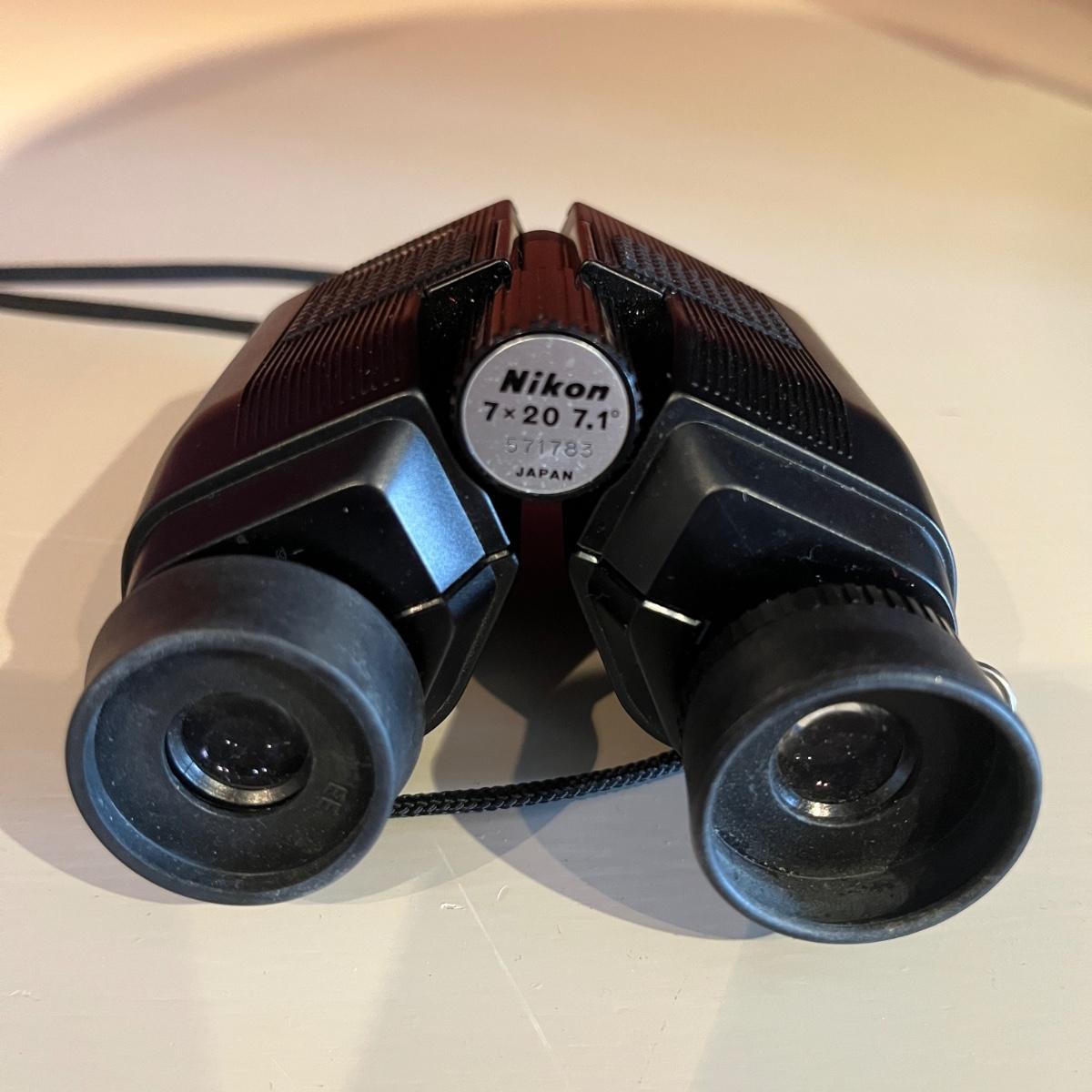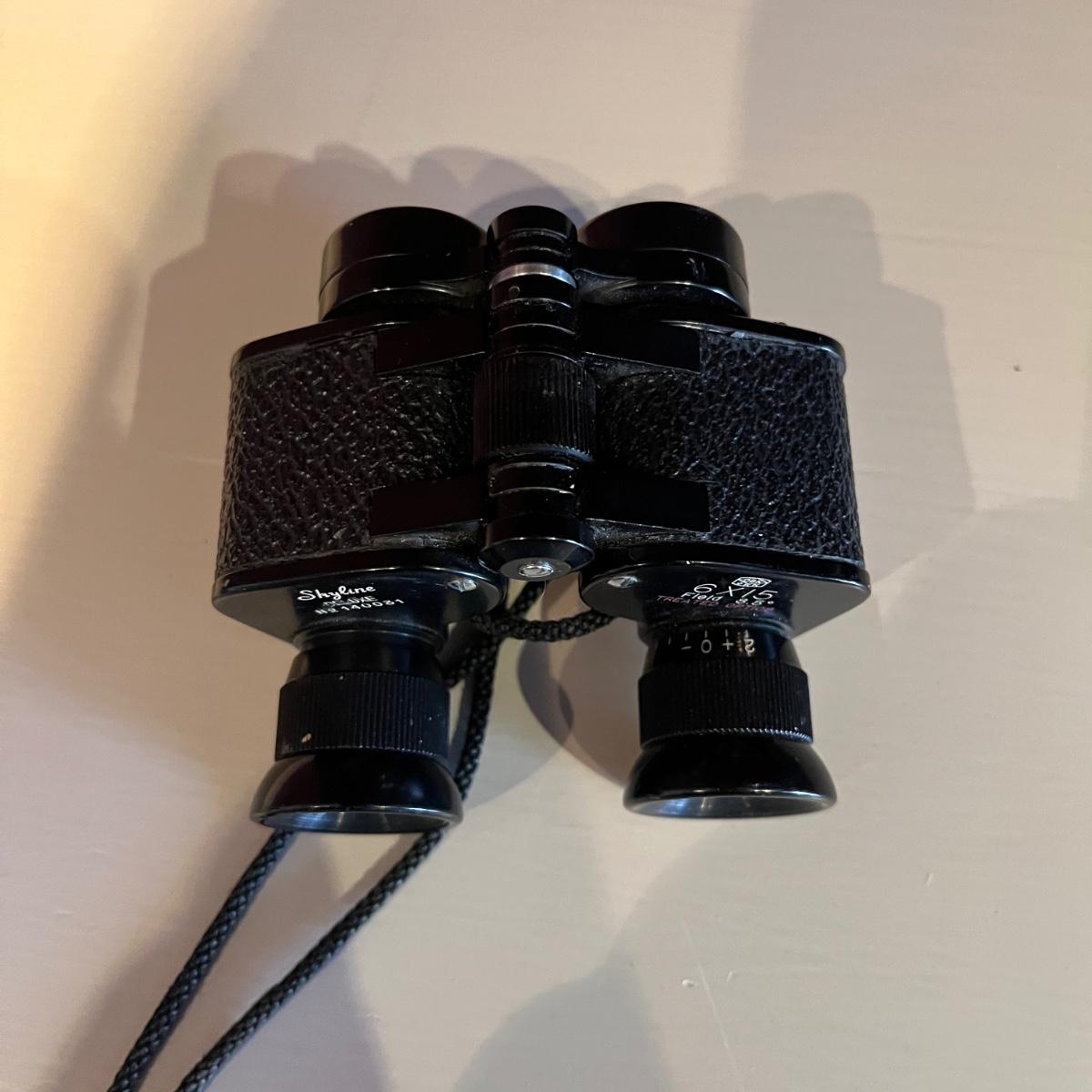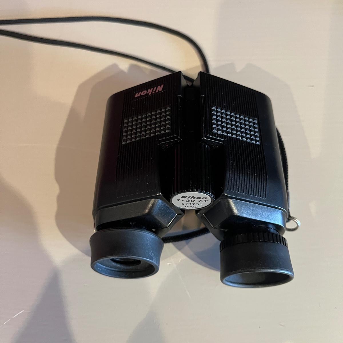 Lot contains a pair of Nikon binoculars 7 x 20, a pair of Skyline Deluxe binoculars 6 x 15 and a pair of Mercury binoculars 7 x 35 with leather case. Mercury binoculars measure 6.5” x 2” x 6”H.