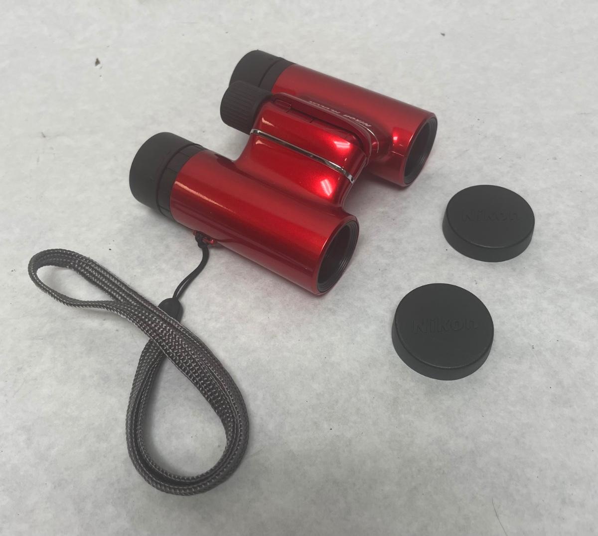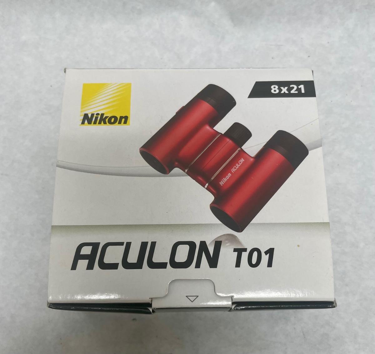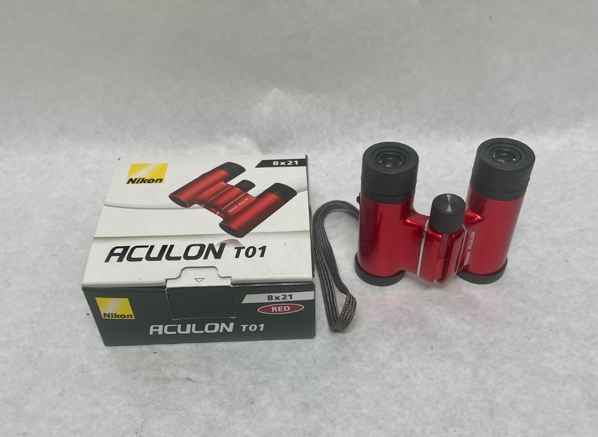 Aculon T-01 Binoculars. 8x21, with a brilliant red-anodized finish. New in original box, with lens caps, attached wrist strap and instruction booklet.