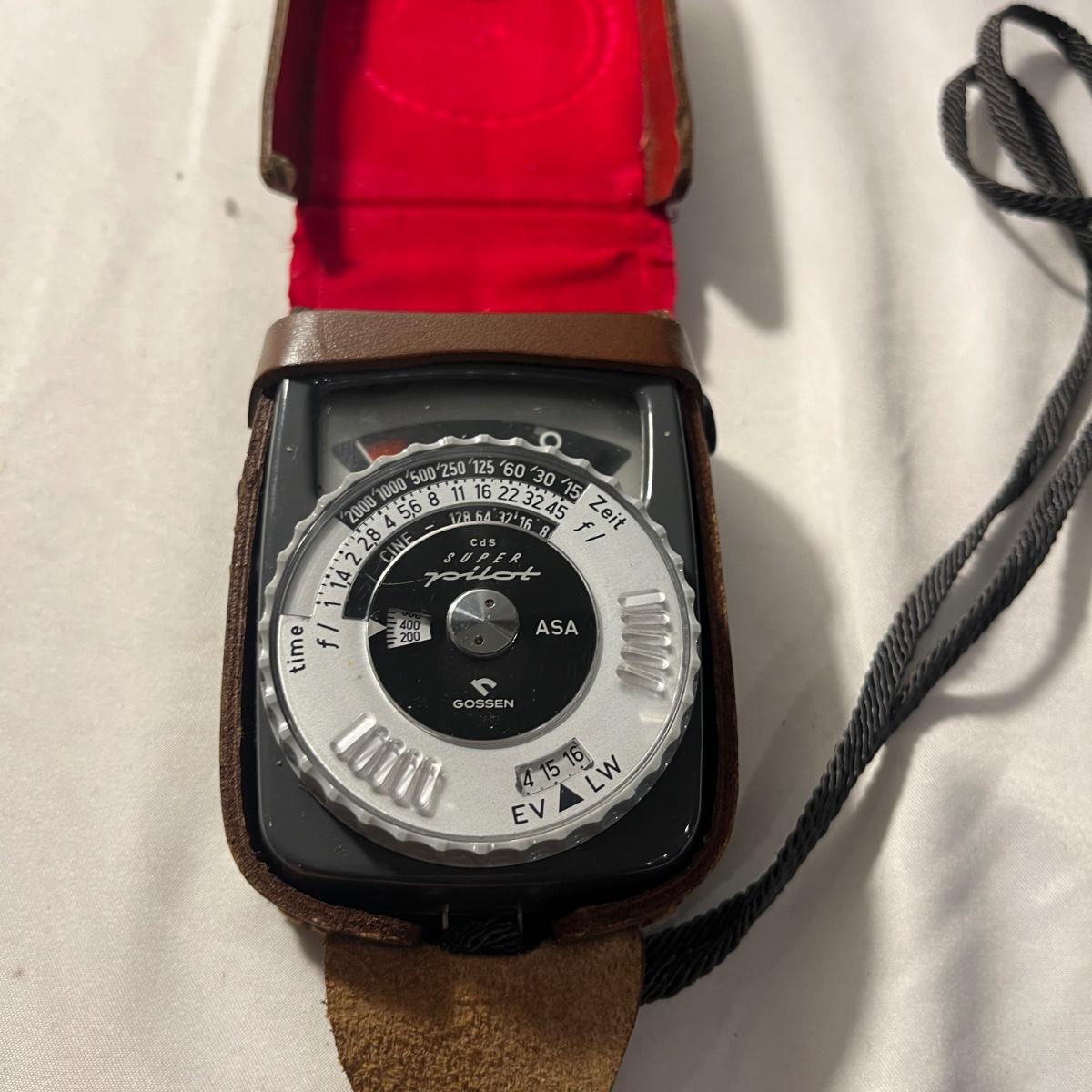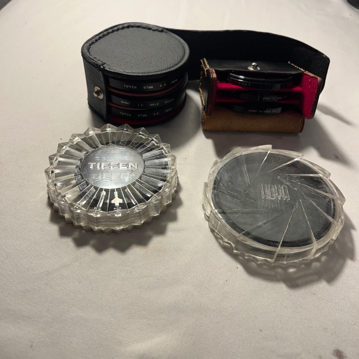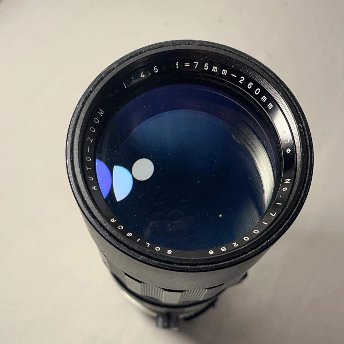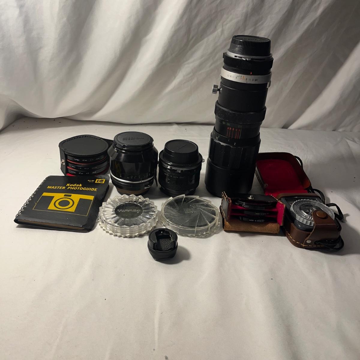 Lot includes a Soligor 75mm- 260mm lens, Tamron 28mm lens and Nikon 50mm lens all with cases. Also includes filters and Gossen light meter. Soligor lens measures 3”D x 8.5” long.