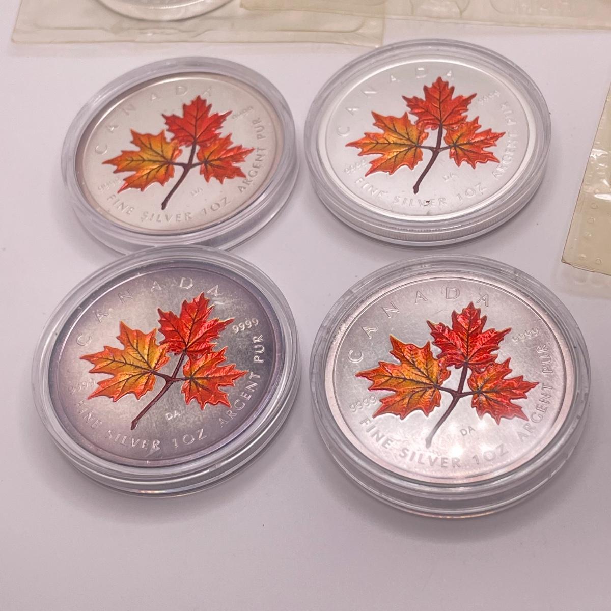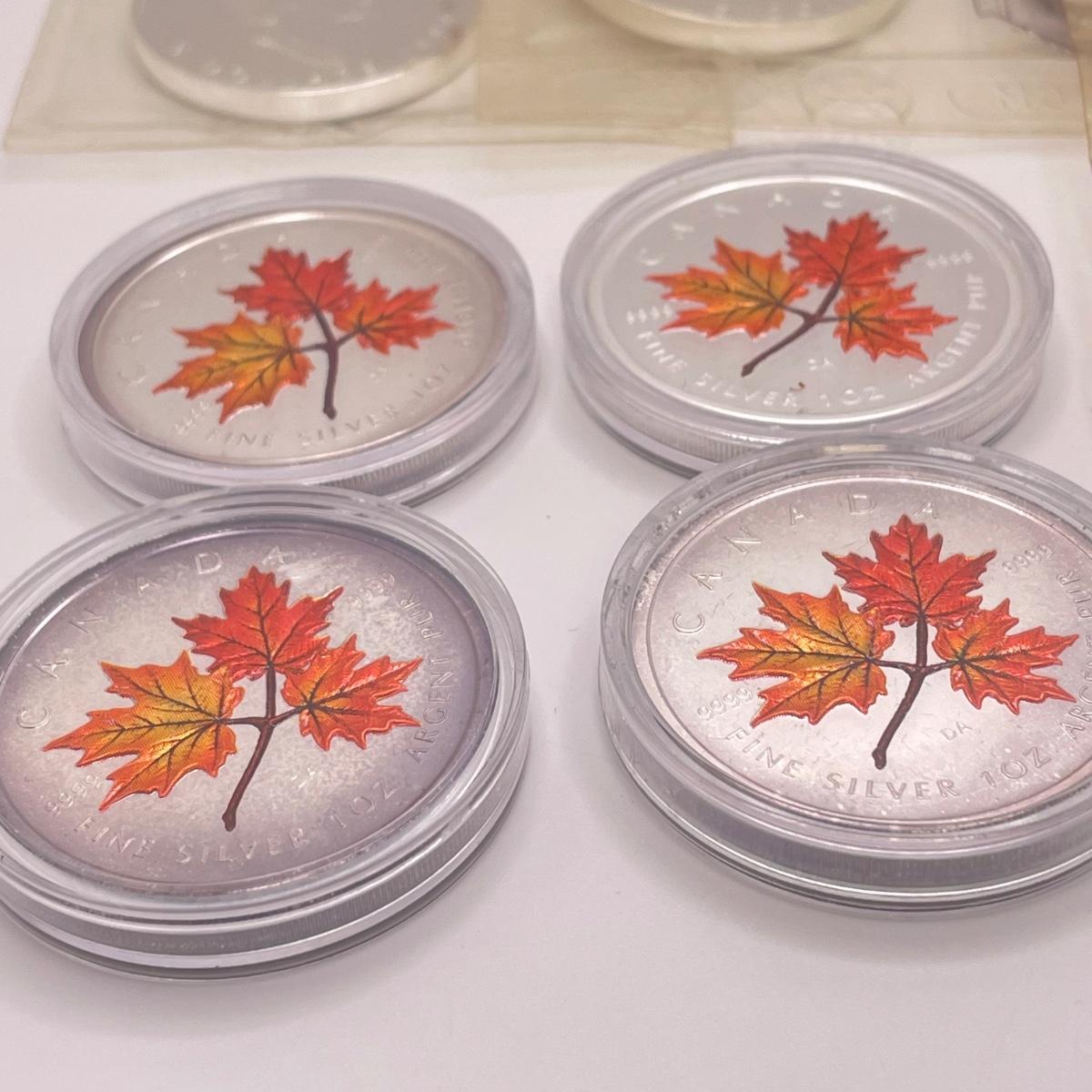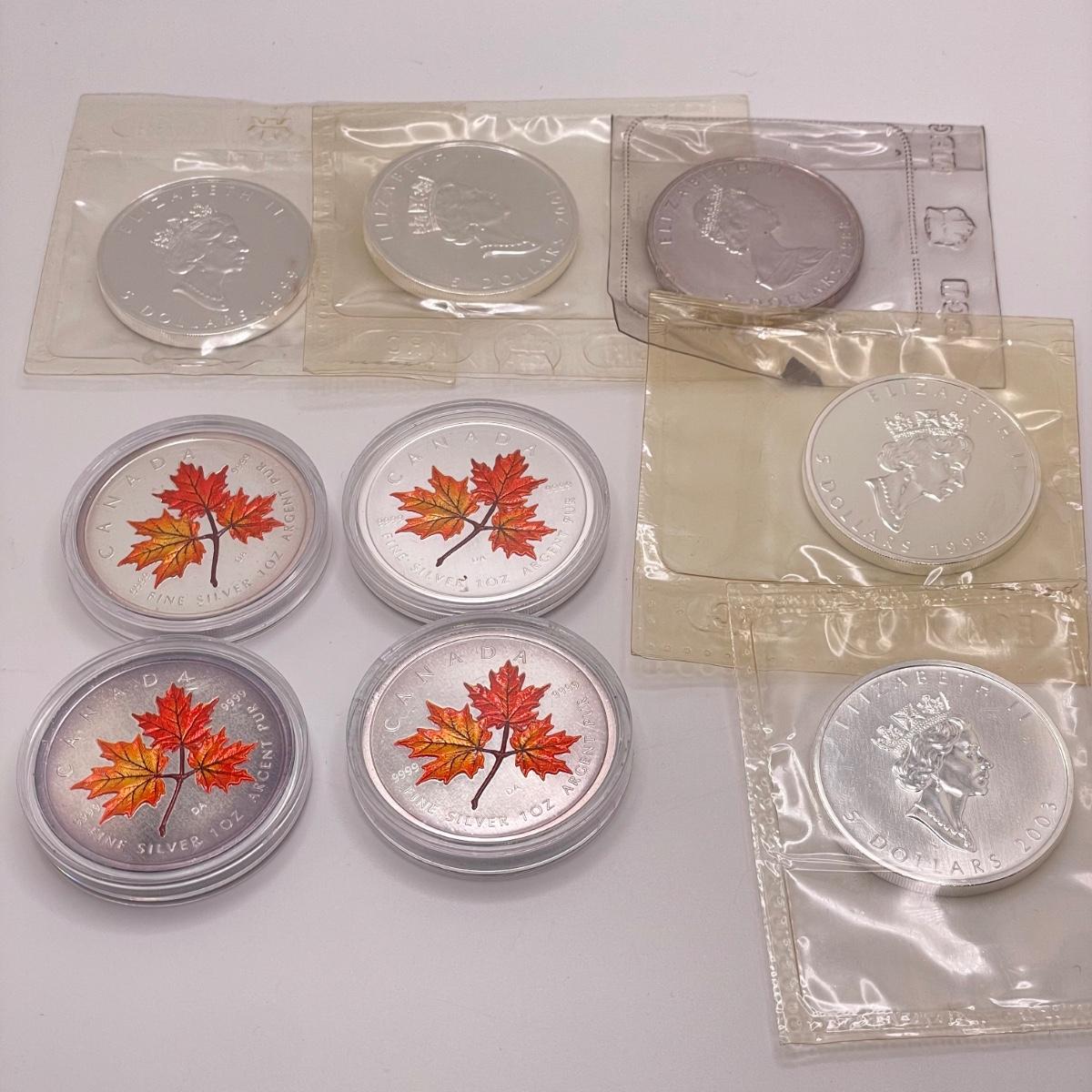 Nine $5 one ounce .999 silver coins, four with colored maple leaves. None show evidence of being circulated, but we have not verified that. Starting bid is at or near melt value. All sales are final. No returns or refunds. Please bid accordingly. Shipping available.