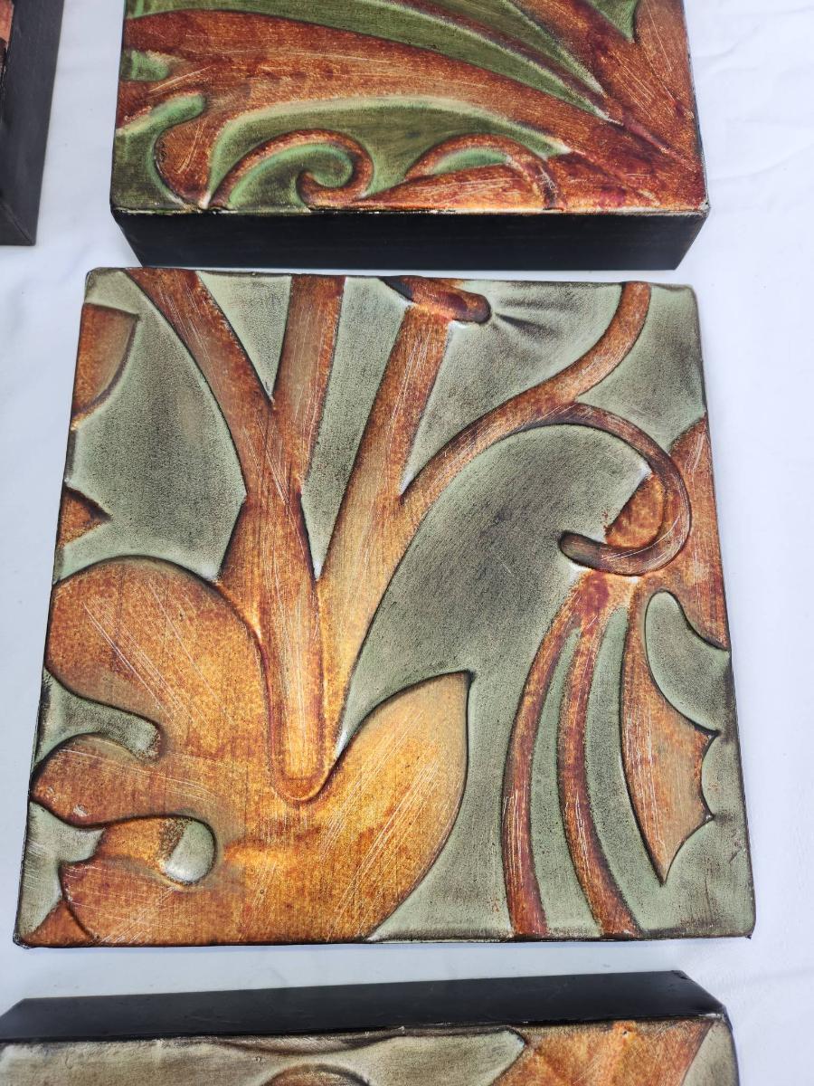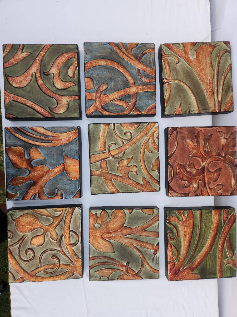Nine decorative wall tiles with embossed floral motifs in various earth-tone colors including green, orange, and bronze. Each tile is square-shaped and made primarily of durable material, potentially ceramic or resin. The carved and painted surface creates a textured and elegant look. Condition appears to be good overall with no major apparent damage or wear.