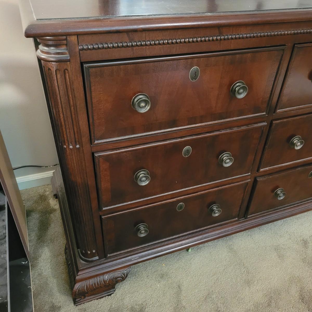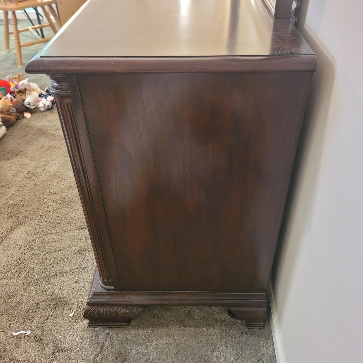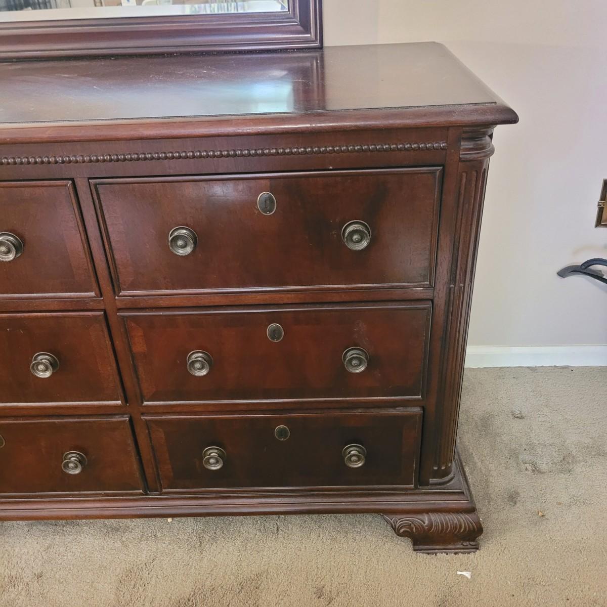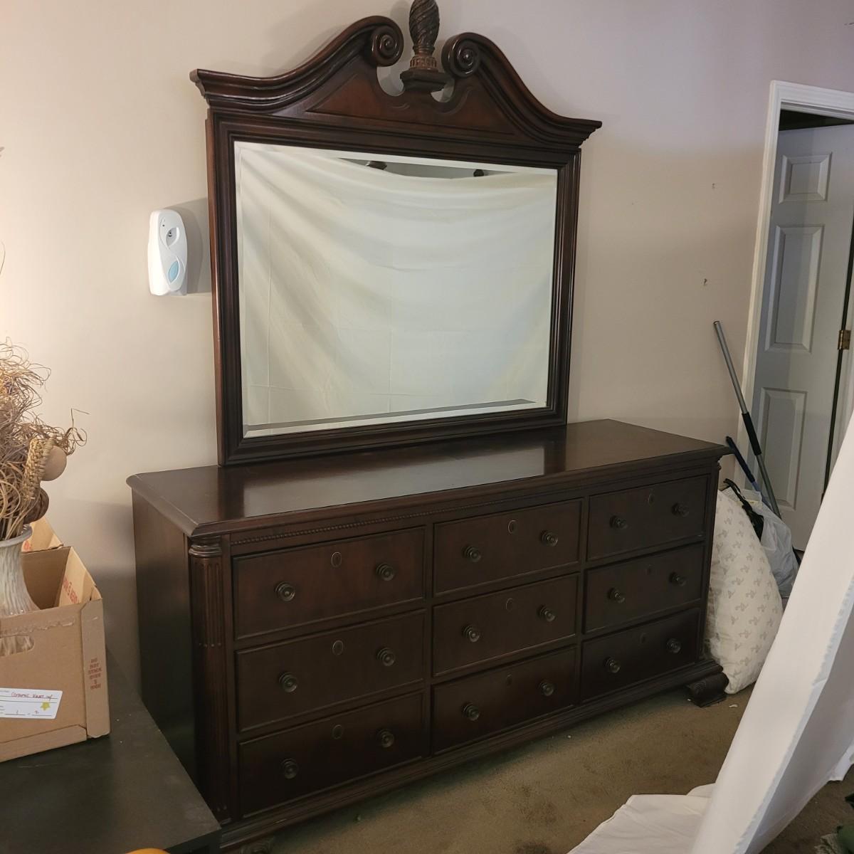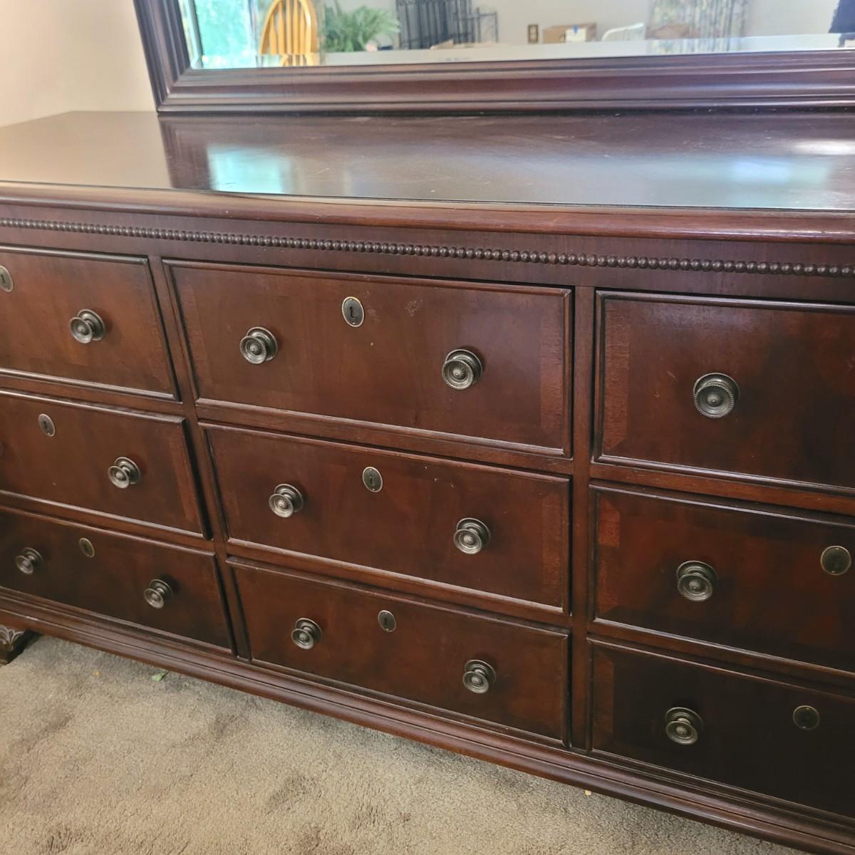 This wooden nine drawer dresser with attached mirror has a simple, classic design. Dresser measures approximately 68” x 21” x 33”H, mirror 48.5” x 49”H. Local pickup only. Winning bidder must bring appropriate tools to disassemble, and assistance to help move and load this item due to its weight and size.