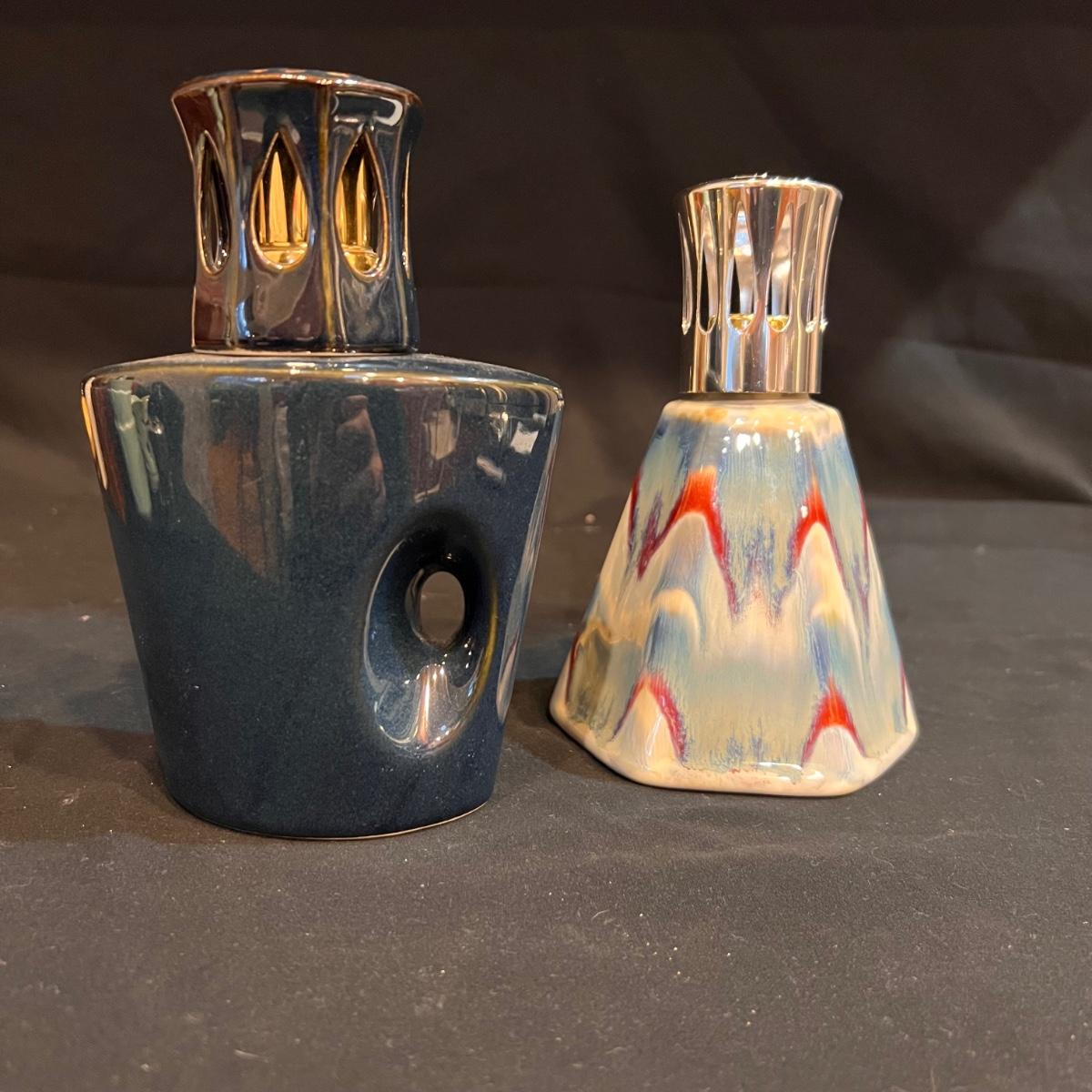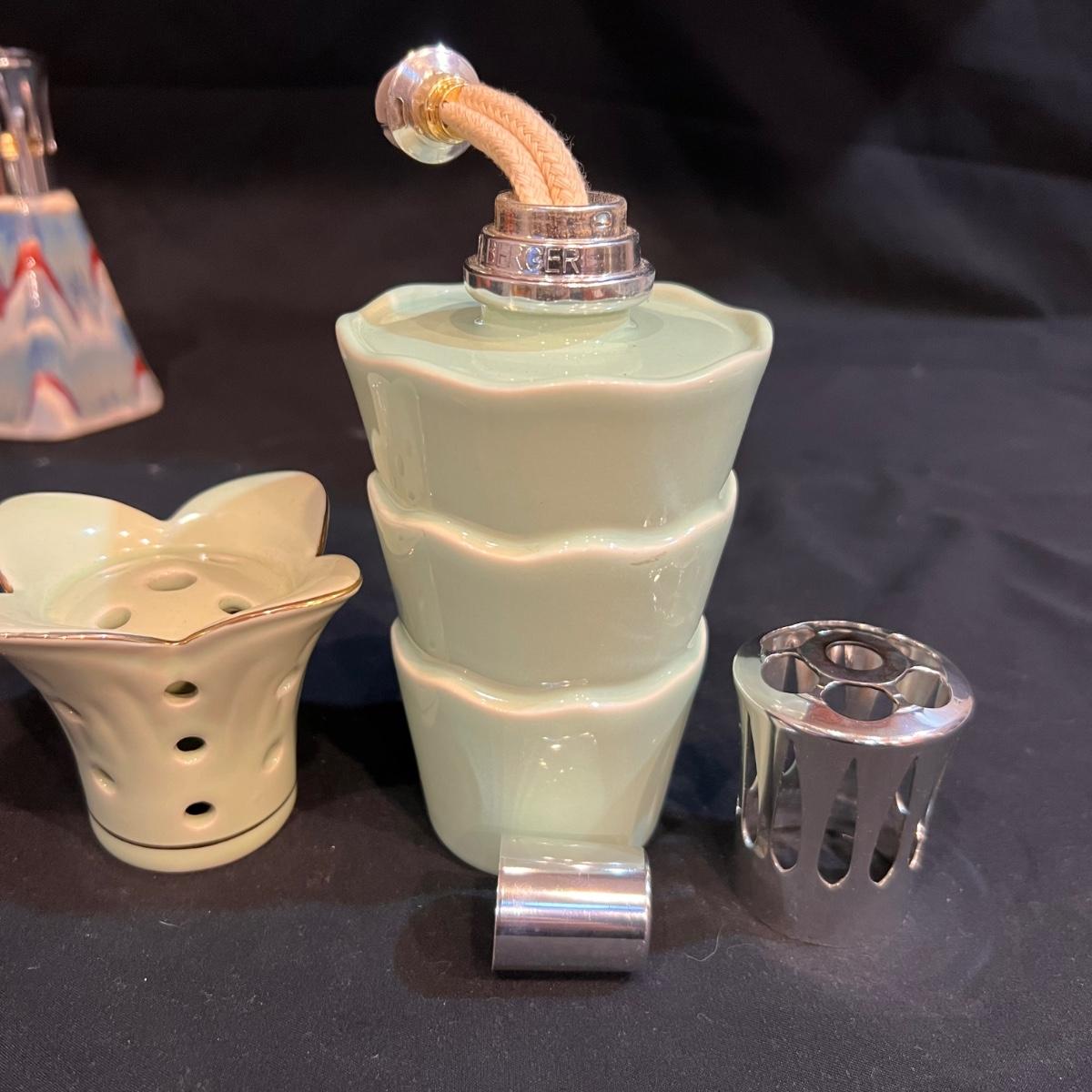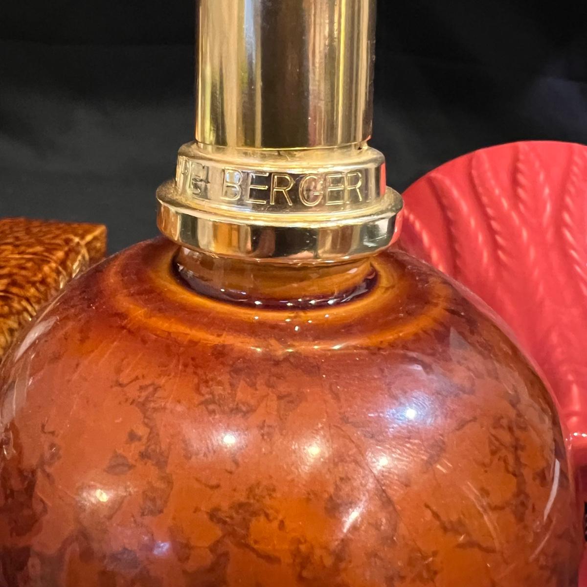 Five of these nine lamps are Berger. All appear to be porcelain. The teal blue lamp is the only one with a wick, it measures approximately 3”D x 7”H. Two lamps do not have tops.