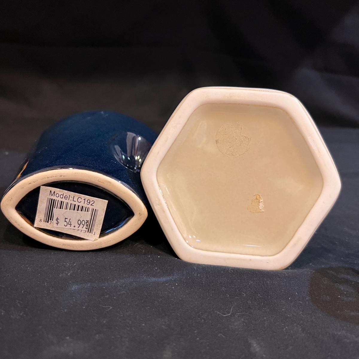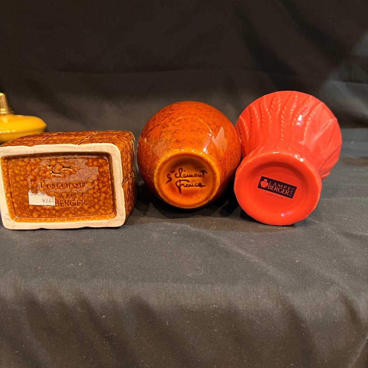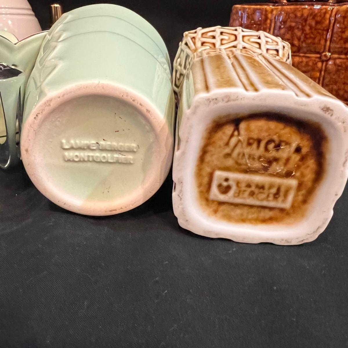 Five of these nine lamps are Berger. All appear to be porcelain. The teal blue lamp is the only one with a wick, it measures approximately 3”D x 7”H. Two lamps do not have tops.