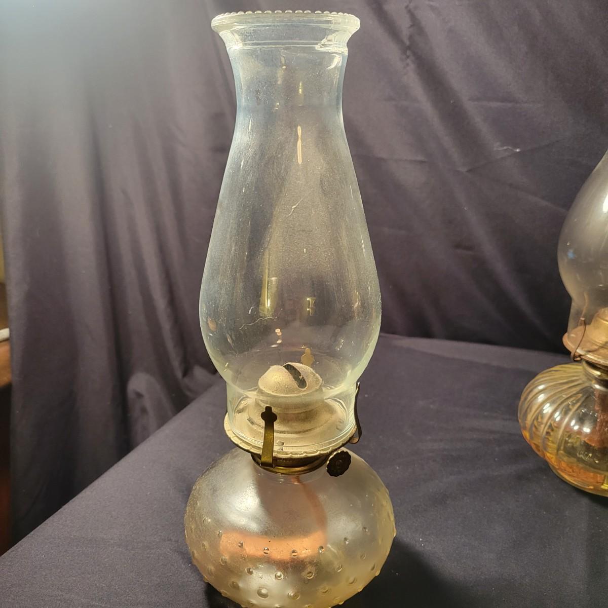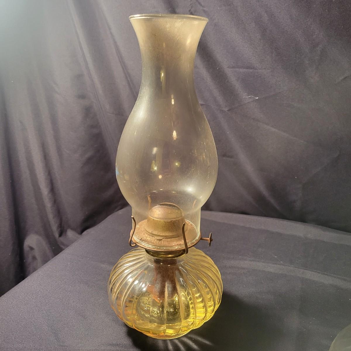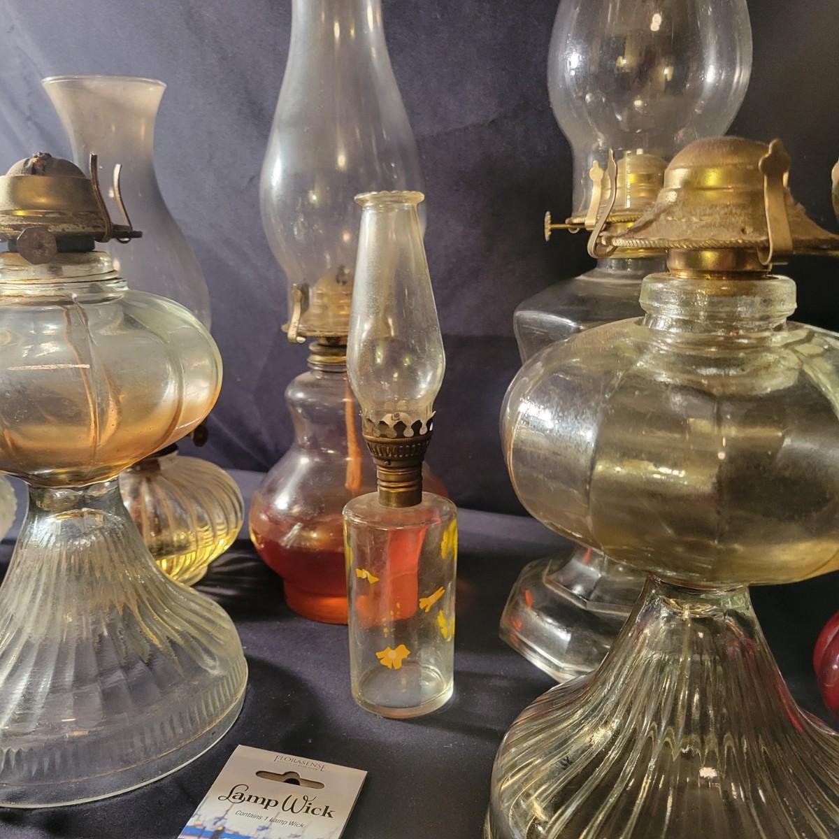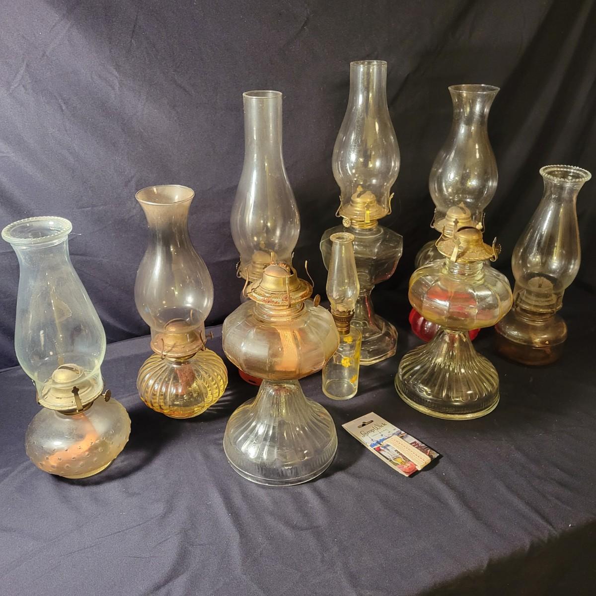 A collection of 9 oil hurricane lamps in good condition with no notable damage. Two lamps are missing their globes. Some lamps have oil in them still. Lot also includes an additional wick. Largest lamp measures approximately 6" x 18.5" Local pickup only
