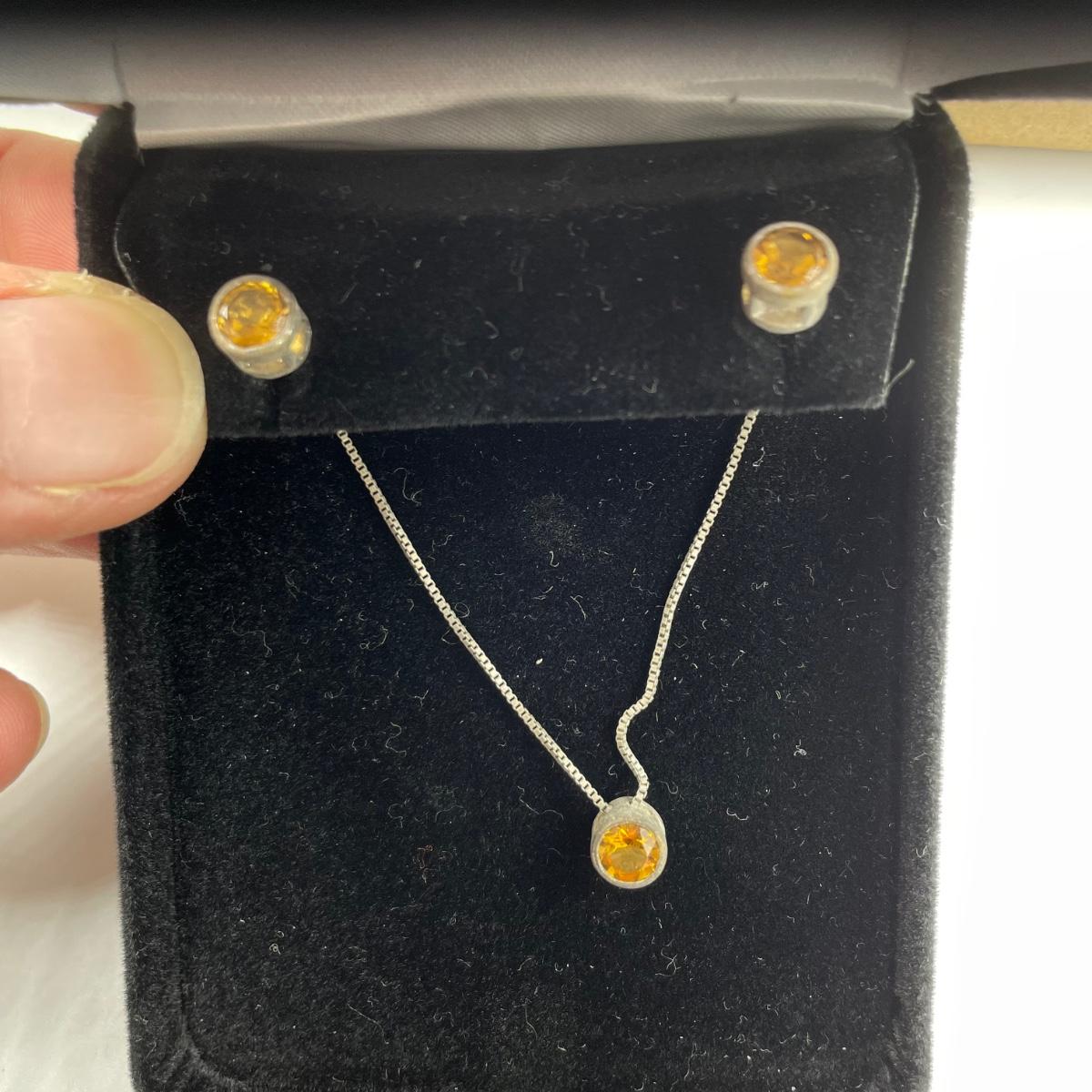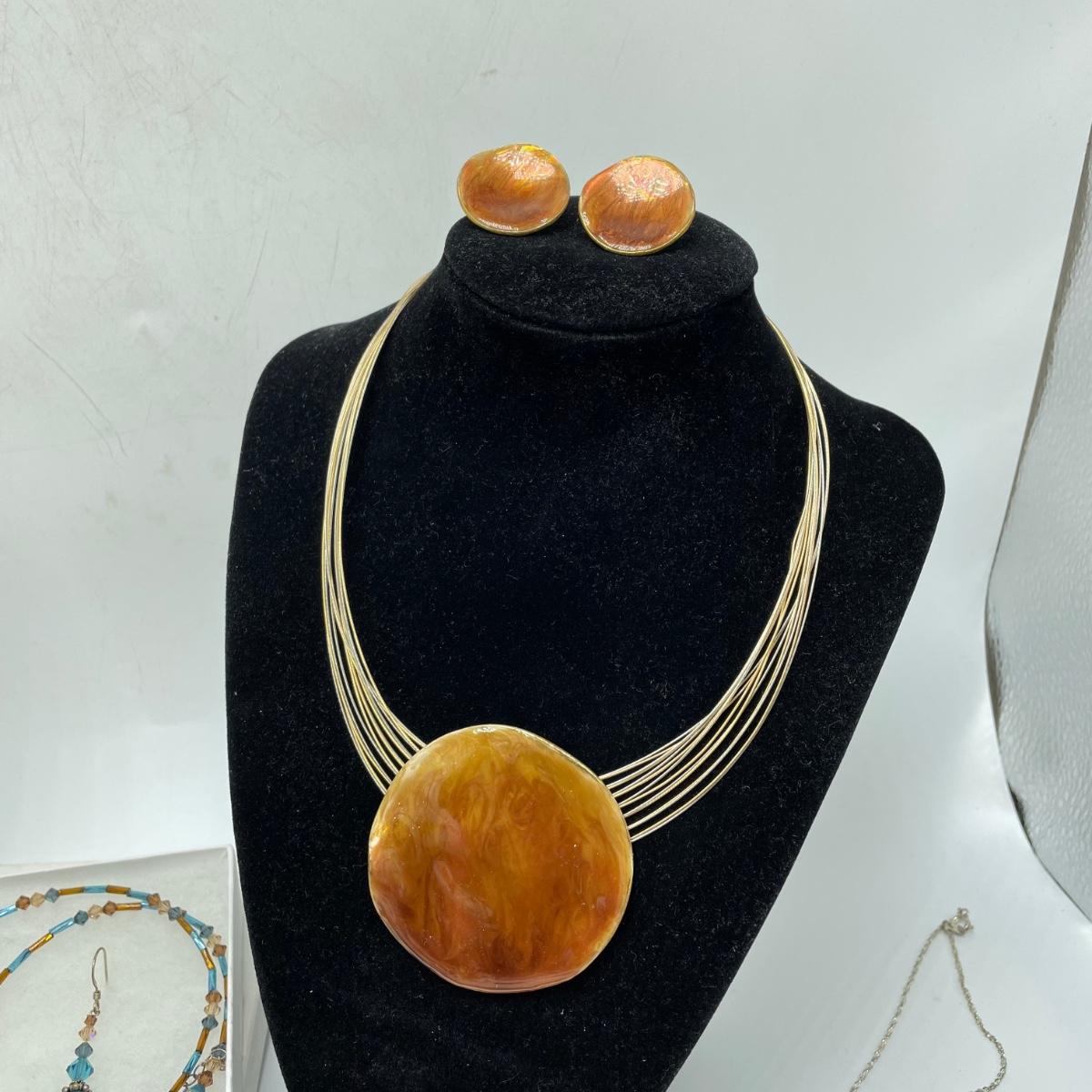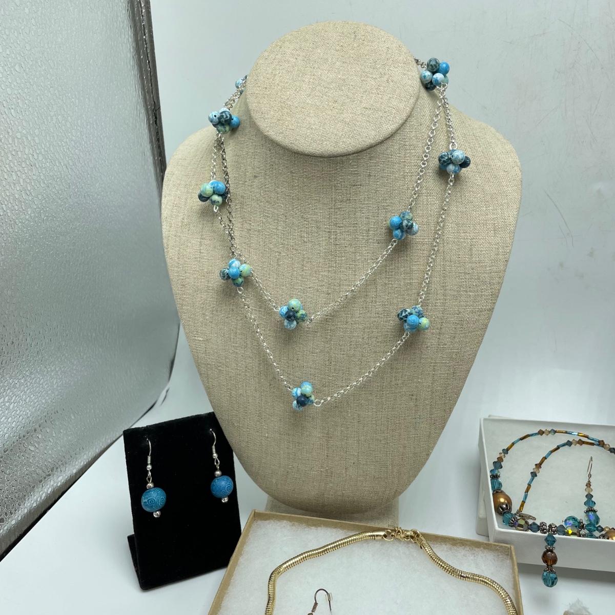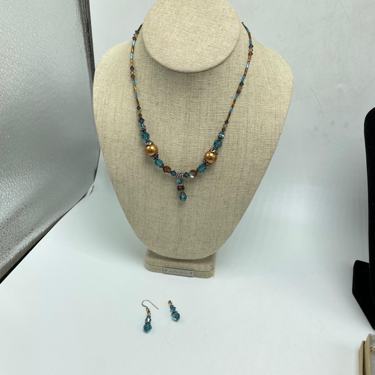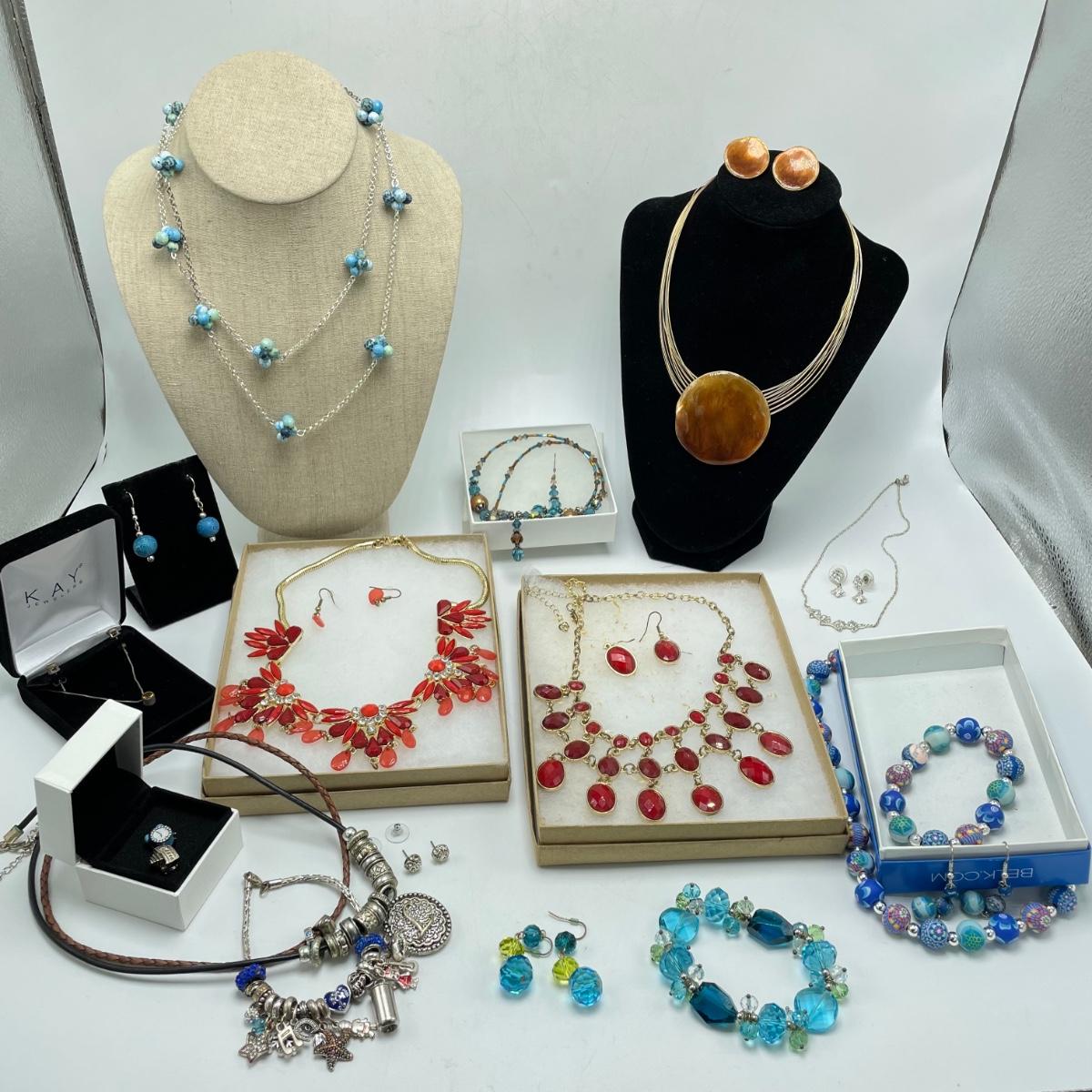 Nine sets of jewelry including earrings, bracelets and necklaces. Lot also includes multiple charms with leather necklaces and a silver bracelet. The brown leather has a permanent Pandora charm and a few charms are marked 925. There is an Amber colored stone set in a Kay’s box, the jewelry is marked 925 -and would probably really shine once polished. The earring-necklace set with clear colored beads and marked 925 has one earring in which the French wire needs to be replaced. See images. Shipping available.