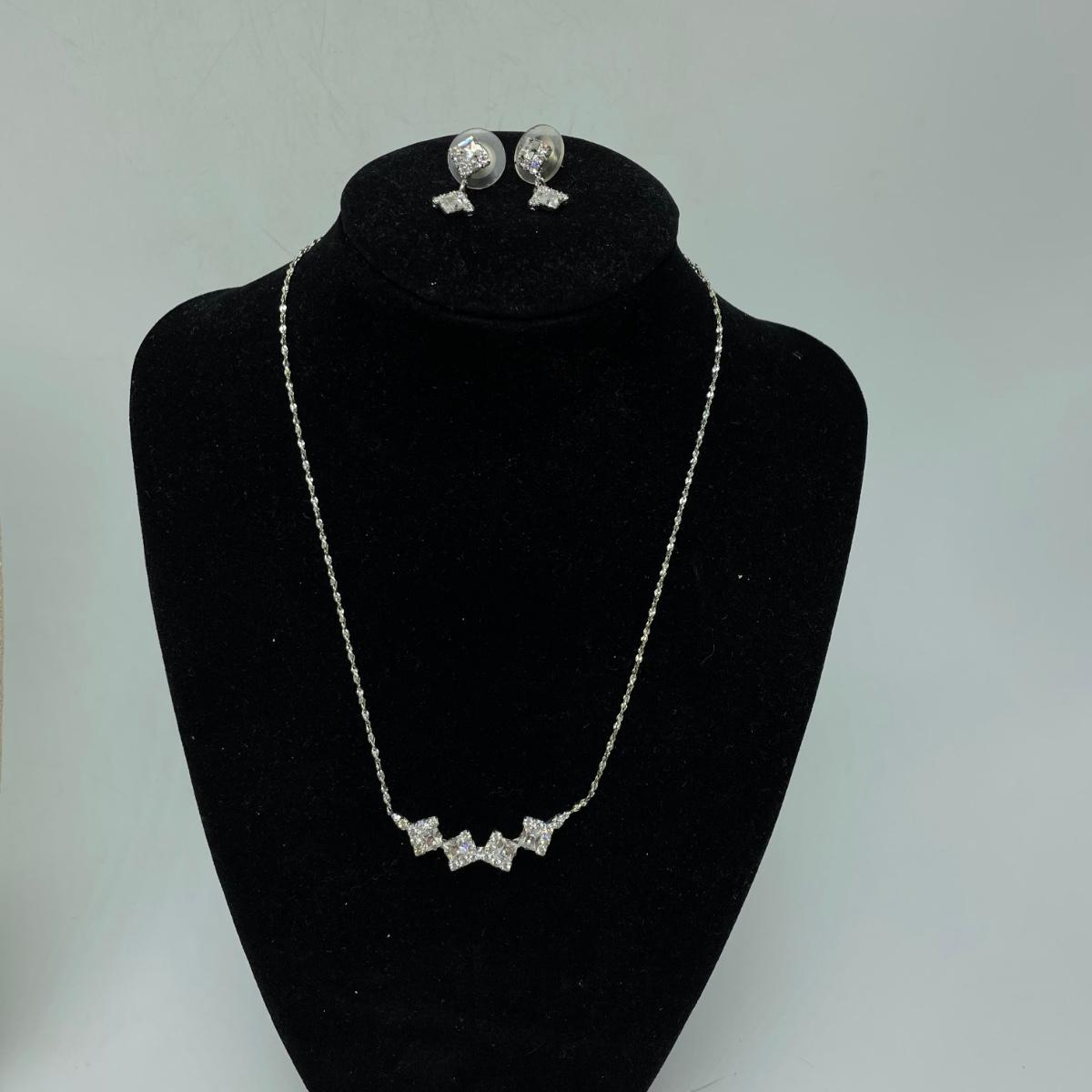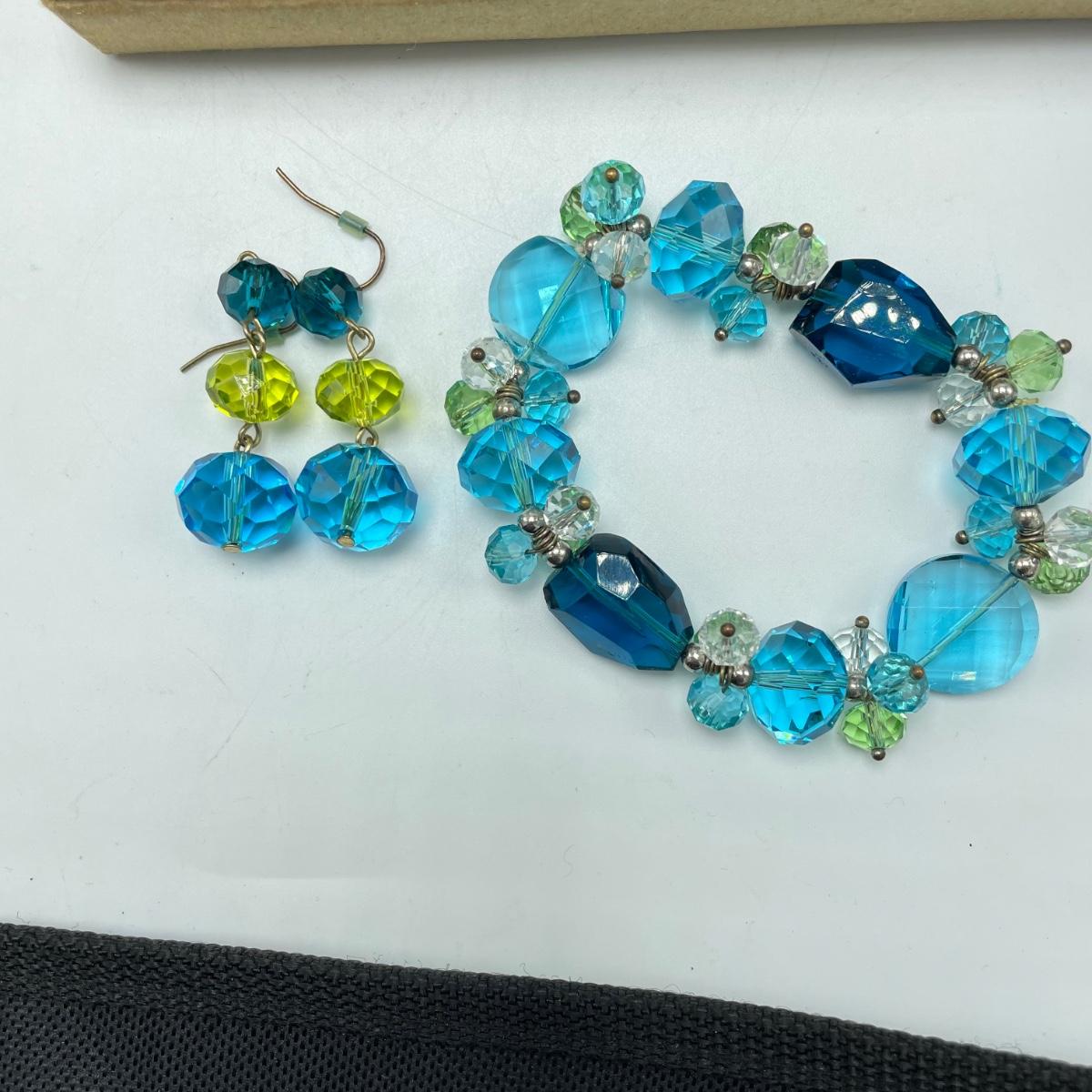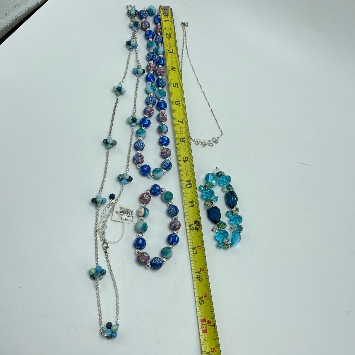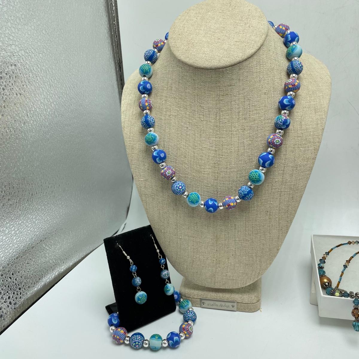 Nine sets of jewelry including earrings, bracelets and necklaces. Lot also includes multiple charms with leather necklaces and a silver bracelet. The brown leather has a permanent Pandora charm and a few charms are marked 925. There is an Amber colored stone set in a Kay’s box, the jewelry is marked 925 -and would probably really shine once polished. The earring-necklace set with clear colored beads and marked 925 has one earring in which the French wire needs to be replaced. See images. Shipping available.