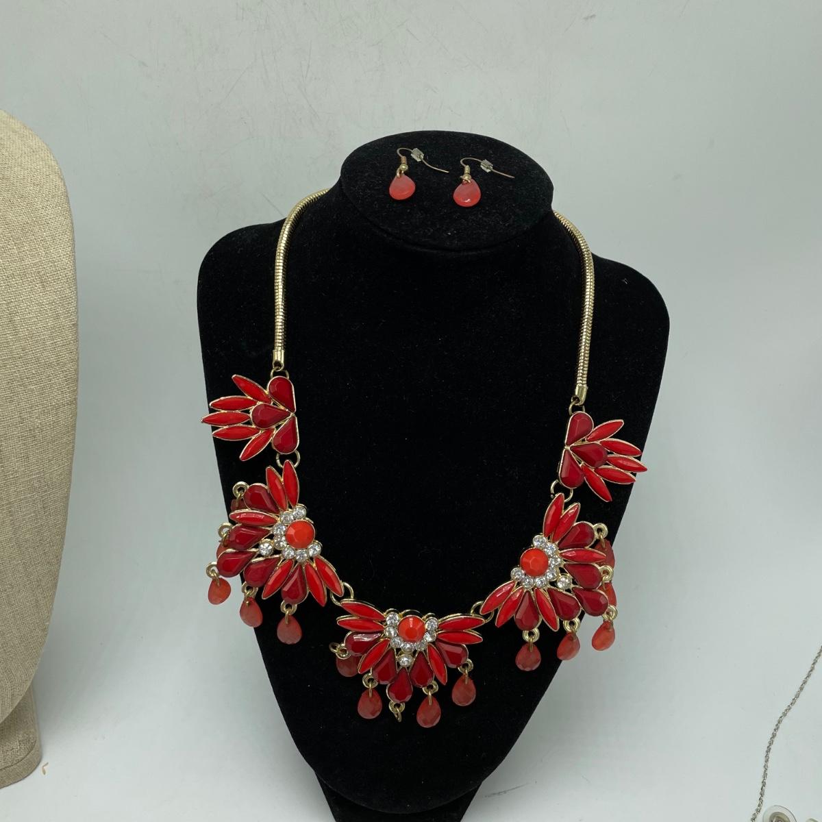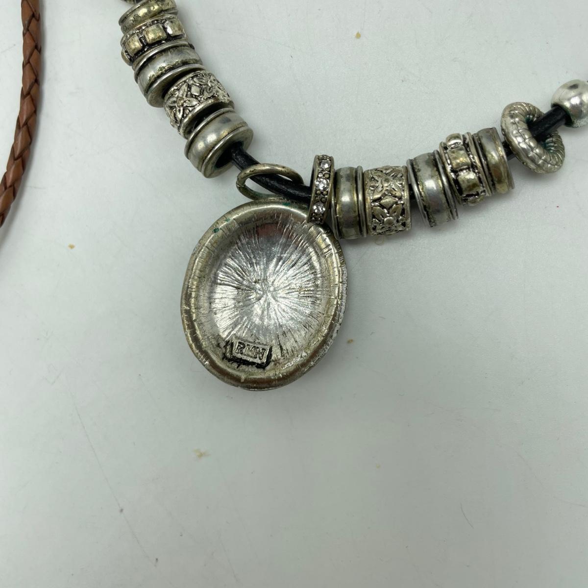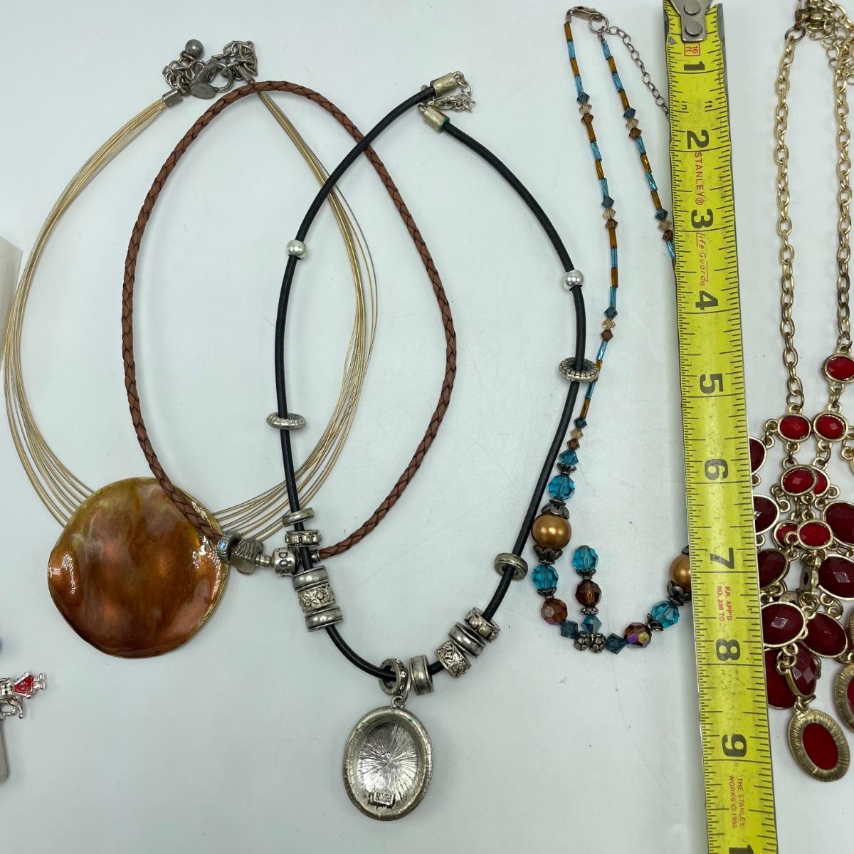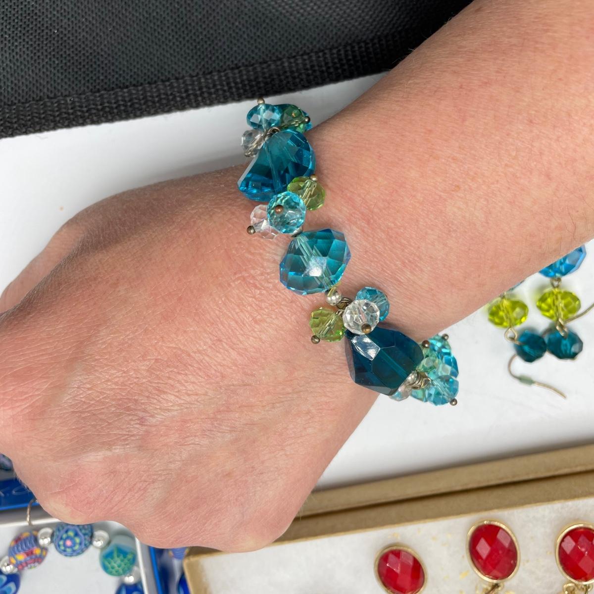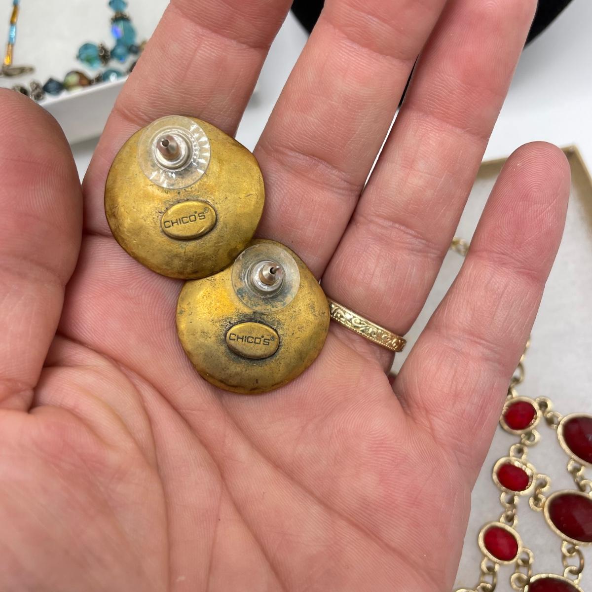 Nine sets of jewelry including earrings, bracelets and necklaces. Lot also includes multiple charms with leather necklaces and a silver bracelet. The brown leather has a permanent Pandora charm and a few charms are marked 925. There is an Amber colored stone set in a Kay’s box, the jewelry is marked 925 -and would probably really shine once polished. The earring-necklace set with clear colored beads and marked 925 has one earring in which the French wire needs to be replaced. See images. Shipping available.