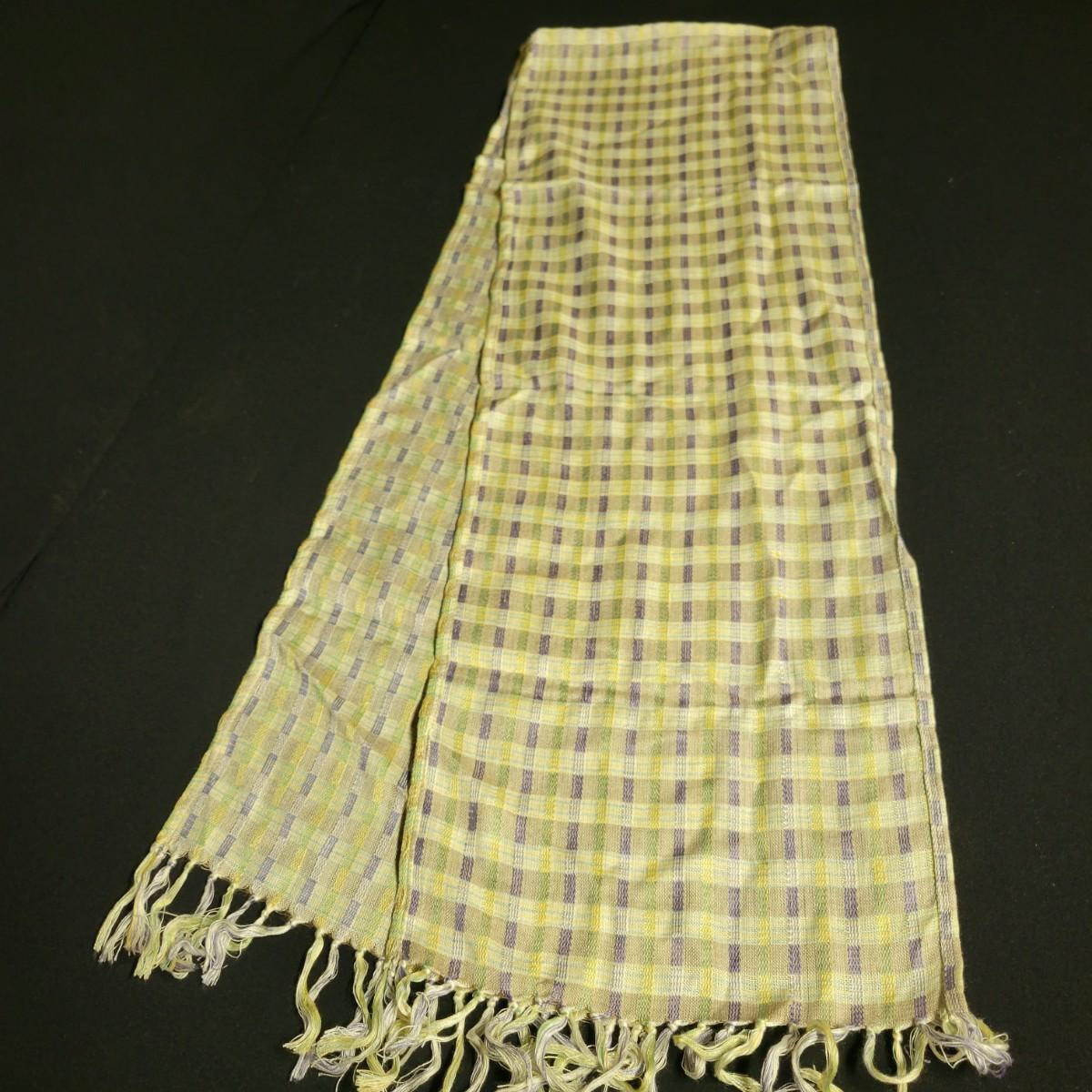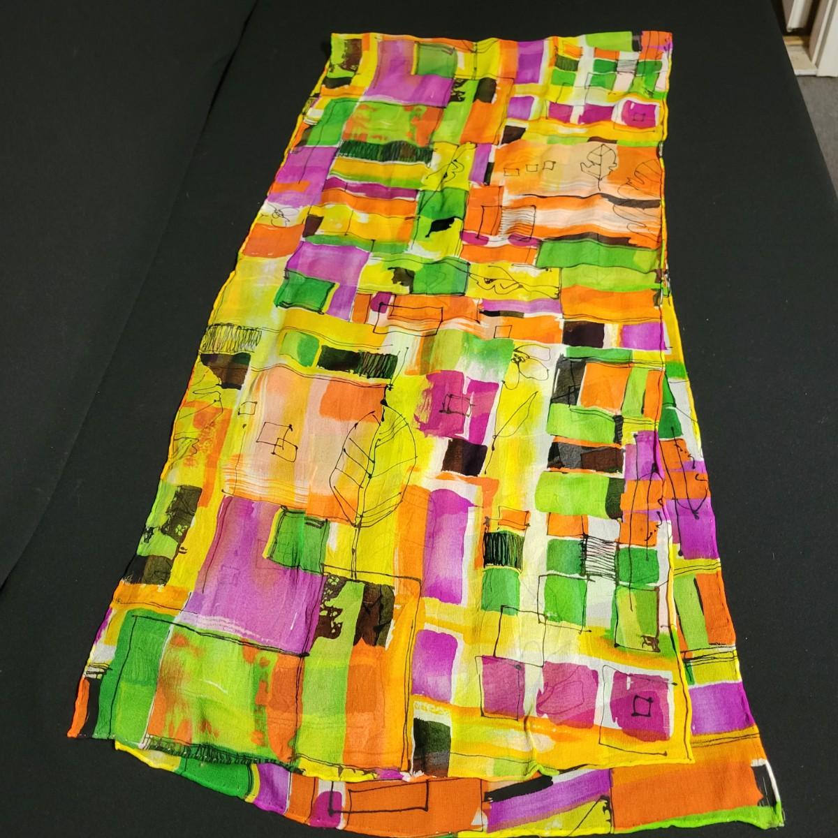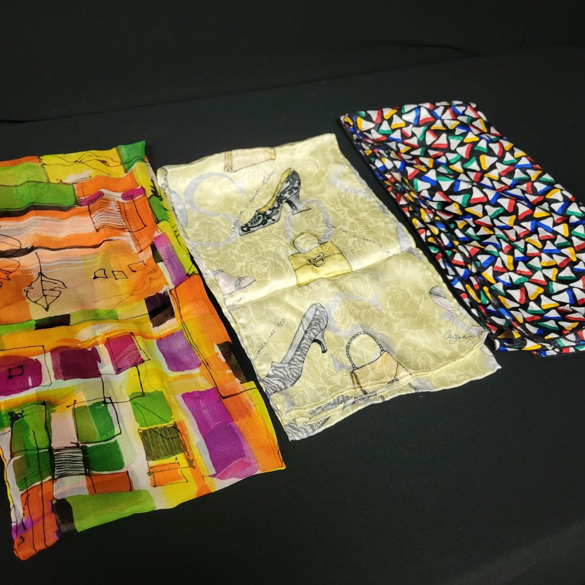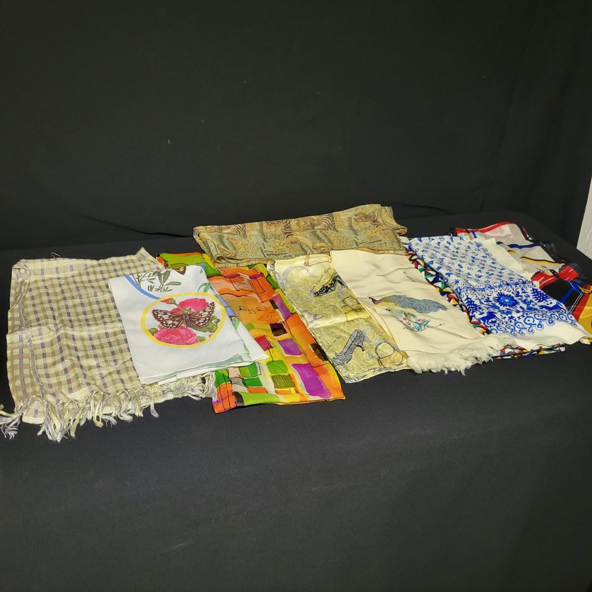 An assortment of 9 scarves in a variety of styles and materials. A majority are polyester, but there is also one that is linen and one that is Asian silk. Average size is 14" x 60" Shipping available