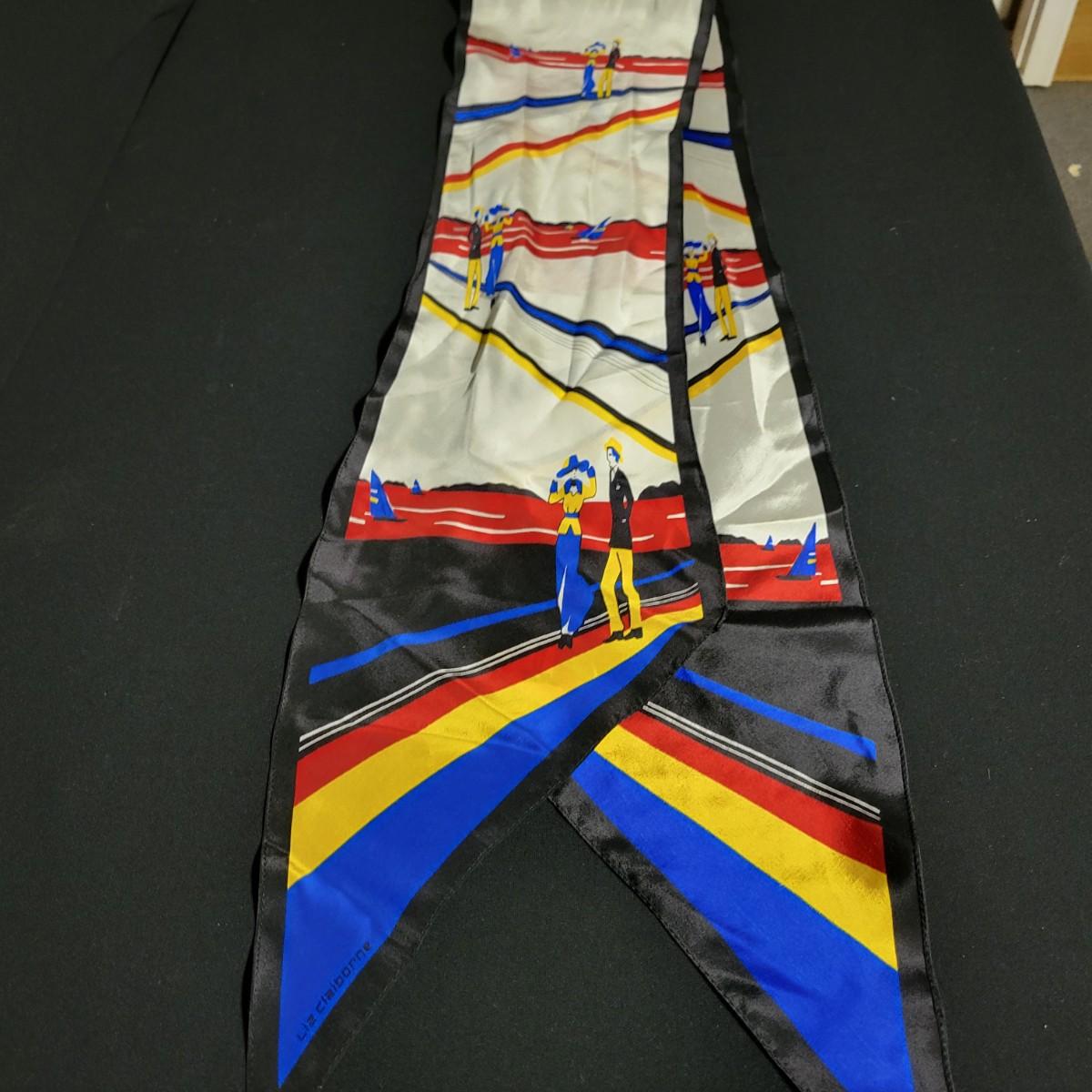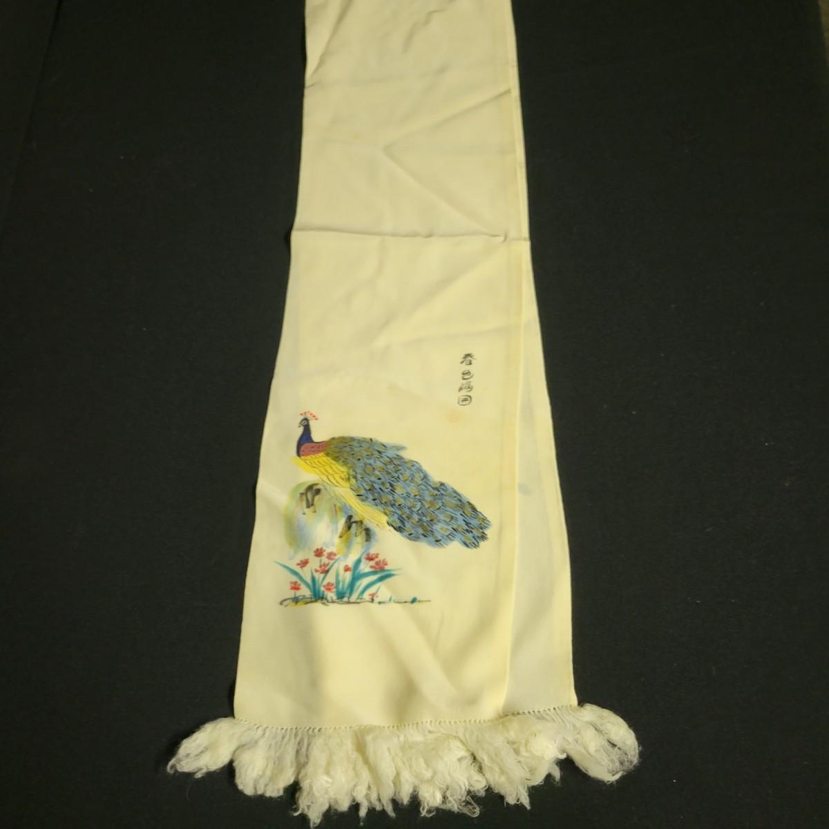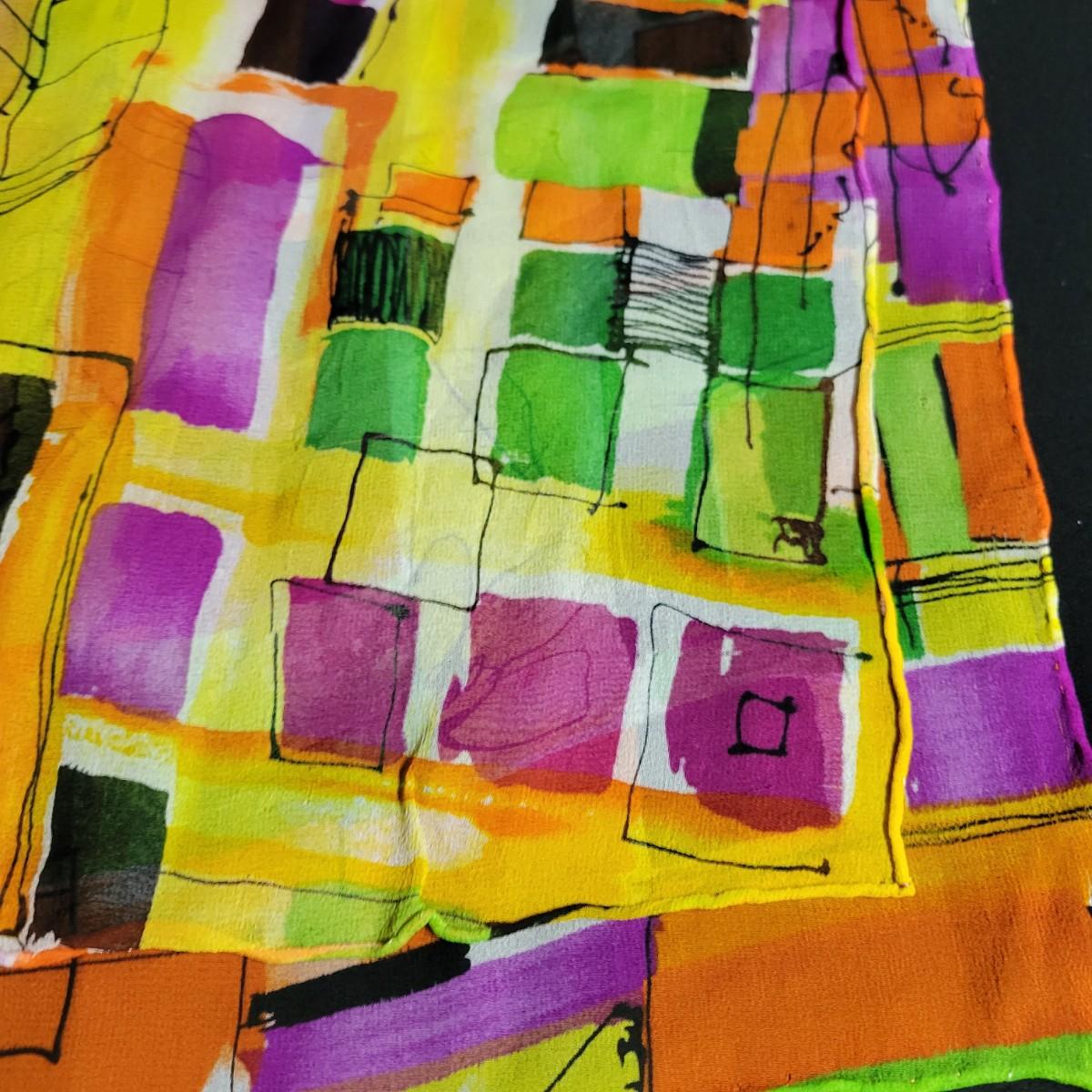 An assortment of 9 scarves in a variety of styles and materials. A majority are polyester, but there is also one that is linen and one that is Asian silk. Average size is 14" x 60" Shipping available