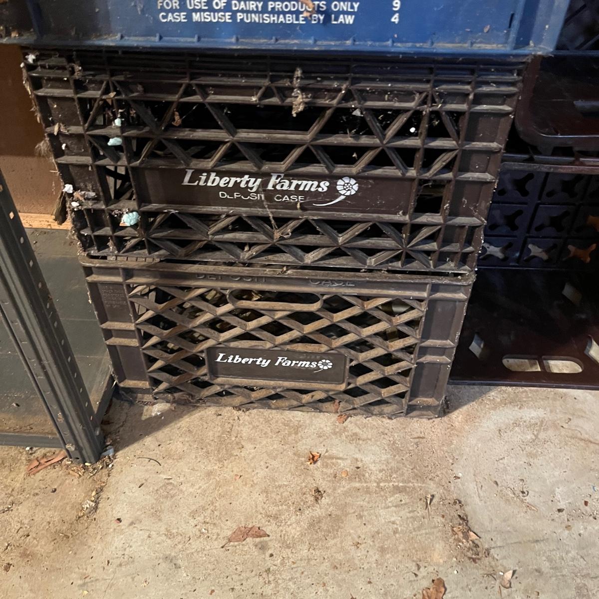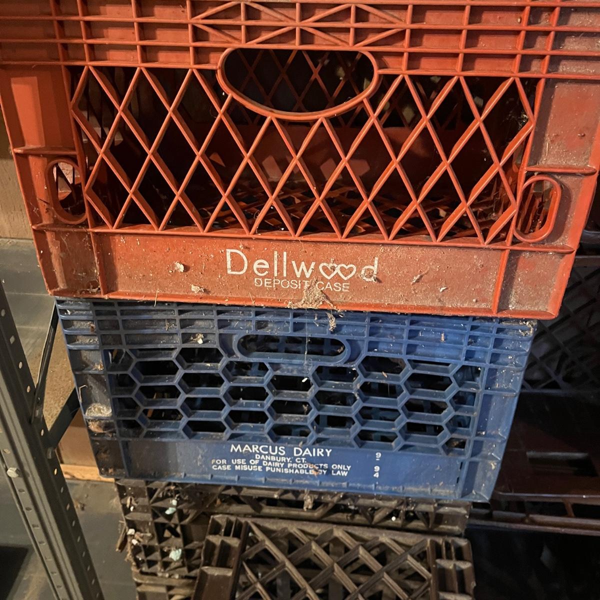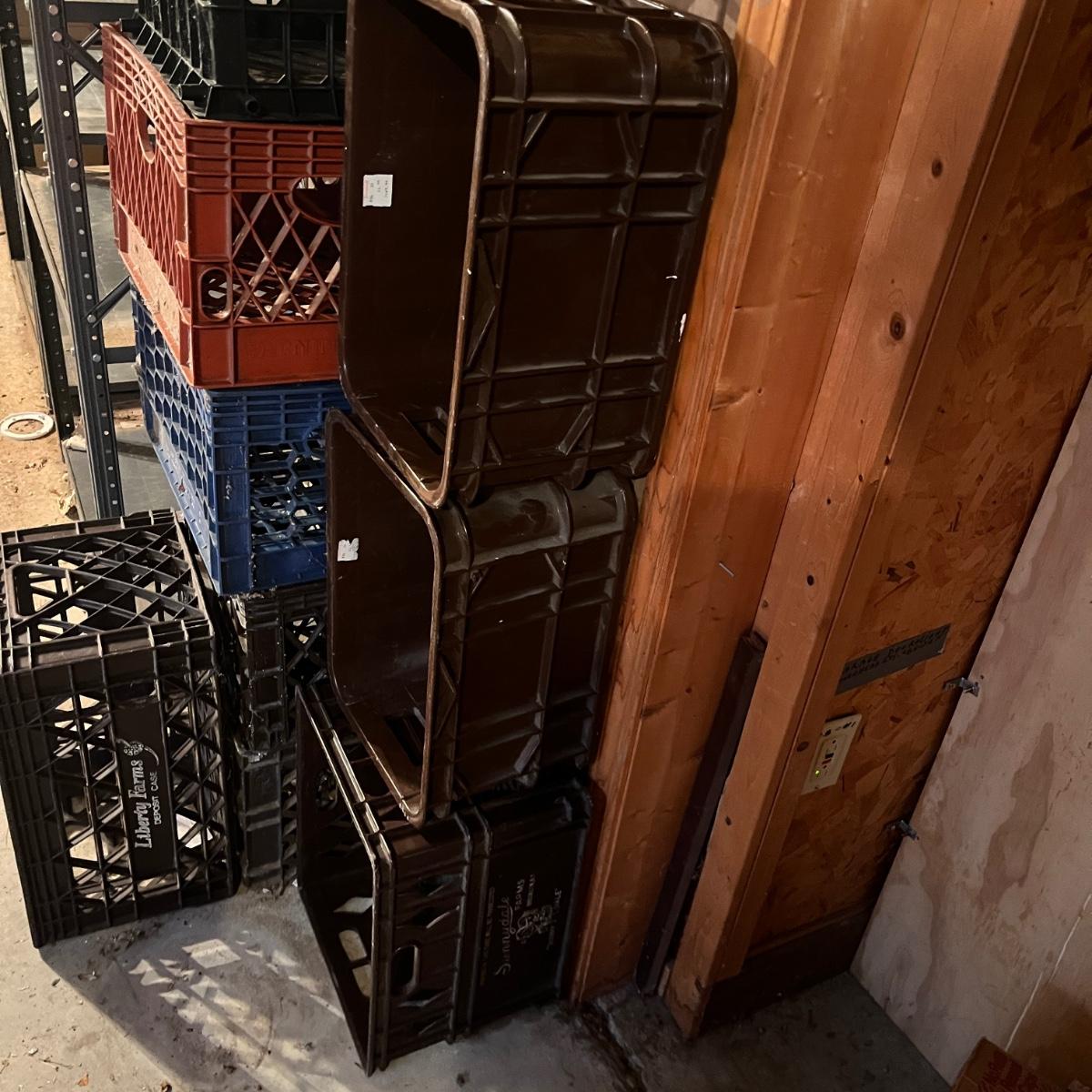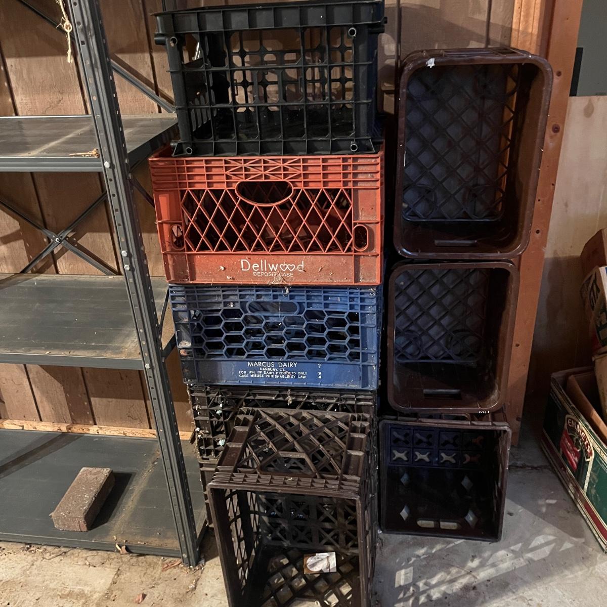 Lot includes nine milk crates in a variety of colors. Largest crate measures 13” x 19” 11”H.