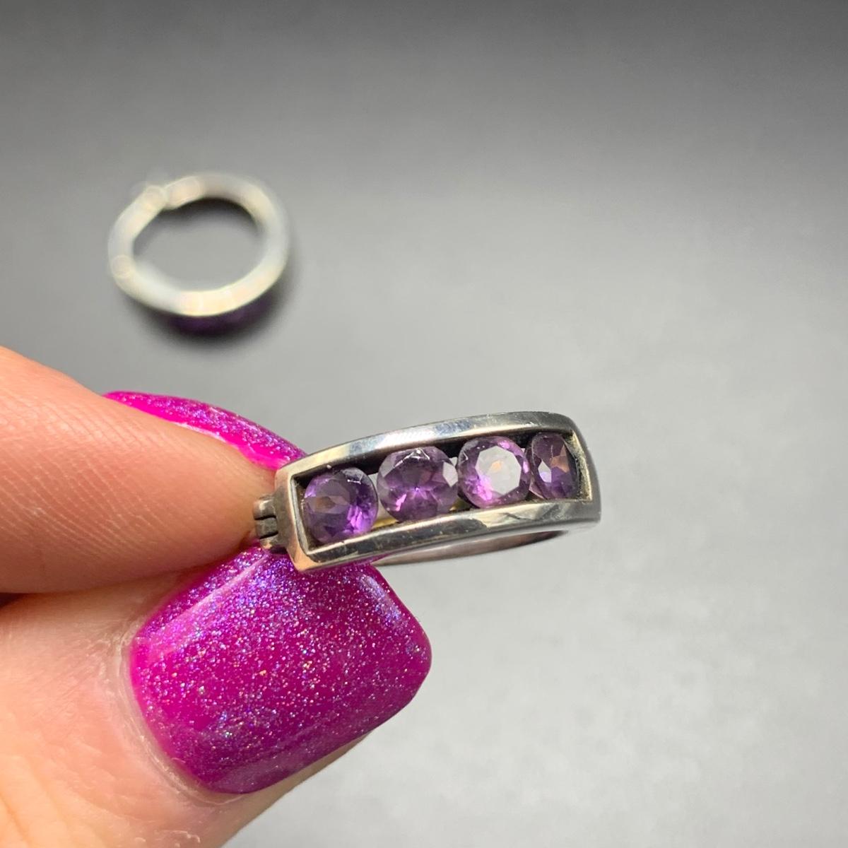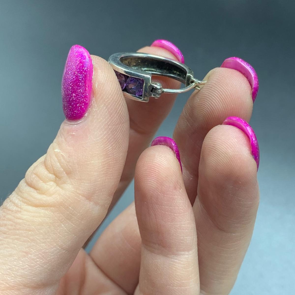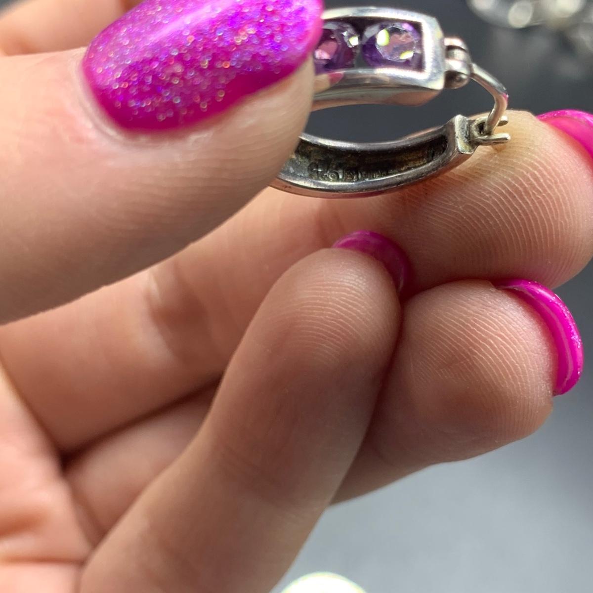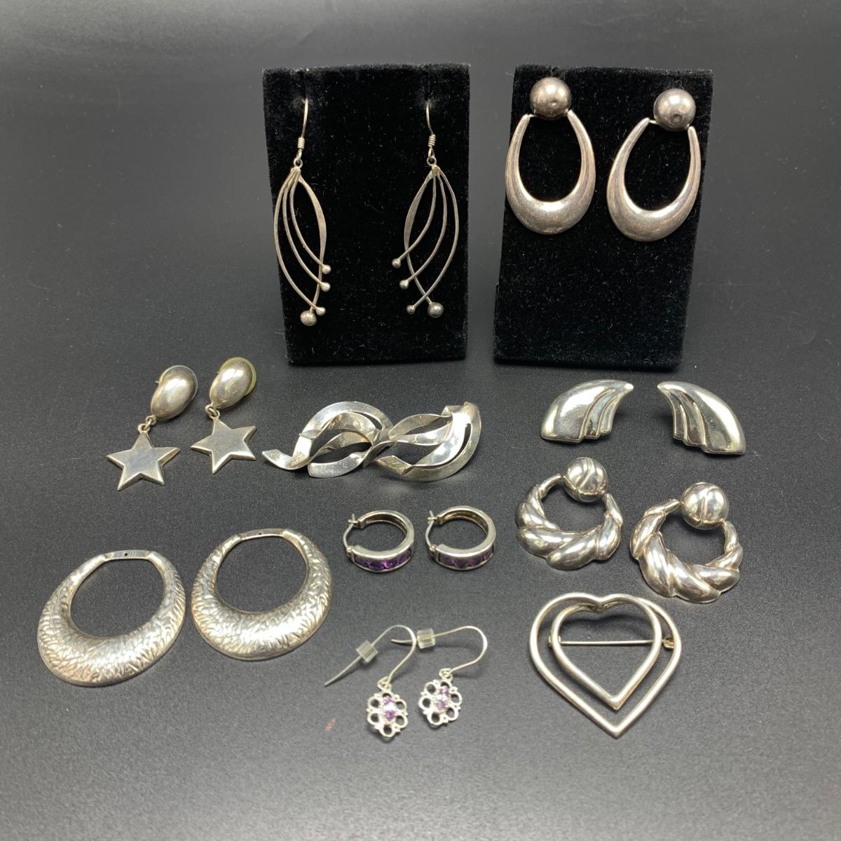 Nine pairs of Sterling silver earrings, some with stud backs and some with hooks. Two pairs need earring backs and one needs hooks. Also included is a heart shaped Sterling silver pin. Shipping available.