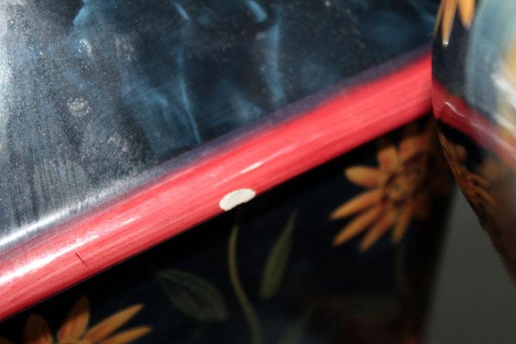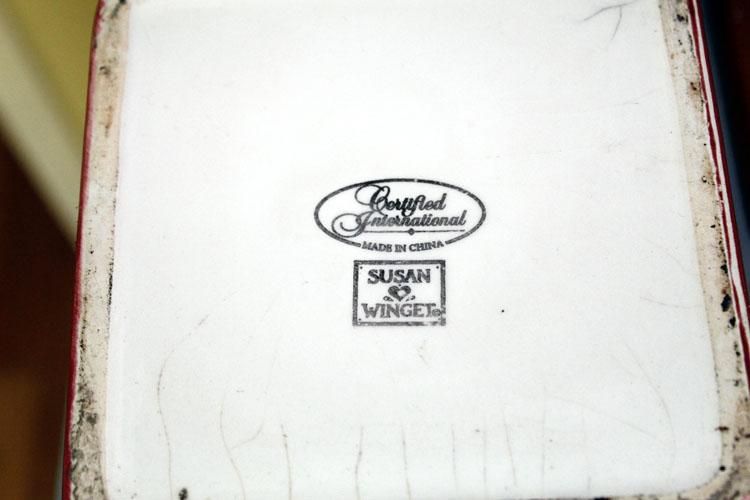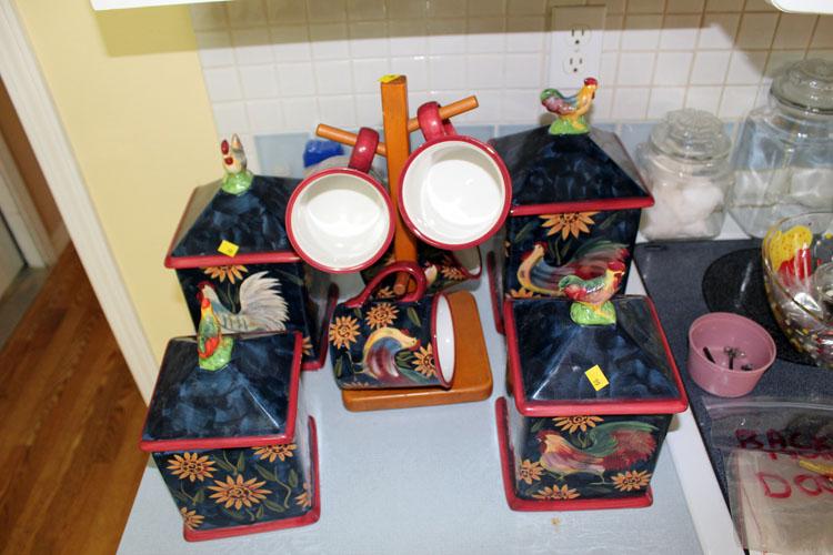 Nine piece Susan Winget rooster theme canister set, sugar lid is chipped