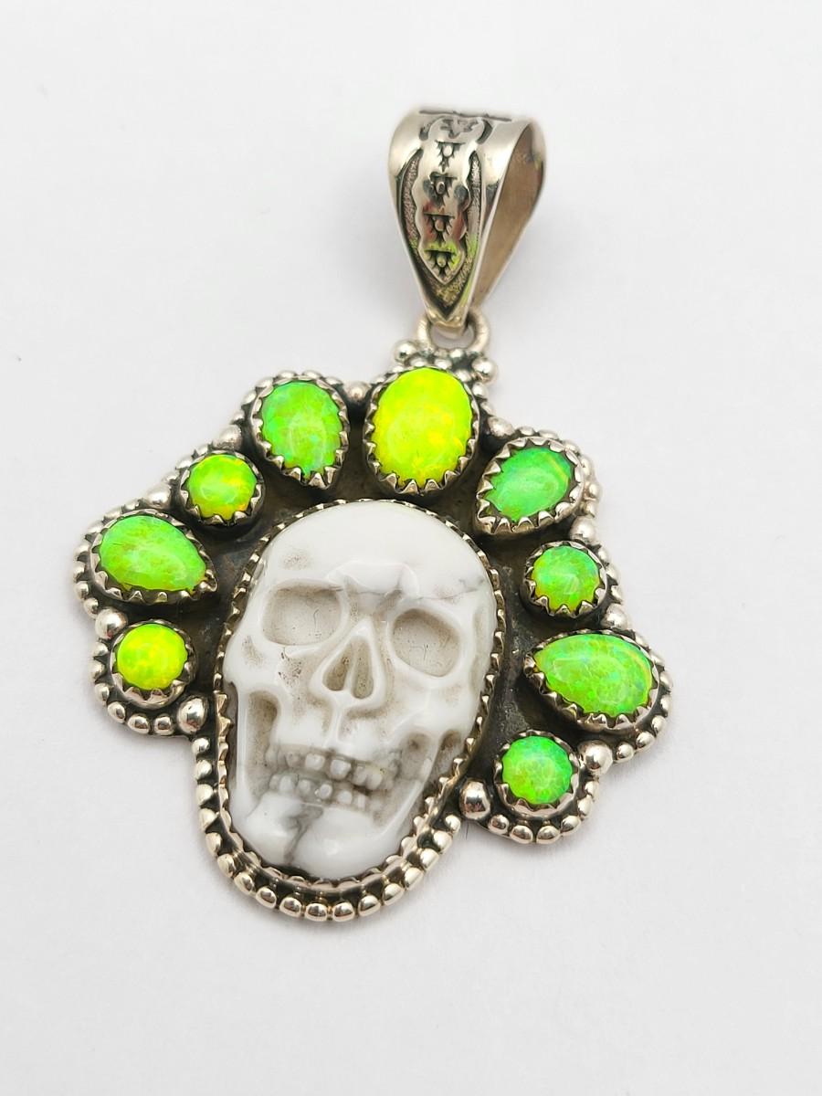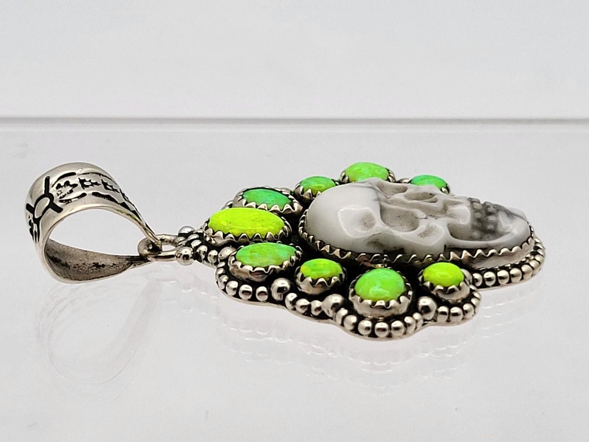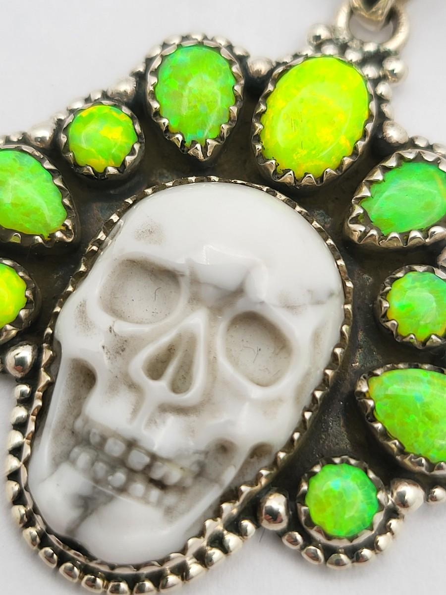Bright fire opal crown and stone carved skull (White Buffalo)? Set in 925 sterling silver. Measures 2" long x 1.5" wide. Total weight 14.3 grams.