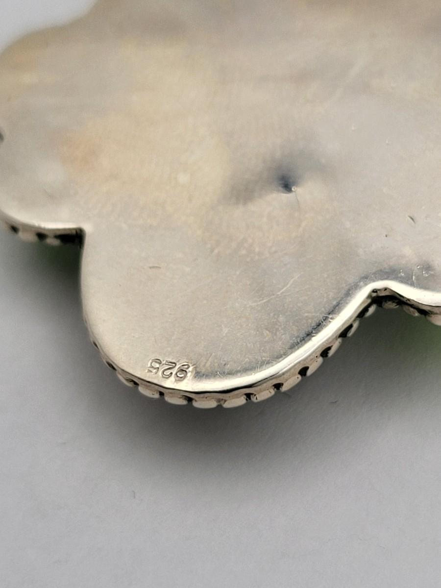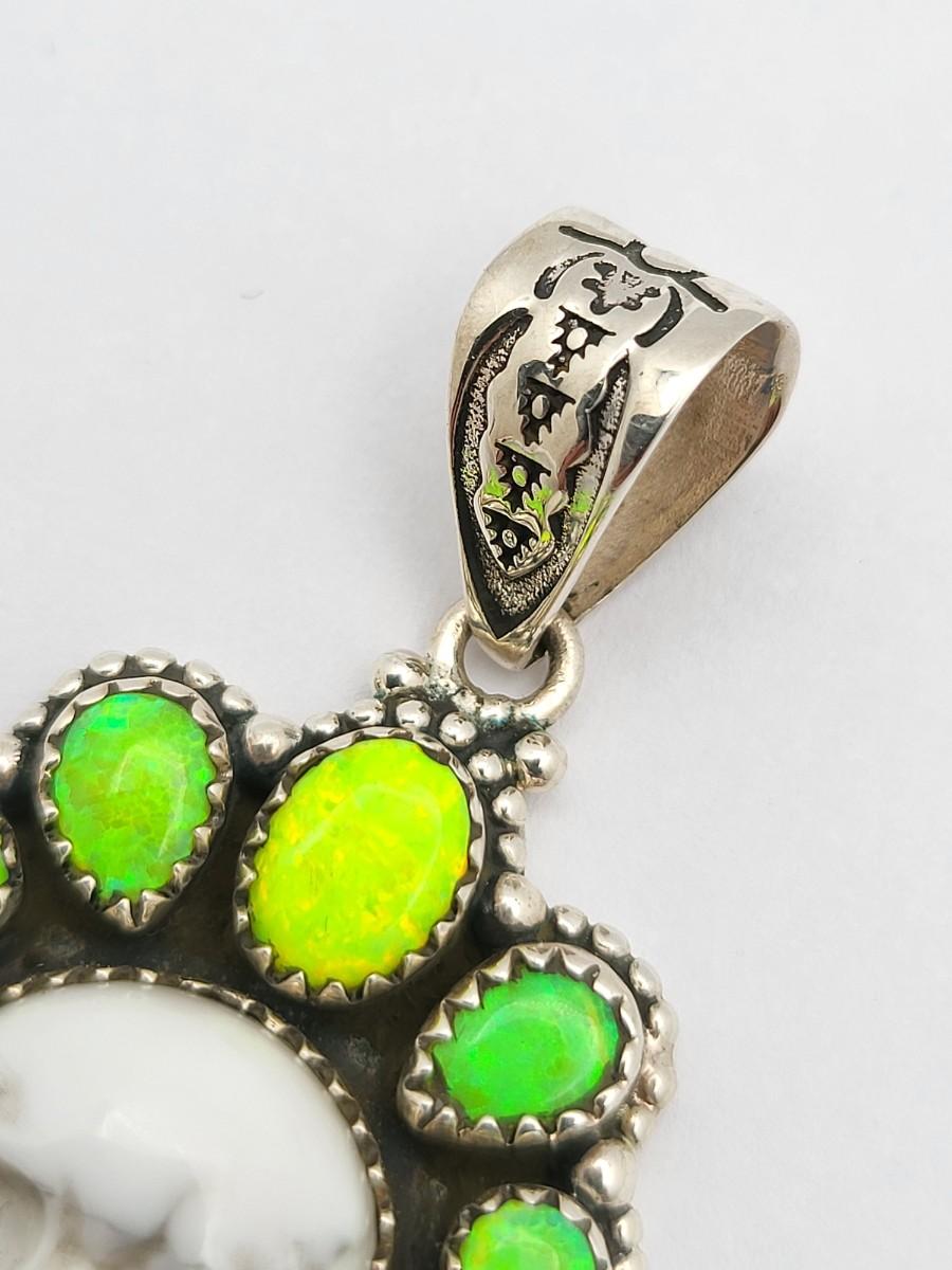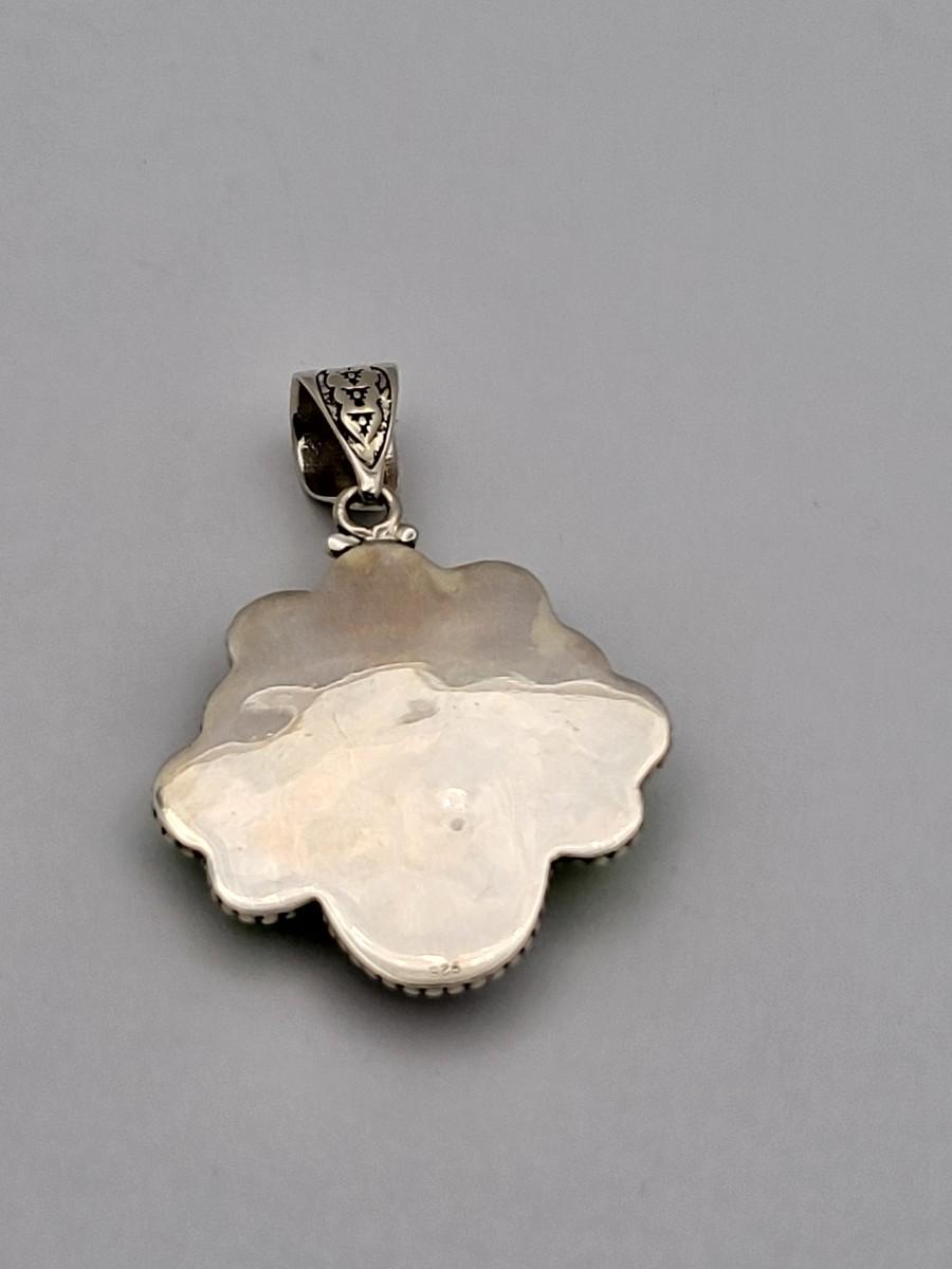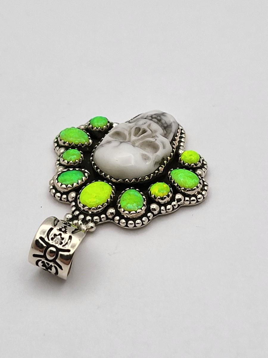 Bright fire opal crown and stone carved skull (White Buffalo)? Set in 925 sterling silver. Measures 2" long x 1.5" wide. Total weight 14.3 grams.