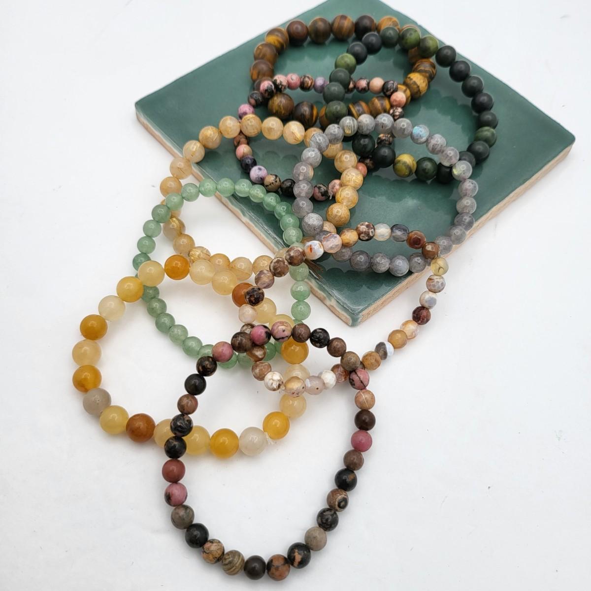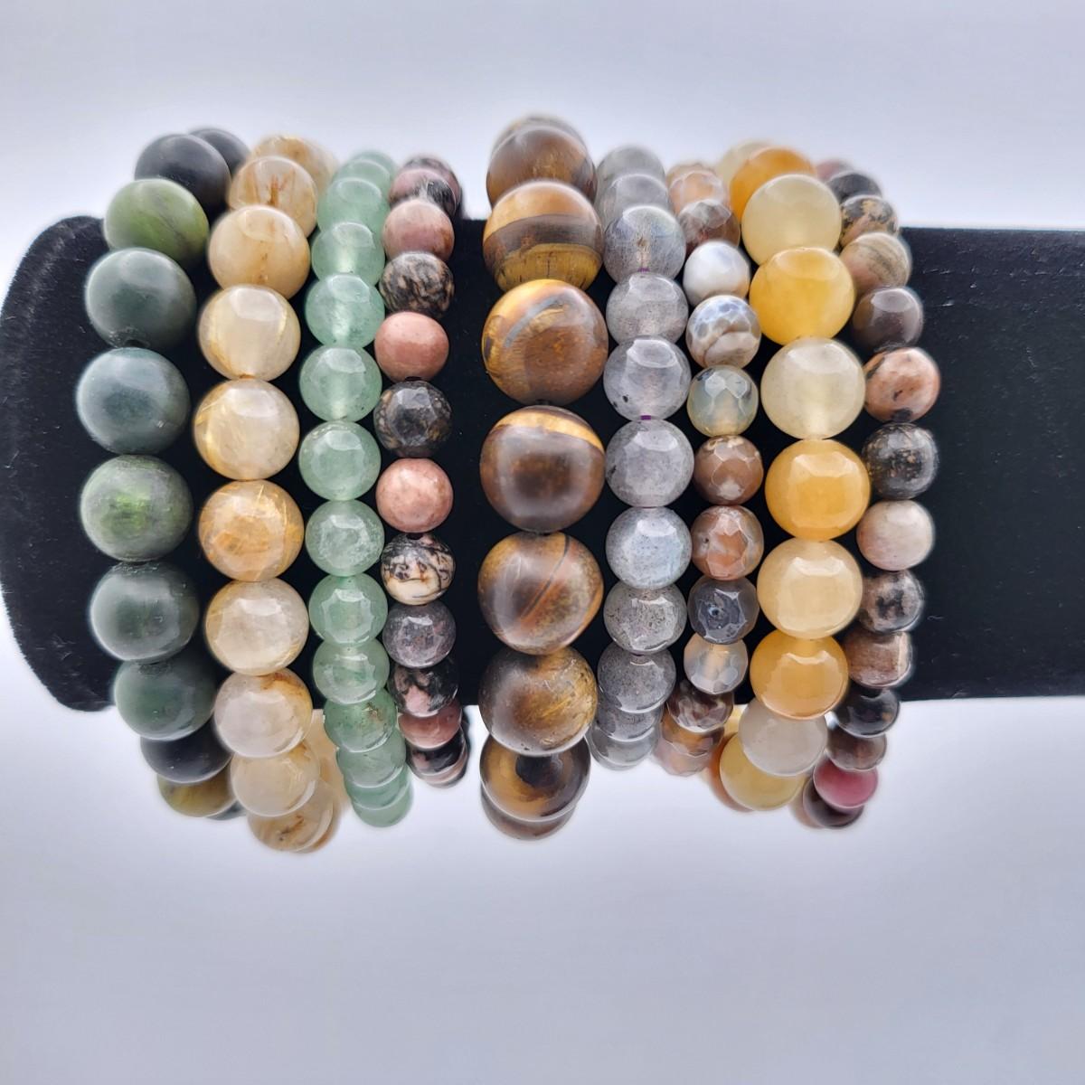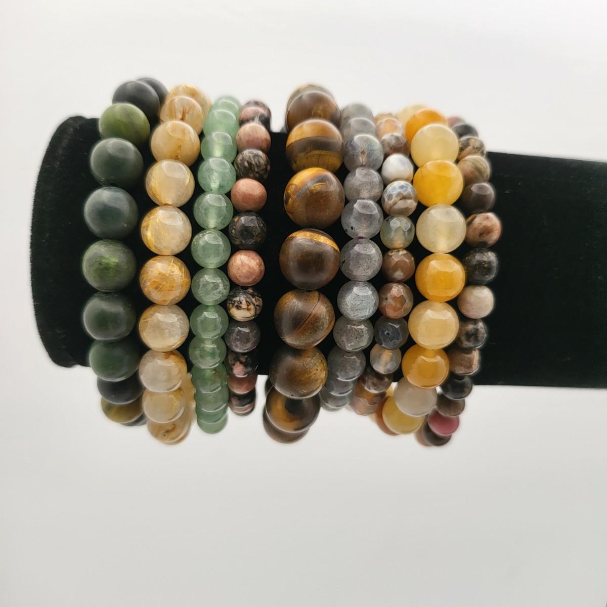 Various size bead and type of stones stretch bracelets. You will receive nine bracelets.