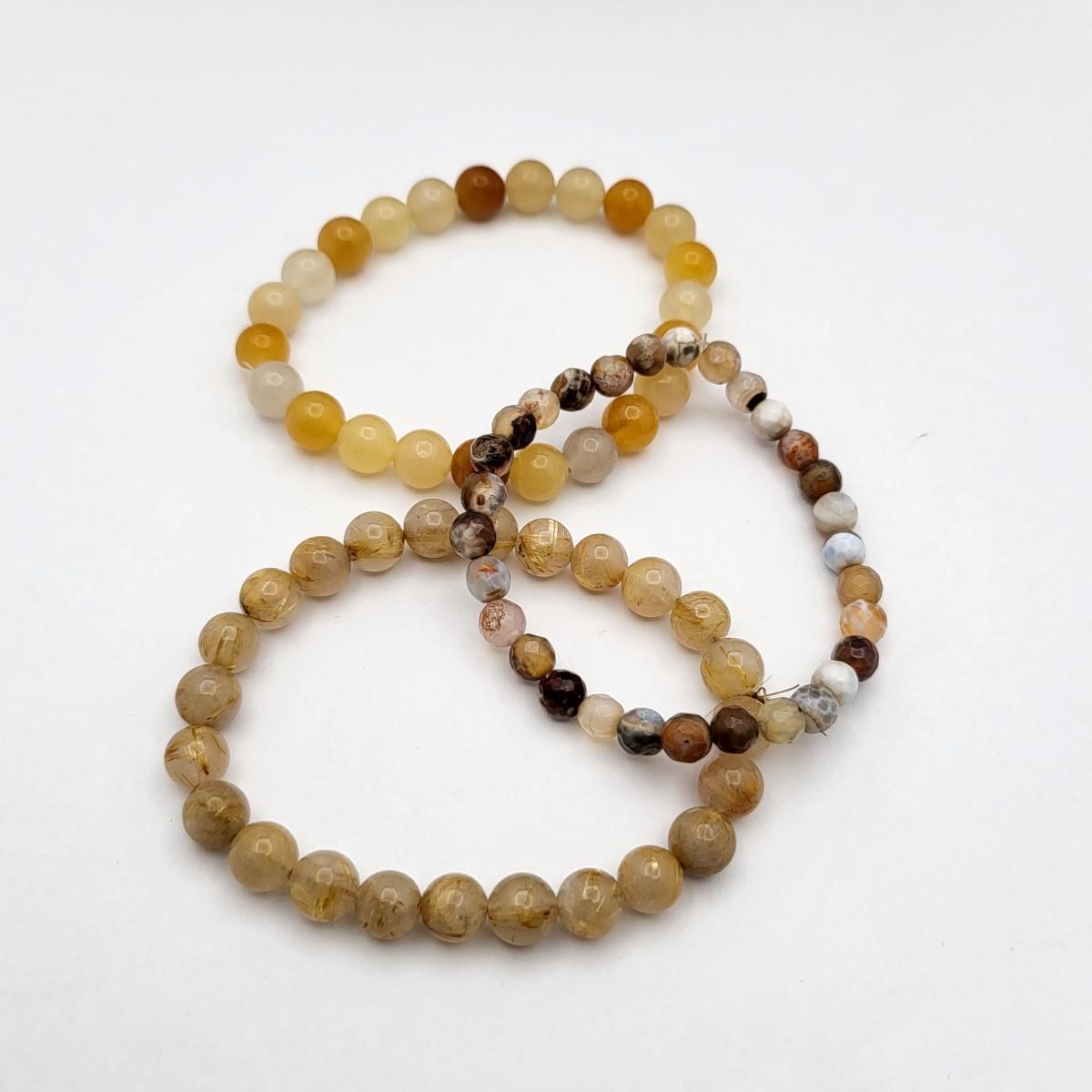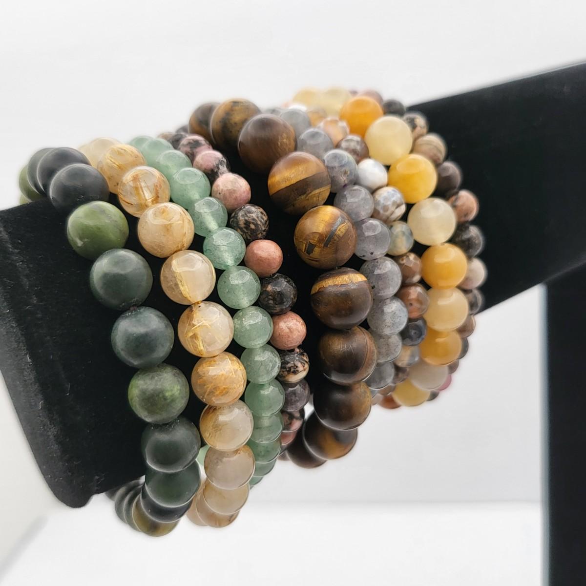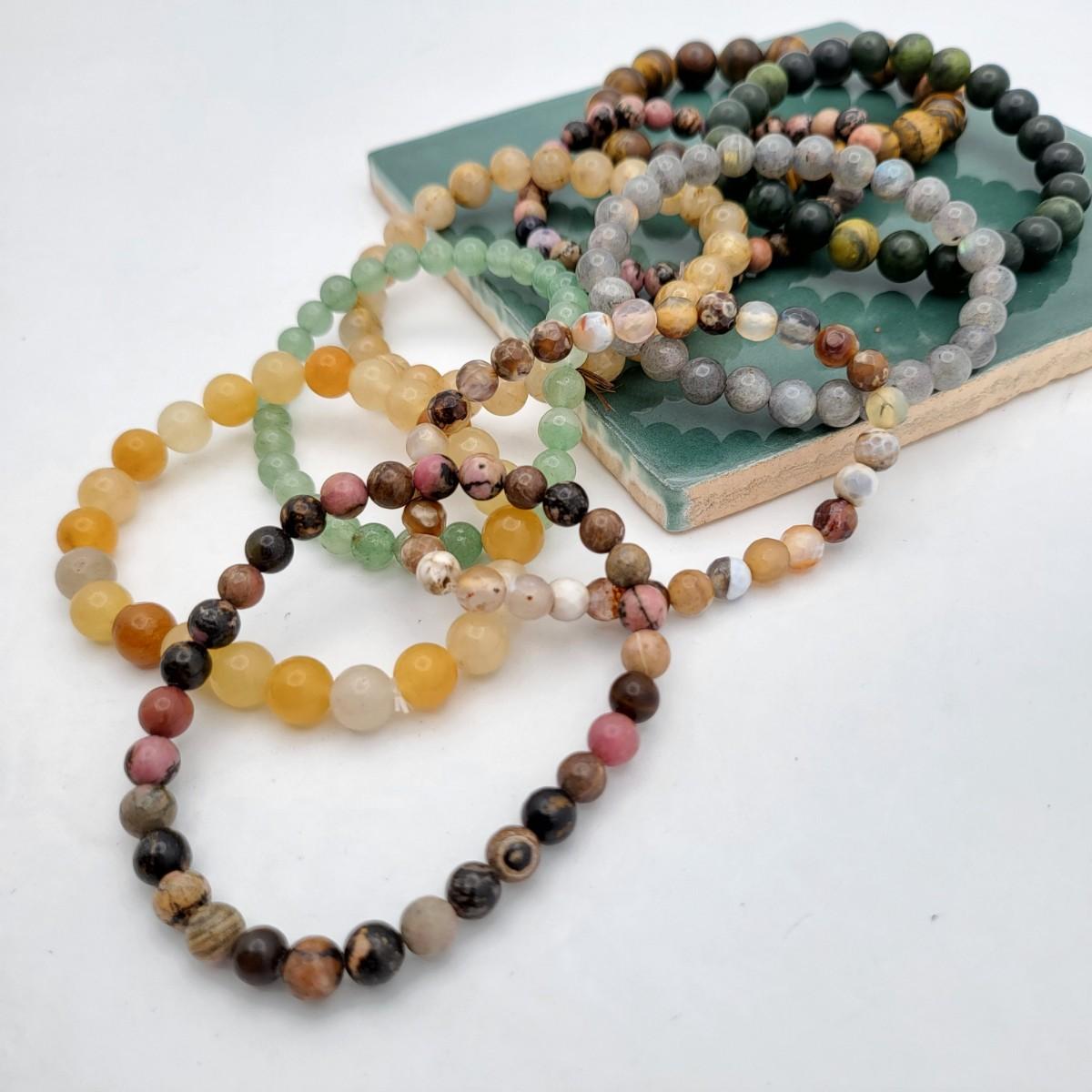 Various size bead and type of stones stretch bracelets. You will receive nine bracelets.