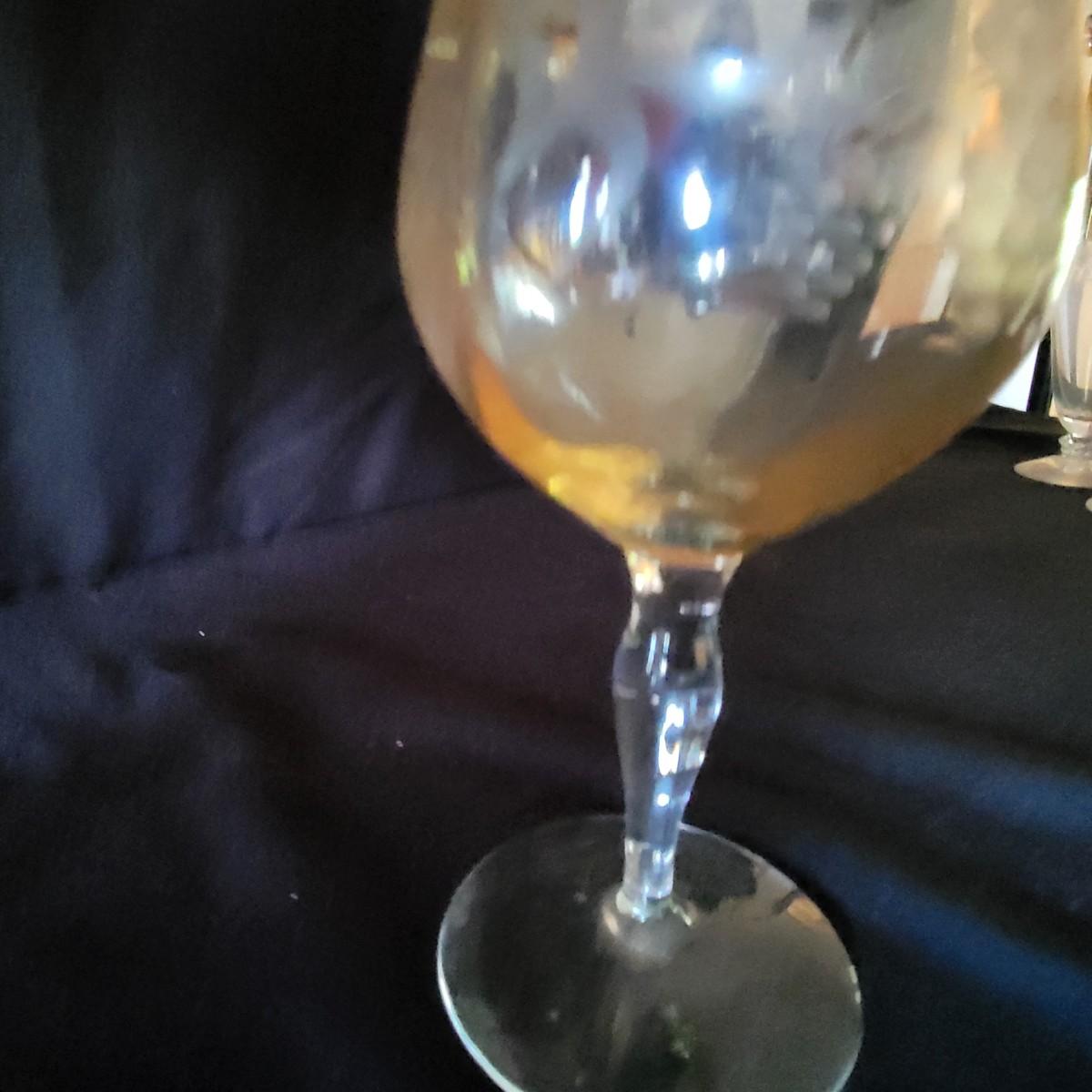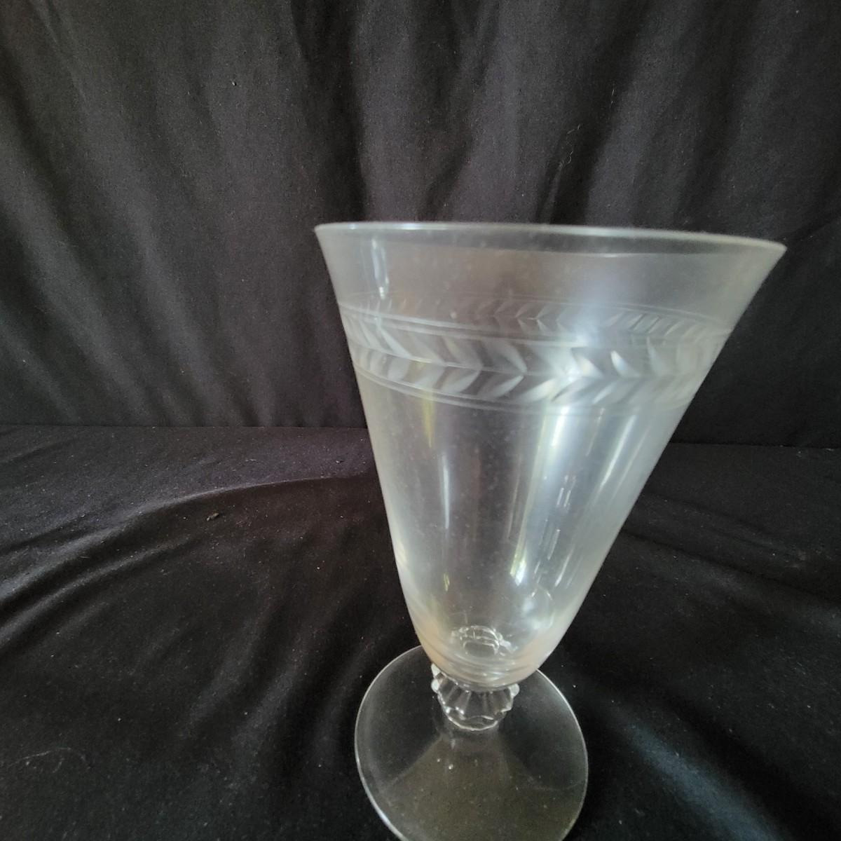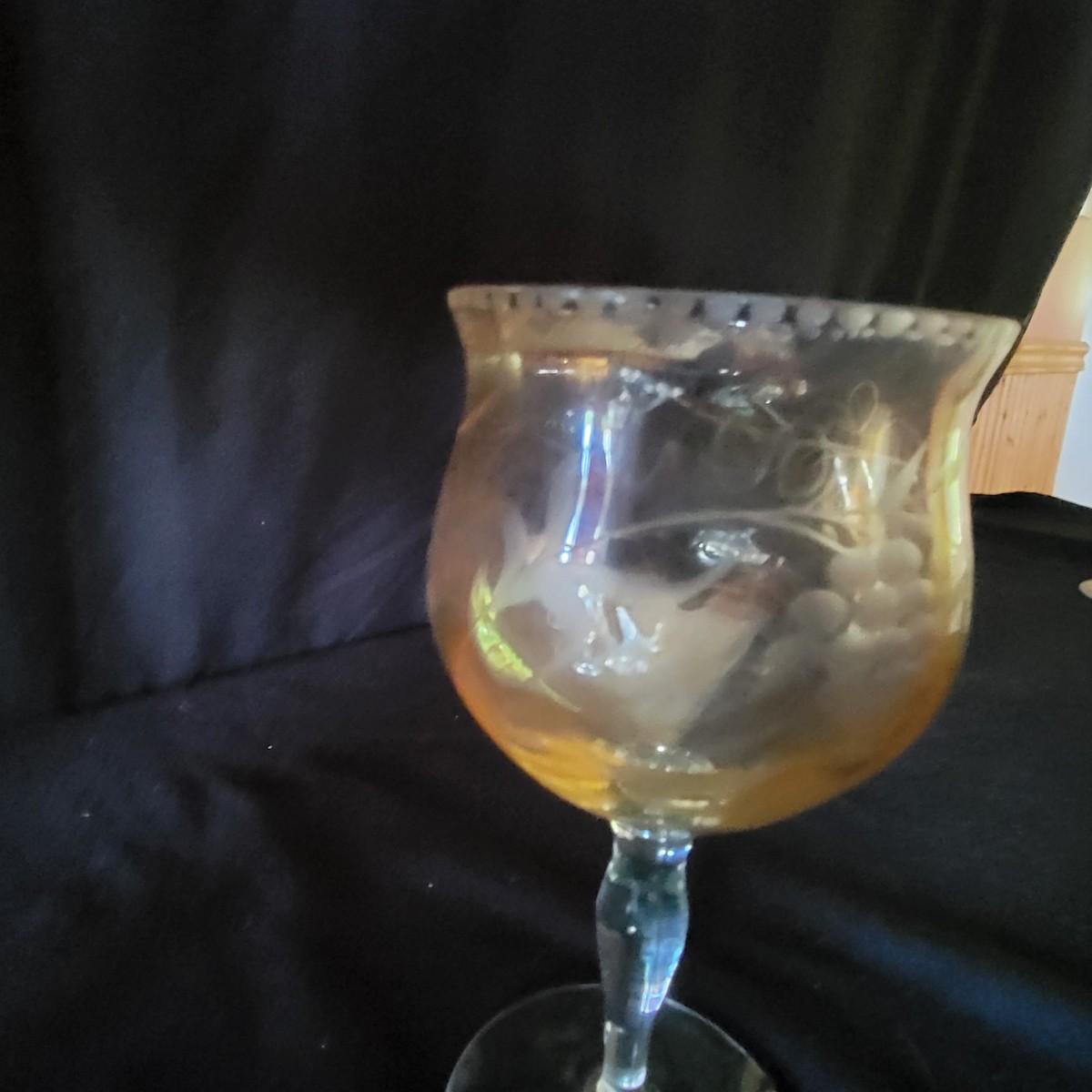 Two wine glasses with a subtle orange hue and grapevine motif.