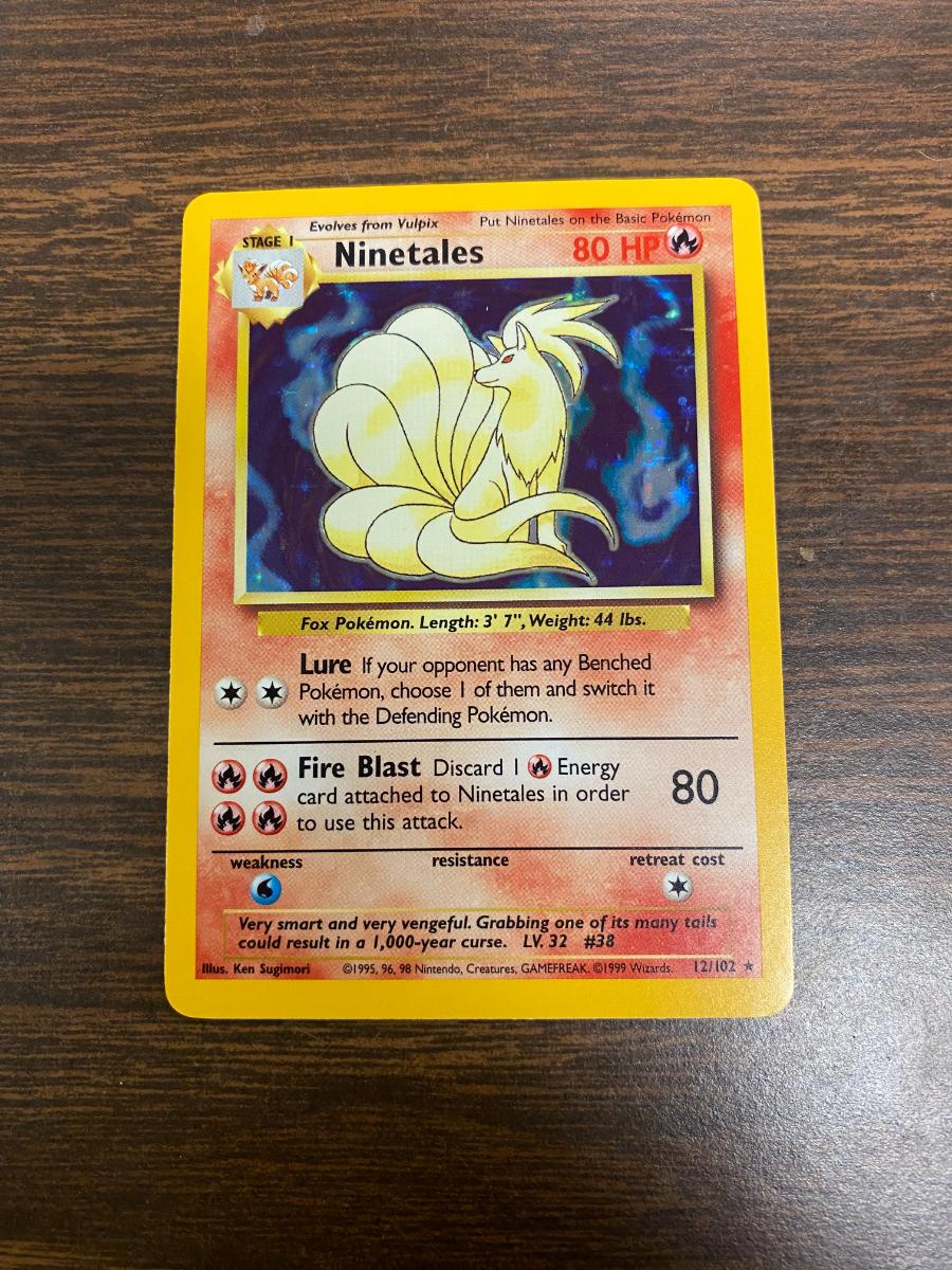 This is a Ninetales Holo card from the Pokémon Base Set released in 1999. The card displays a holographic effect and has an HP of 80. Its moves include Lure and Fire Blast, with energy requirements detailed on the card. The card is marked with number 12/102. Condition is specified as light play, showing minor wear consistent with handling. Back of the card shows typical wear associated with light play.
