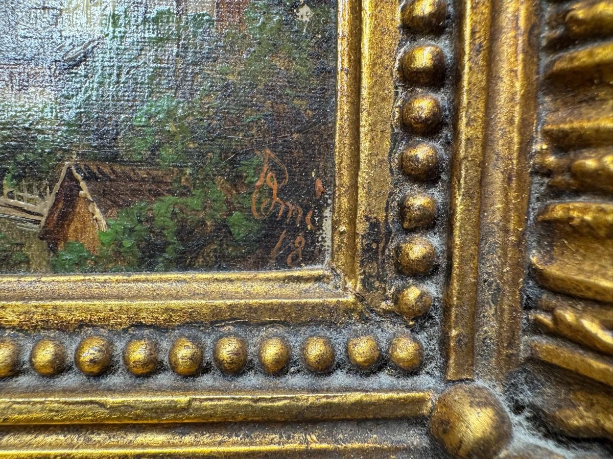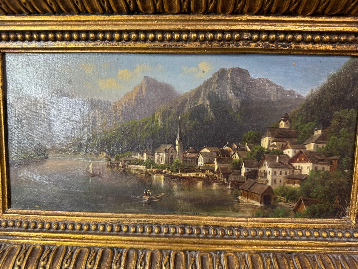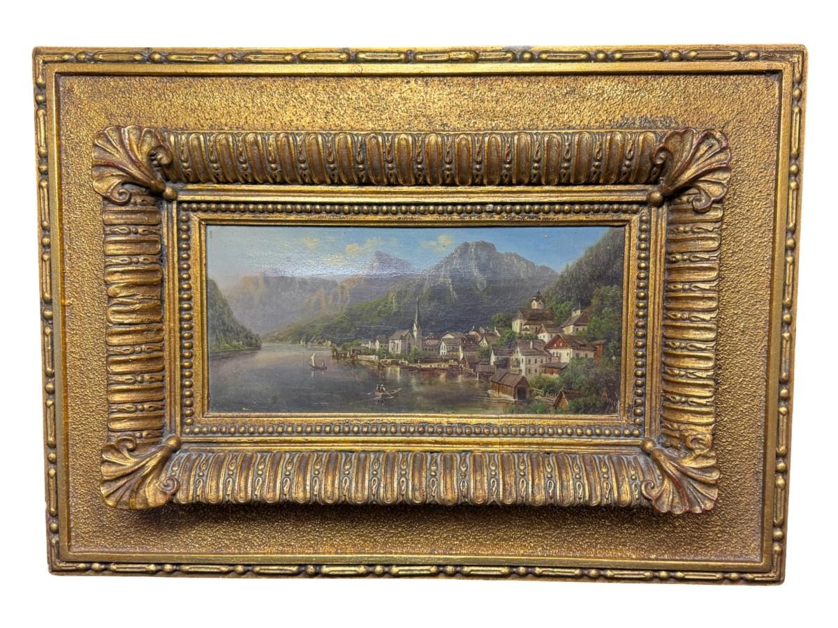 In the manner of Lepie or Jankowsky, this 19th century piece depicts the picturesque village of Hallstatt, Austria. The piece has craquelure, commensurate with age. The artist signature is illegible due to the frame. The frame is 19th century. Measurement: 21”W x 15”H. [JP]
