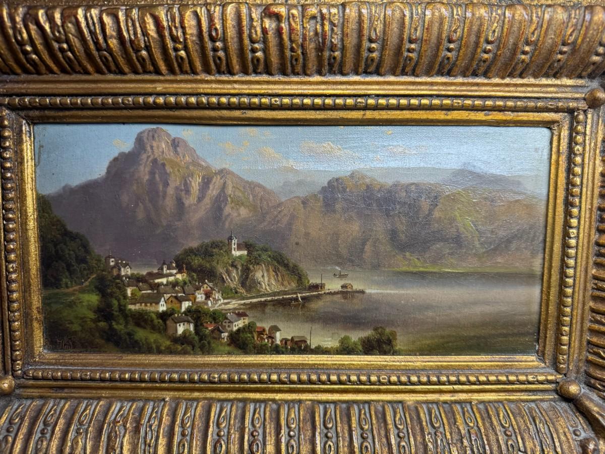 In the manner of Lepie or Jankowsky, this 19th century piece depicts the picturesque village of Hallstatt, Austria. The piece has craquelure, commensurate with age. The artist signature is illegible due to the frame. The frame is 19th century. Measurement: 21”W x 15”H. [JP]