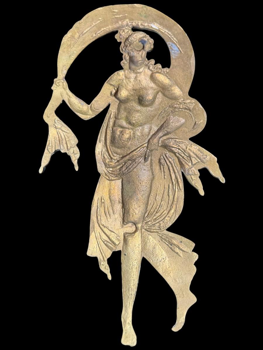 This avant garde wall plaque is a classic example of flowing lines seen during this period. There is age related wear, including patina. Measurement: 13”L x 7”W. [JP]