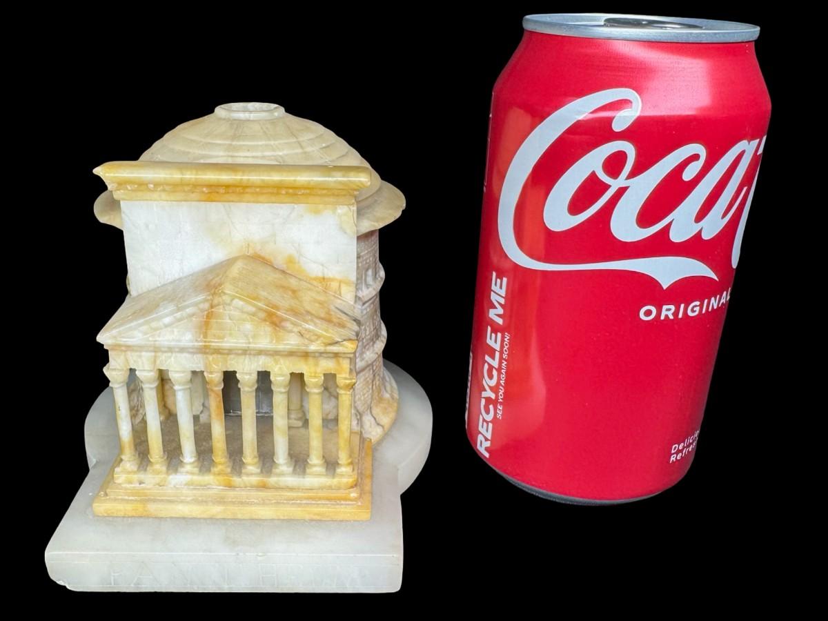 This piece was most likely purchased as a keepsake of the “Grand Tour” in Europe in the late 19th century, while visiting Rome. It is made entirely of alabaster. There is minor chipping or flea bites along the dome. Measurement: 5”W x 4”H. [JP]